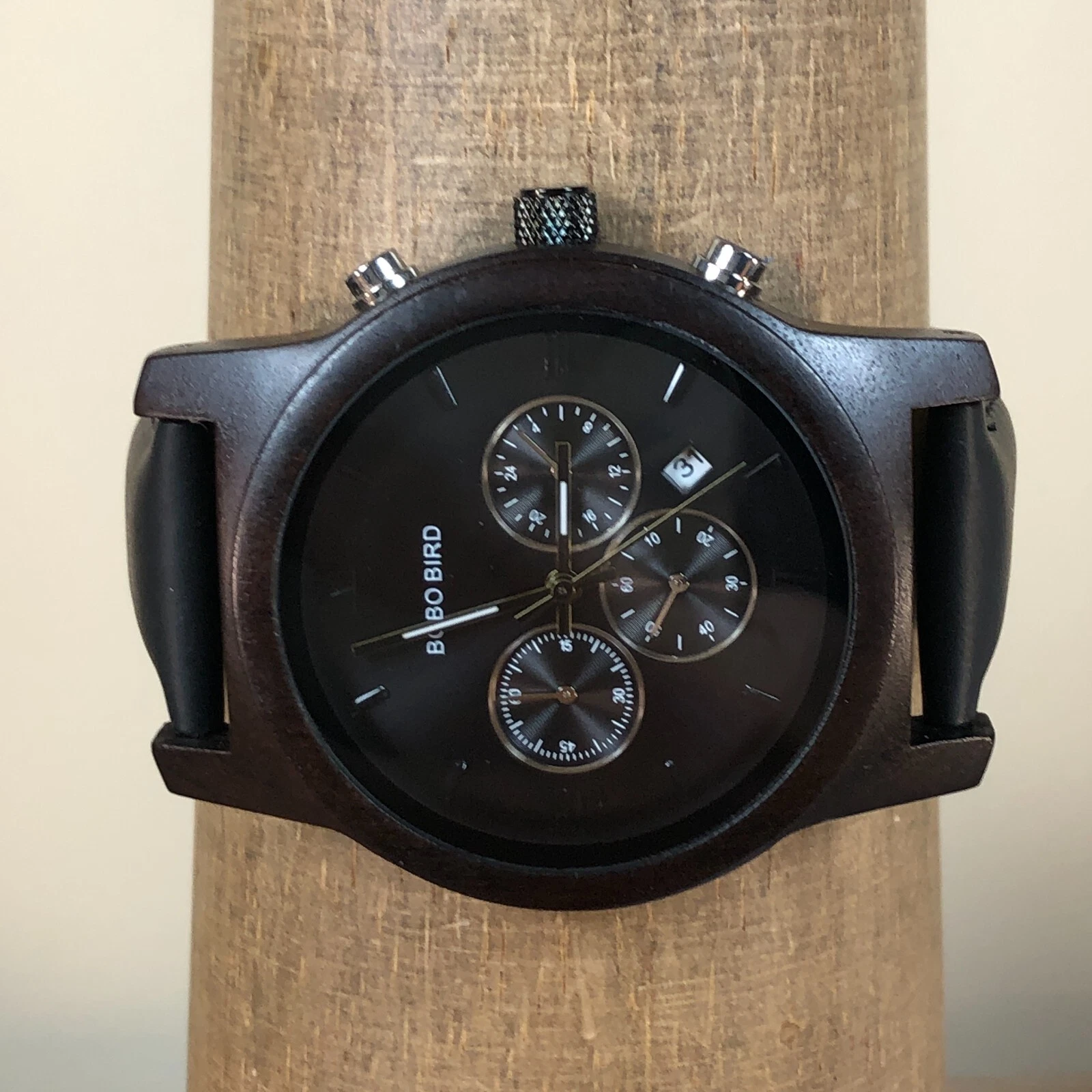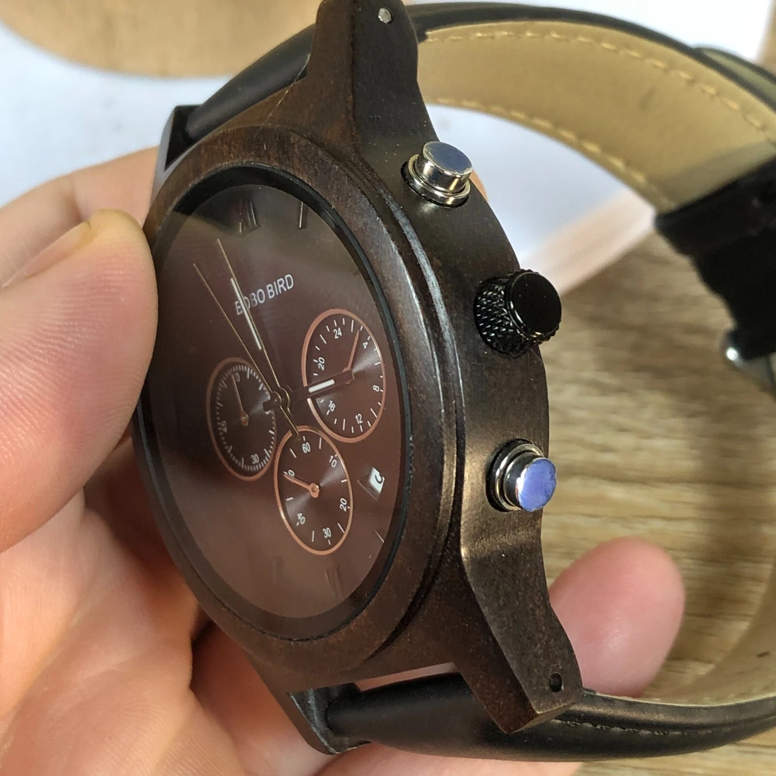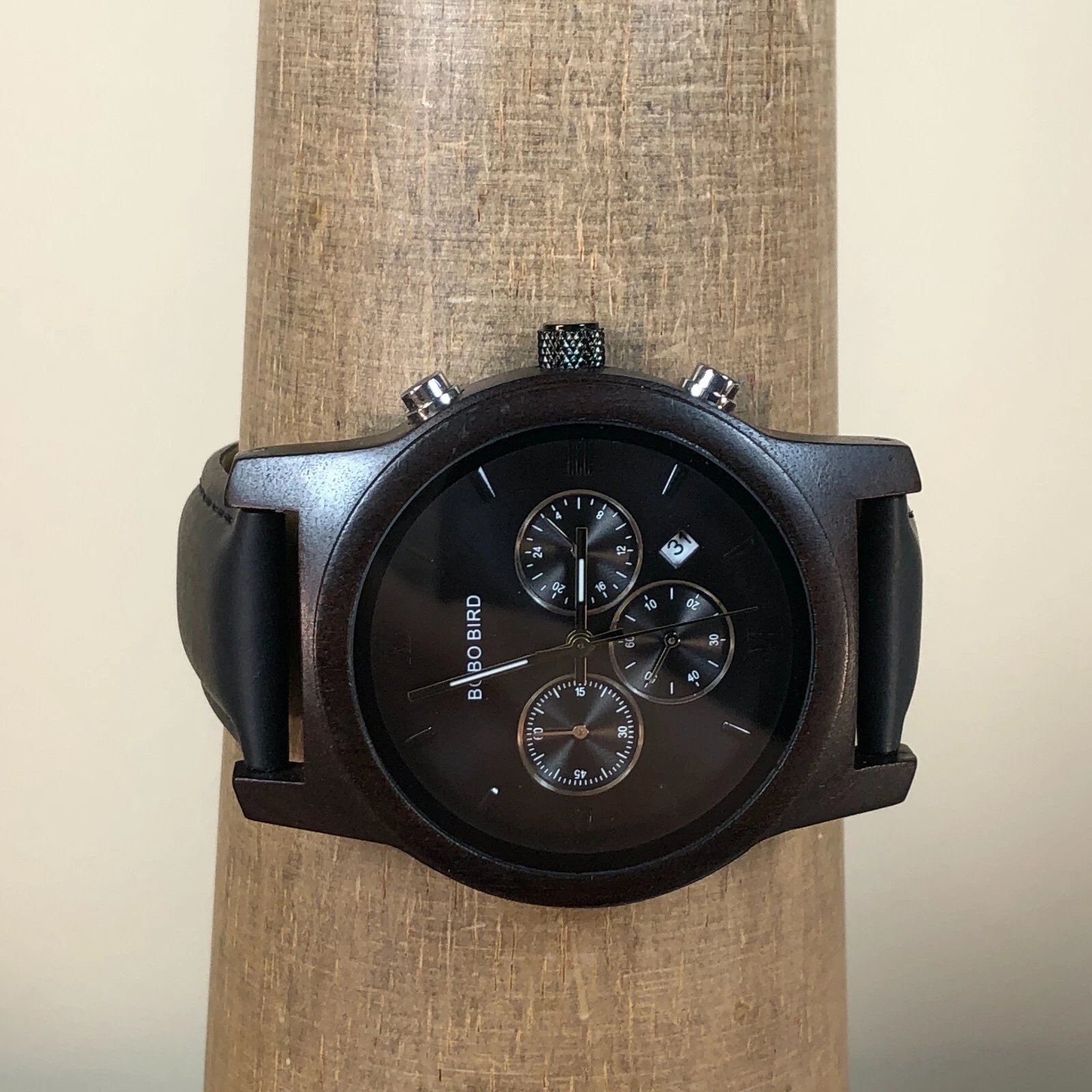 BOBO BIRD Men Black Dial Chronograph Black Leather Strap Quartz Wooden Watch 8