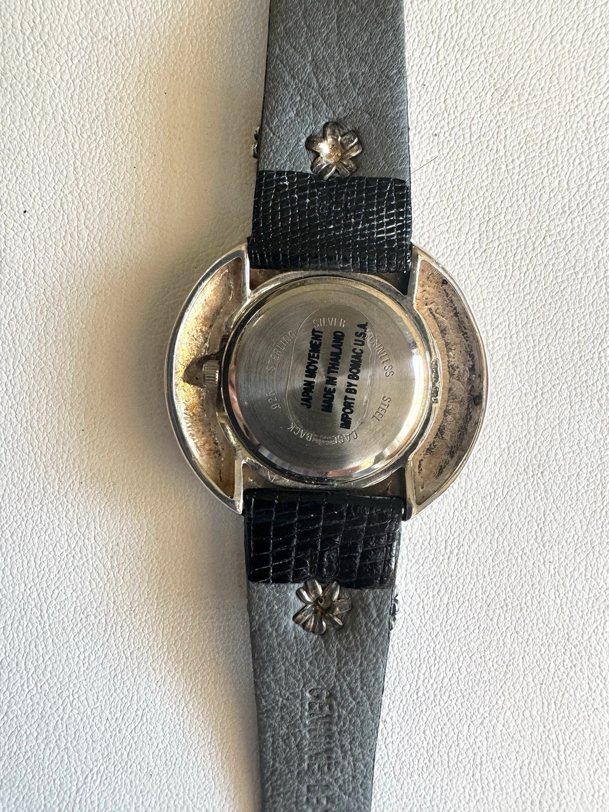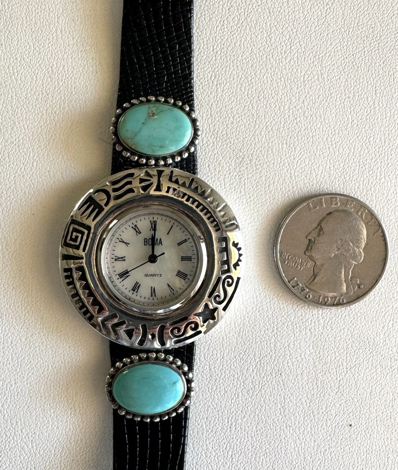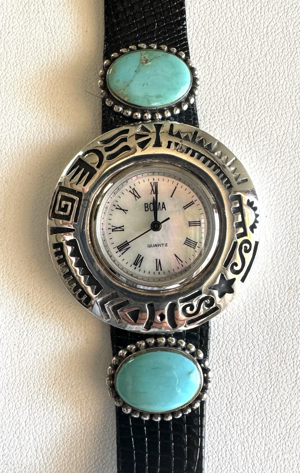 Sterling Silver Turquoise Southwest BOMA Watch 925 Black Leather 8” Strap