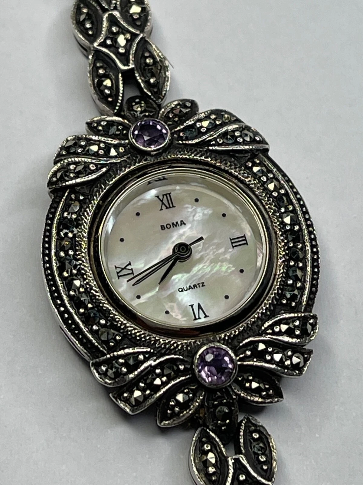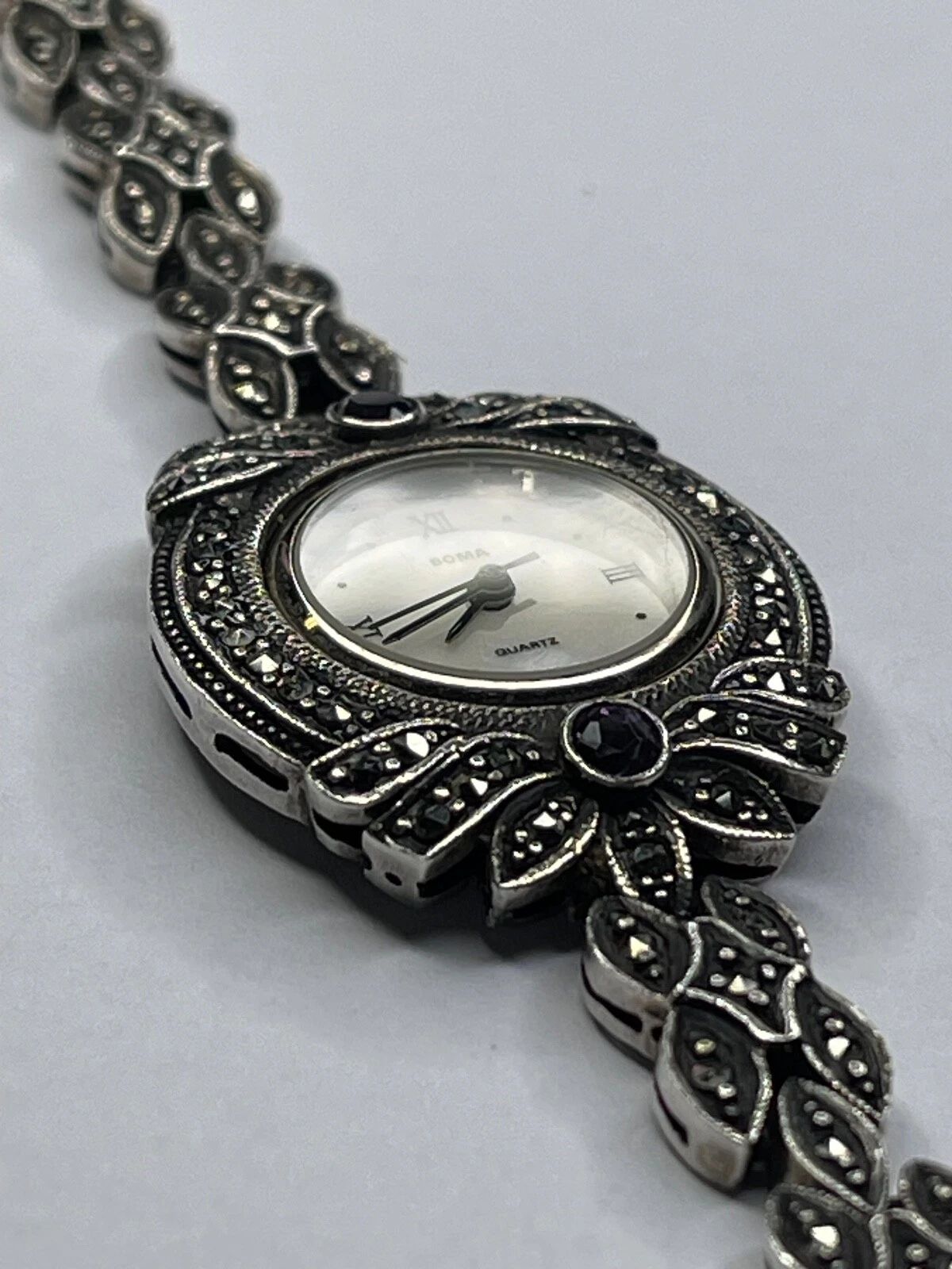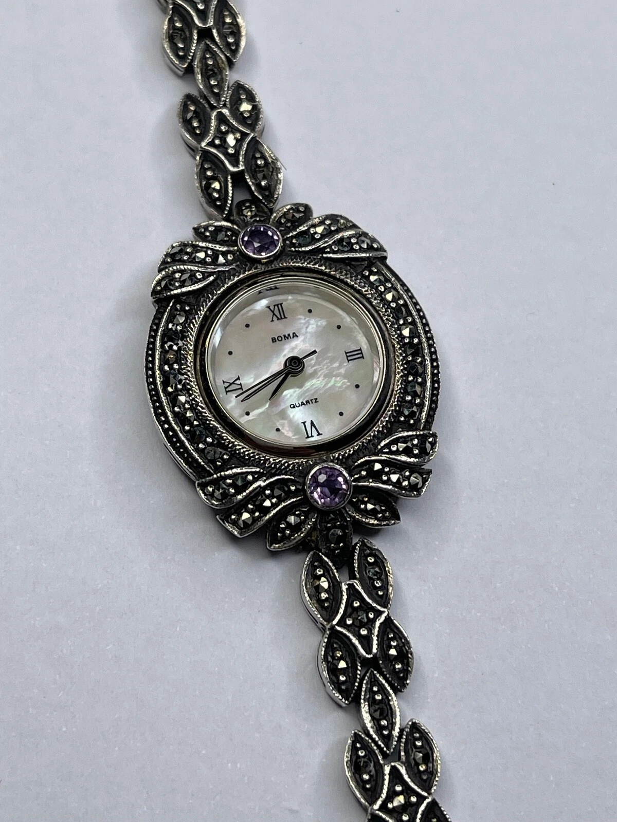 BOMA Sterling Silver Marcasite & Amethyst Ladies Quartz Watch (27.9 grams)