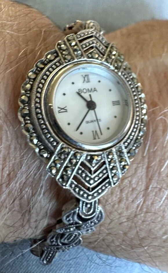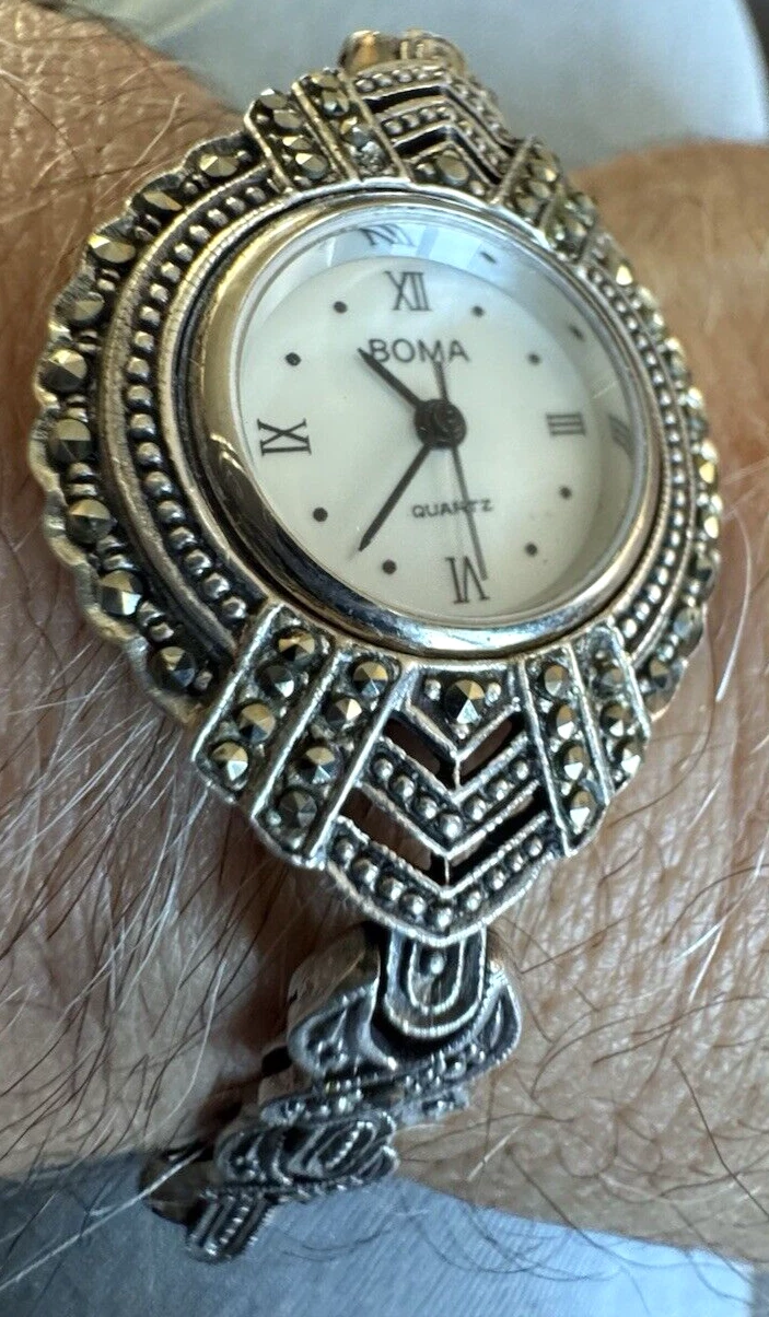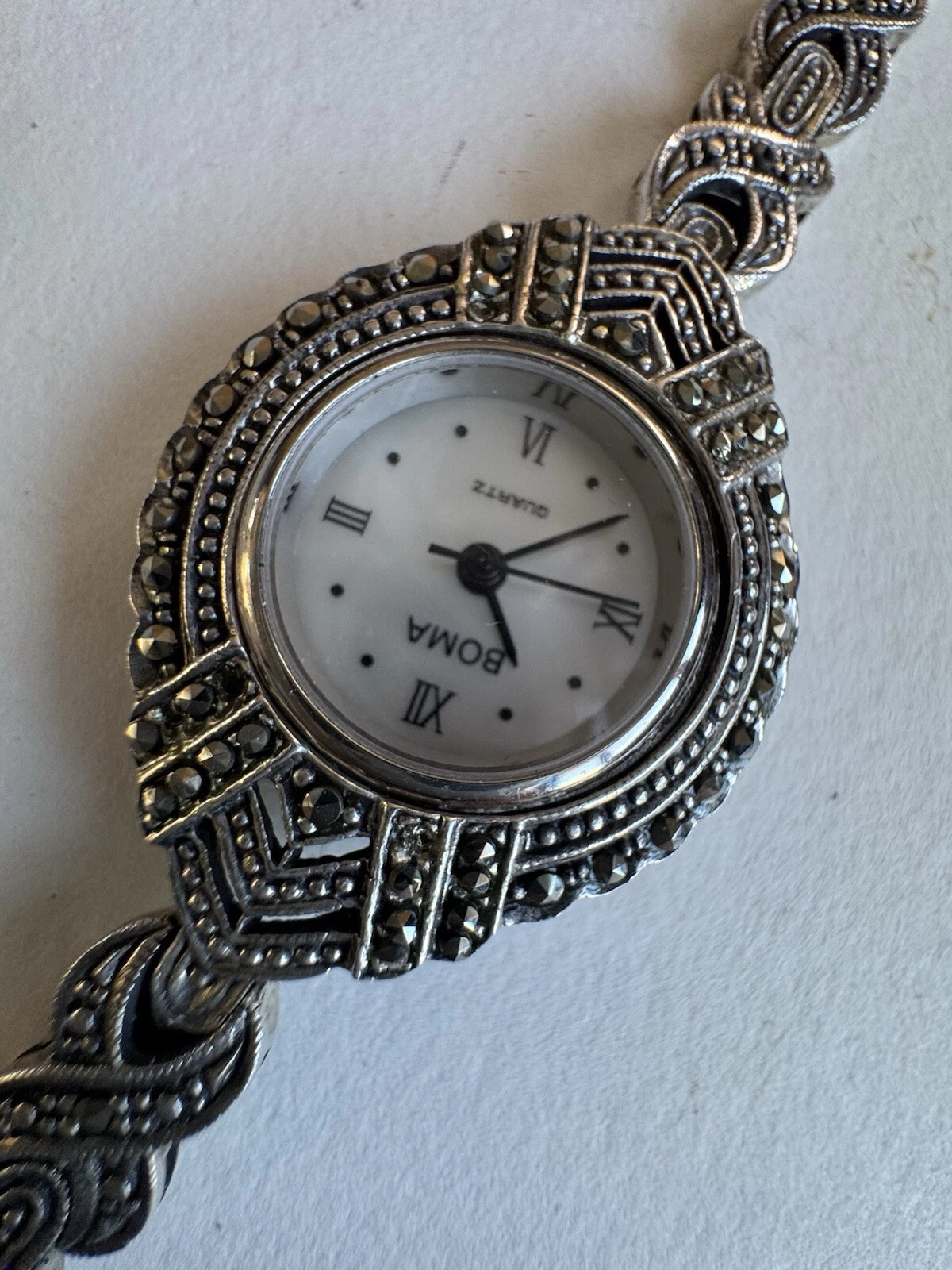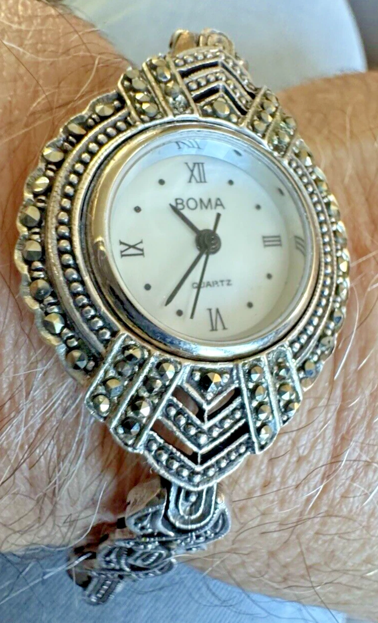 BOMA Vintage Sterling Silver (925) Marcasite& Mother of Pearl Bangle Watch WORKS