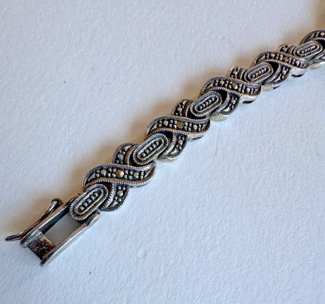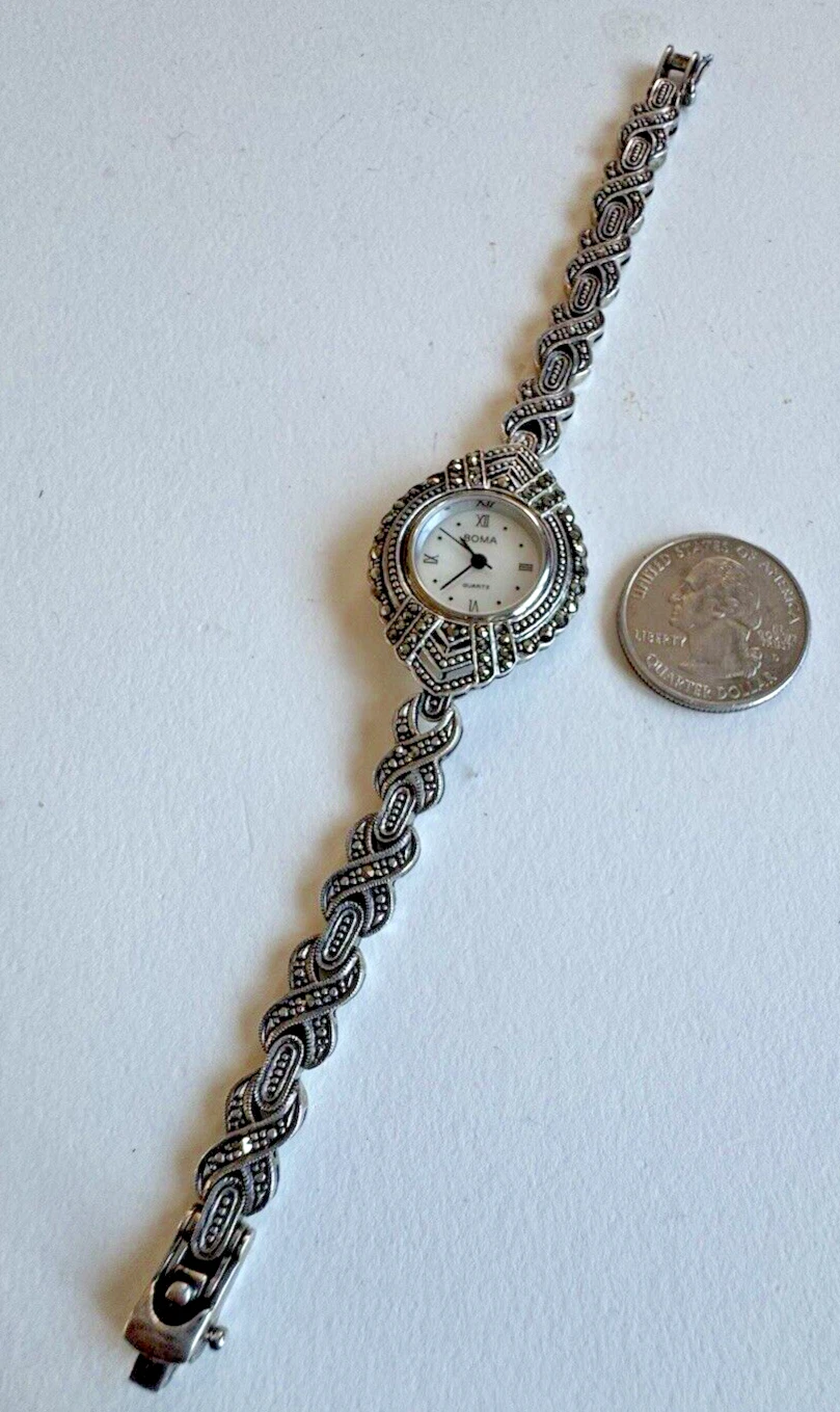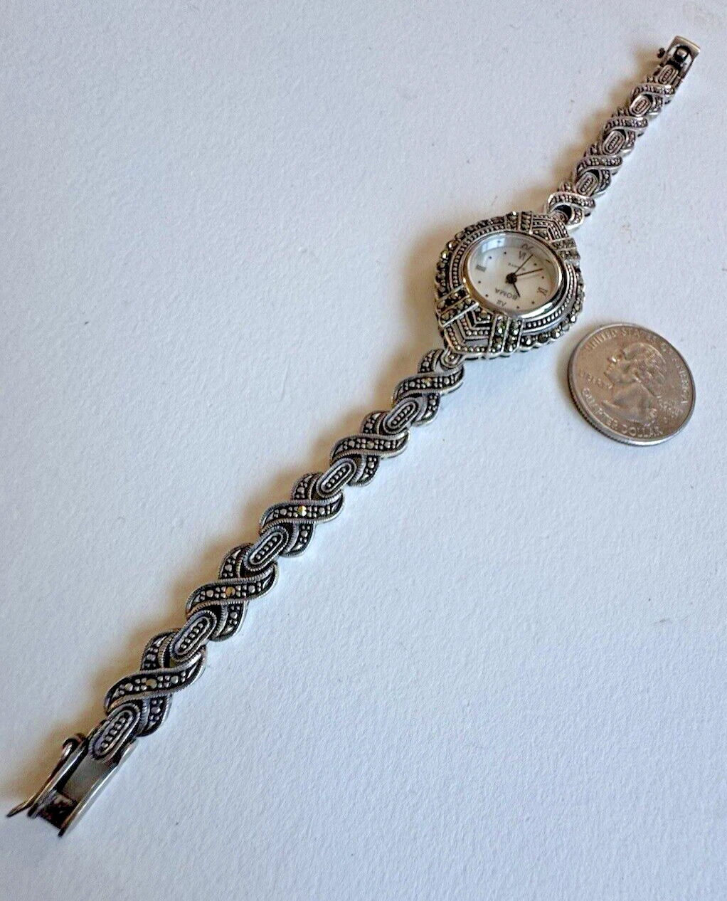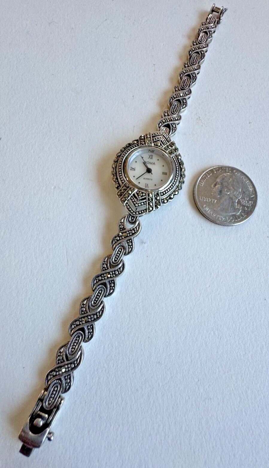 BOMA Vintage Sterling Silver (925) Marcasite& Mother of Pearl Bangle Watch WORKS