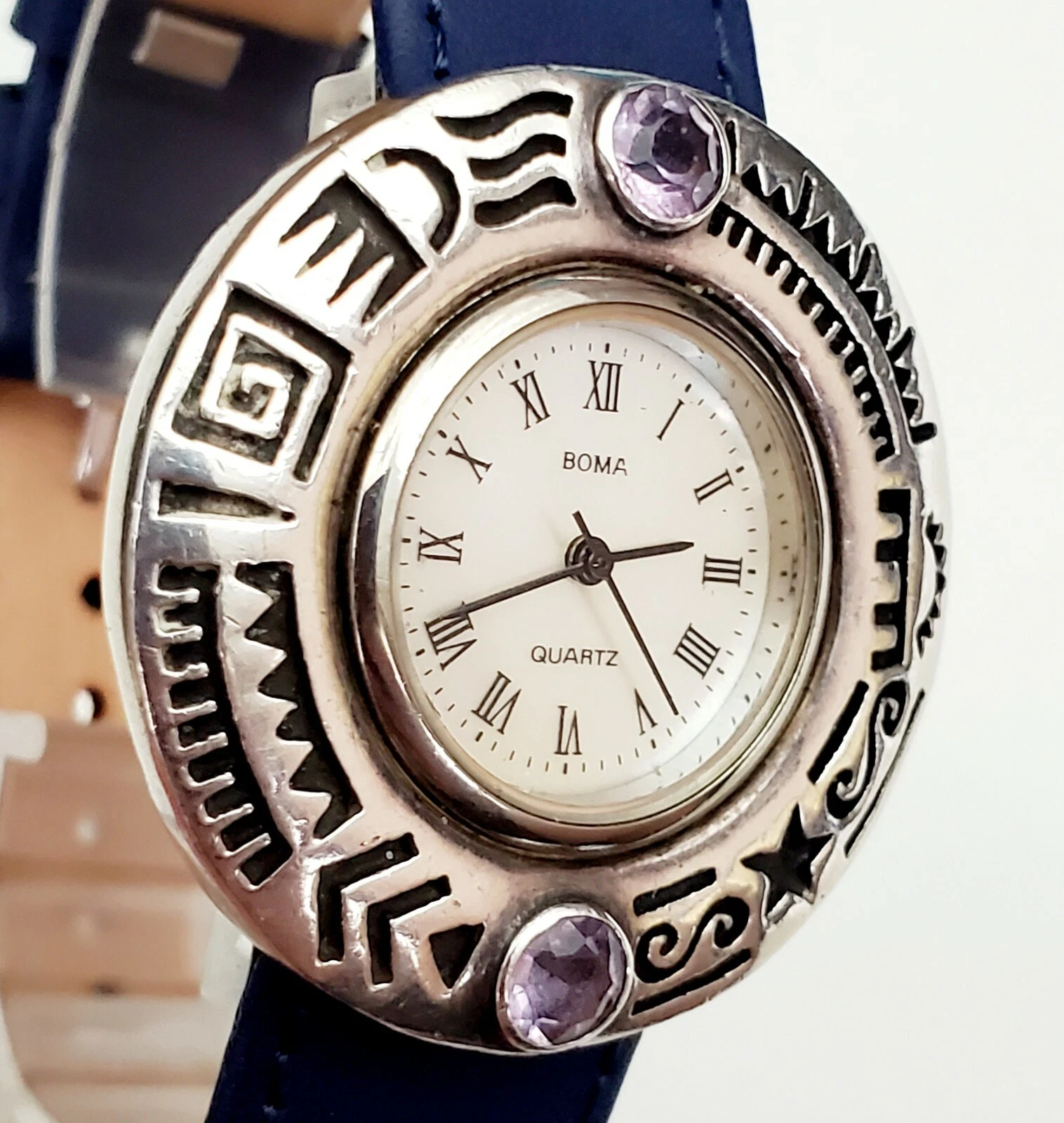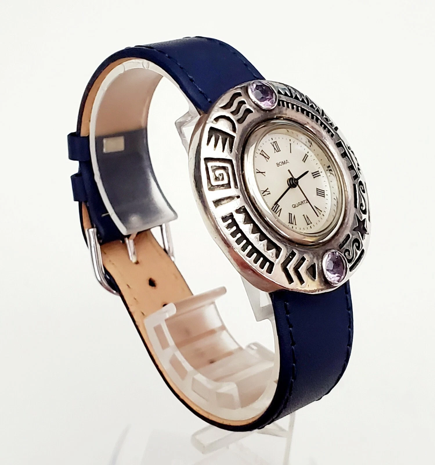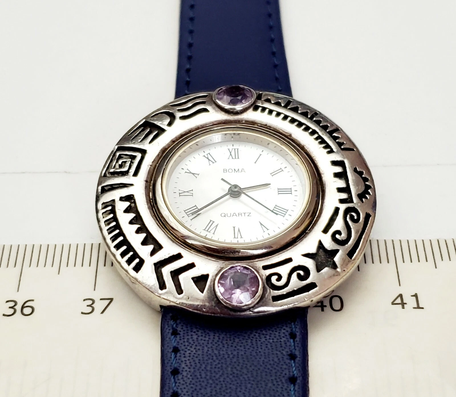 UNIQUE Women STERLING SILVER Watch BOMA. Amethyst Gemstones.Mother Of Pearl Dial