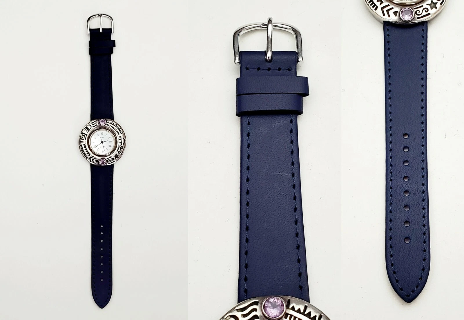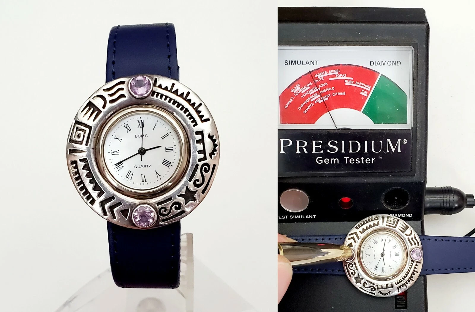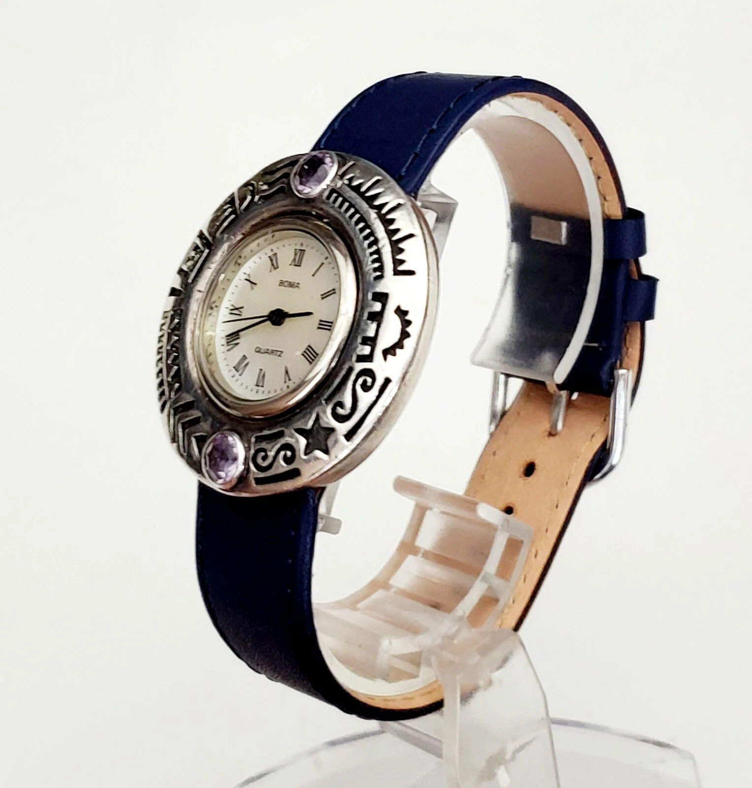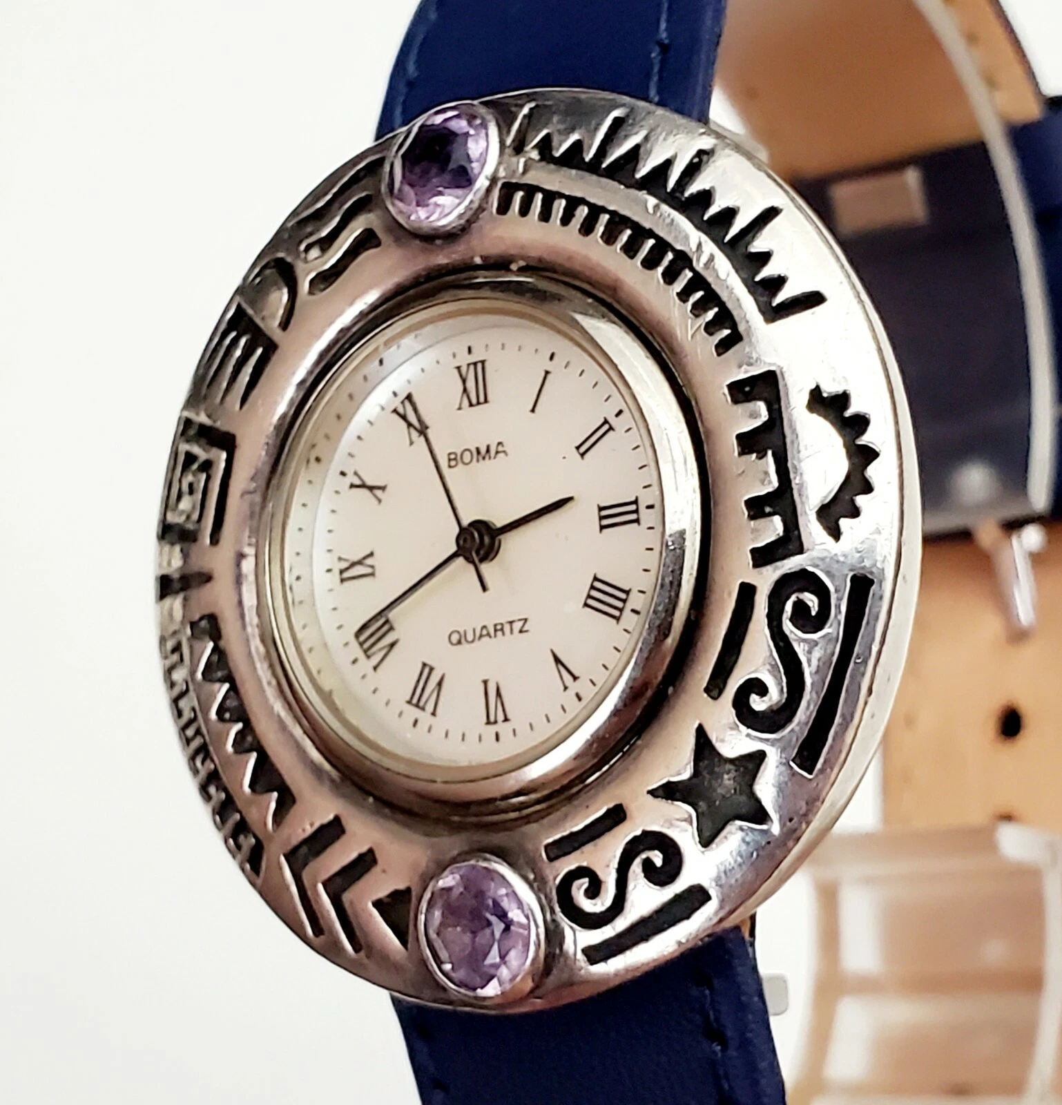 UNIQUE Women STERLING SILVER Watch BOMA. Amethyst Gemstones.Mother Of Pearl Dial
