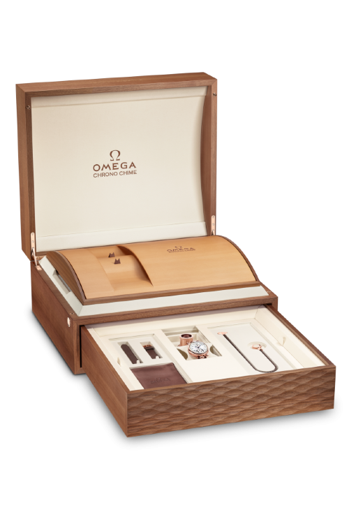 Репетир. Хронограф. Калибр Omega 1932. Запас хода до 60 часов. Циферблат белый. Задняя крышка с сапфировым стеклом. Корпус из Sedna Gold - сплава золота с медью и палладием, разработанного Omega для своих часов. В комплект входит кожаный ремешок и два кожаных шнурка, позволяющие носить часы как карманные или на шее.