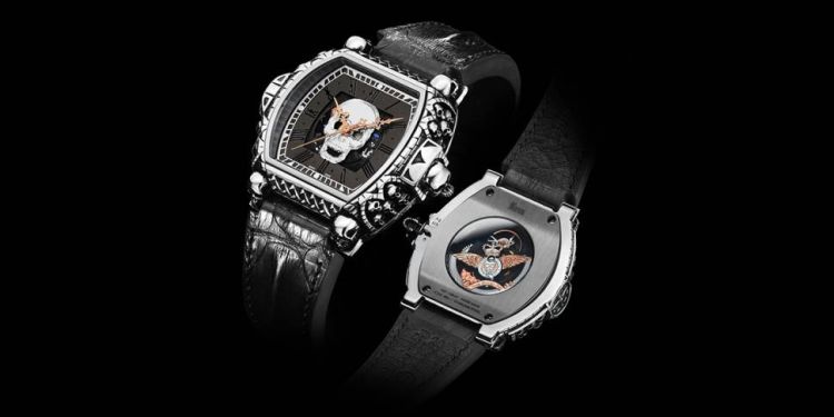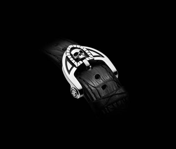 Ограниченная серия (Limited Edition) 9 шт. Скелетон. Черный циферблат украшен выгравированным вручную черепом. Задняя крышка с сапфировым стеклом. Застежка из серебра.
