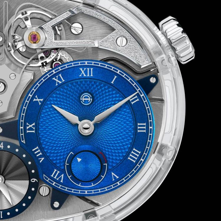 Ограниченная серия (Limited Edition) 8 шт. Второй часовой пояс. Скелетон. Калибр ARF17. Запас хода до 110 часов. Два синих циферблата. Задняя крышка прозрачная.