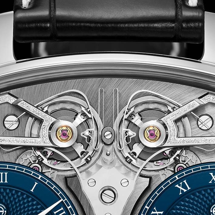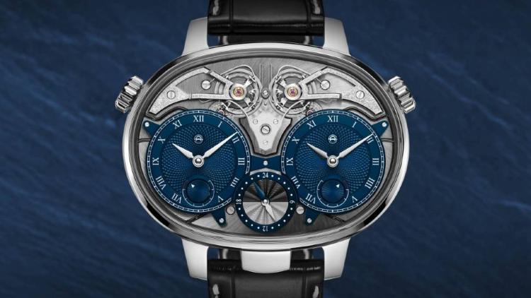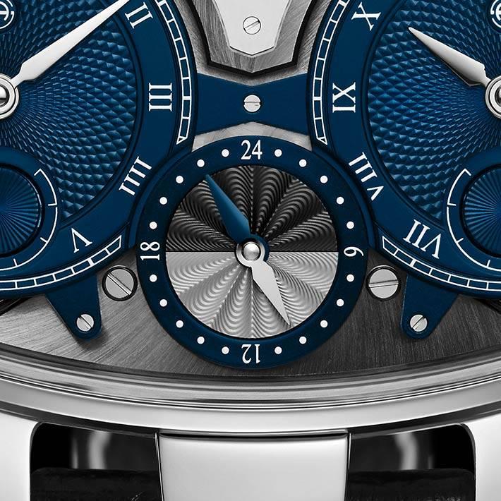Ограниченная серия (Limited Edition) 8 шт. Второй часовой пояс. Скелетон. Индикатор запаса хода. Калибр ARF17. Запас хода до 110 часов. Два синих субдиала. Задняя крышка прозрачная.