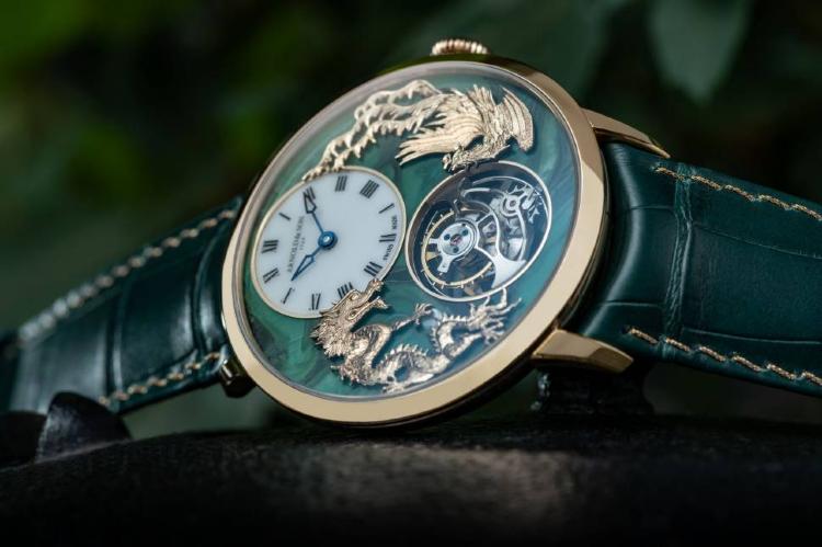 Ограниченная серия (Limited Edition) 5 шт. Турбийон. Калибр A&S8200. Запас хода до 90 часов. Циферблат зеленый, декорирован золотыми фигурками драконов. Задняя крышка прозрачная.