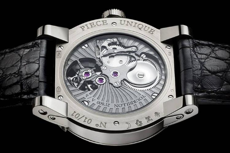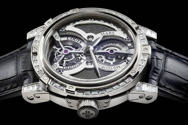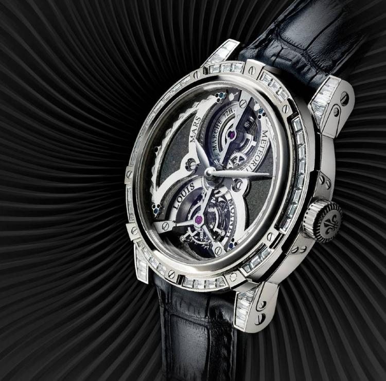 Ограниченная серия (Limited Edition) 1 шт. 56 багетных бриллиантов весом 3,46 карата. Турбийон. Запас хода до 72 часов. Циферблат выполнен из фрагмента метеорита. Задняя крышка прозрачная.