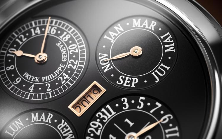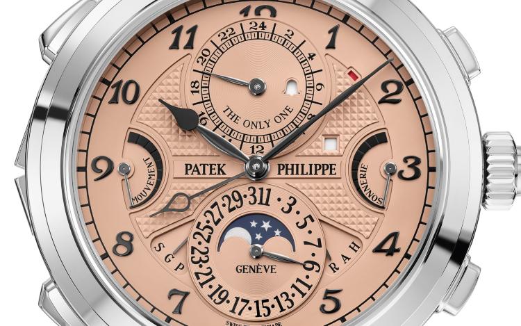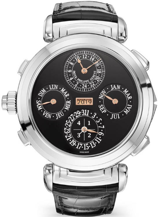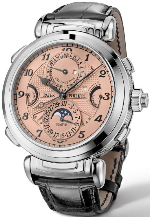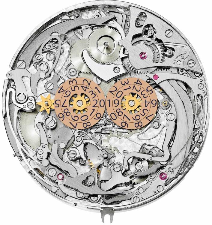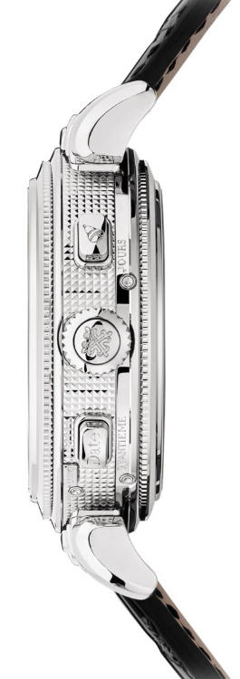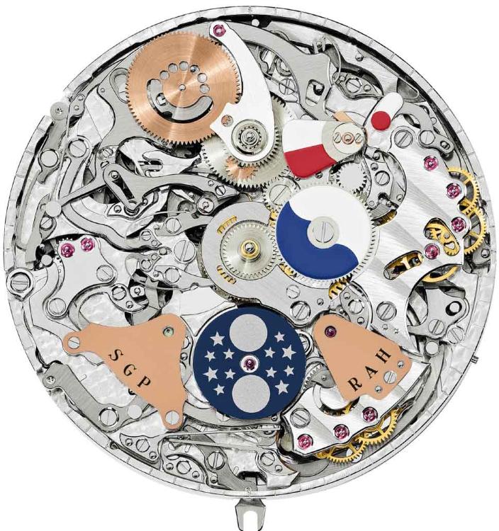 Ограниченная серия (Limited Edition) 1 шт. Репетир. Второй часовой пояс. Калибр 300 GS AL 36-750 QIS FUS IRM. Запас хода до 72 часов. Индикатор отключения механизма боя. Индикатор времени суток, указателя времени второго часового пояса. День недели, число (на обоих циферблатах), месяц, цикл високосных лет (индикация с помощью стрелок). Четырехзначная индикация года в окошке. 24-часовой и минутный дополнительный циферблат. Индикация положения головки (R,A,H). Двухсторонний переворачивающийся корпус. Циферблат из пластин розового золота. Задняя крышка прозрачная.