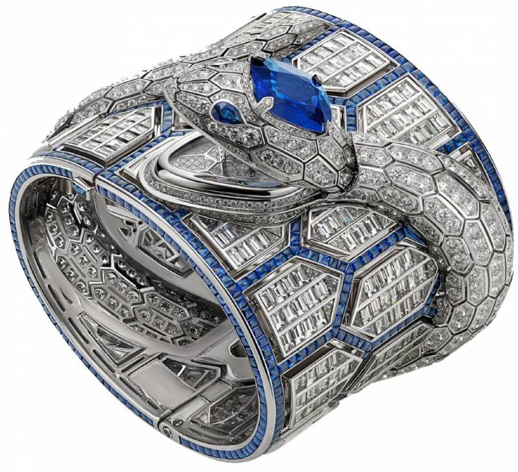 Бриллианты классической и багетной огранки на корпусе и браслете общим весом 63 карата. Браслет инкрустирован сапфирами багетной огранки весом 32 карата. Глаза змейки из двух грушевидных сапфиров, еще один граненый сапфир весом 10 карат на головке змеи. Победитель ежегодного часового Гран-При Grand Prix d Horlogerie de Geneve 2019 в номинации Лучшие ювелирные часы.