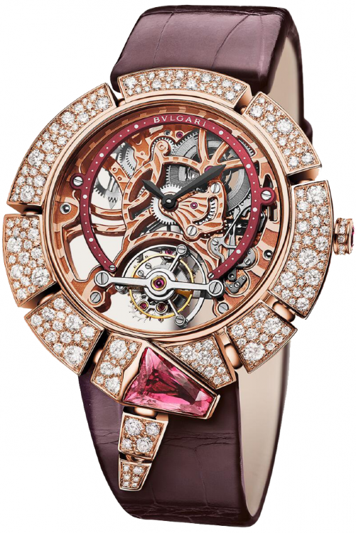 Ограниченная серия (Limited Edition) 50 шт. Бриллианты классической огранки на корпусе. Турбийон. Скелетон. Калибр BVL 208. Запас хода до 64 часов. Циферблат вишневый. Задняя крышка прозрачная.