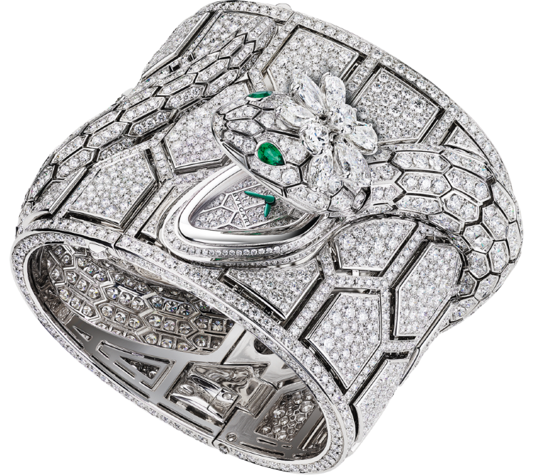 Бриллианты классической огранки на корпусе, браслете, циферблате, застежке. Циферблат с бриллиантовым паве.