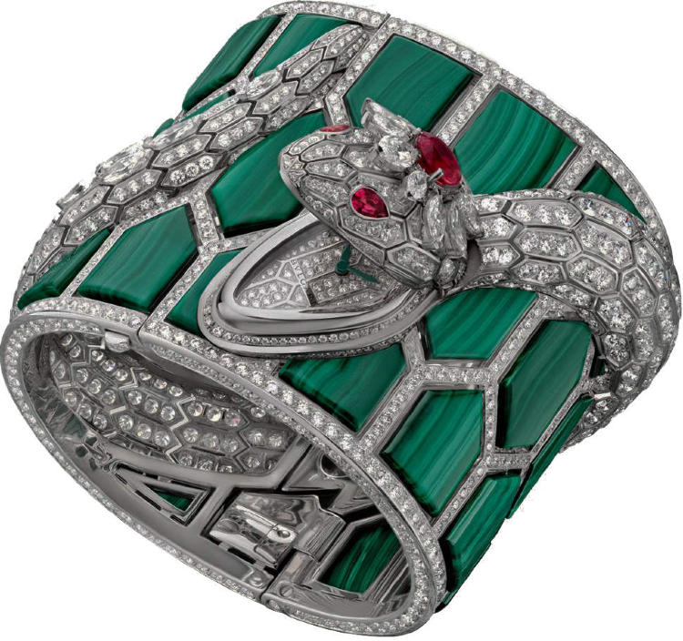 Корпус и браслет украшены бриллиантами классической огранки и огранки маркиз и рубеллитами. Вставки из малахита на браслете. Циферблат инкрустирован бриллиантами. Индивидуальная цена.