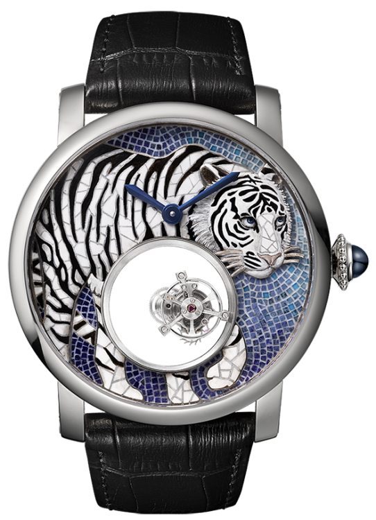Ограниченная серия (Limited Edition) 30 шт. Tourbillon. Задняя крышка прозрачная. Запас хода до 52 часов. Циферблат из белого золота с драгоценными камнями.
