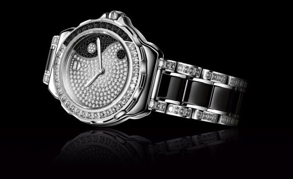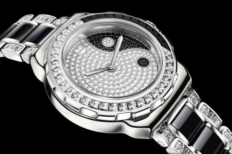 Циферблат с рисунком Инь Янь, украшен белыми и черными бриллиантами, общим весом 7,36 карата.