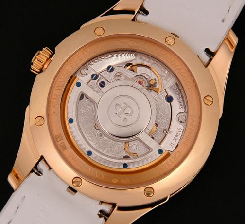 198 белых бриллианта весом 1,673 карата. Прозрачная задняя крышка. Запас хода до 40 часов.