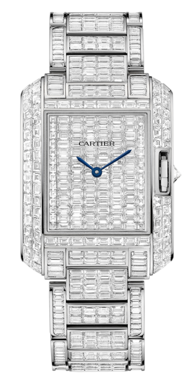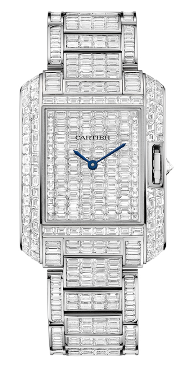 Корпус,браслет и циферблат украшены белыми багетными бриллиантами. Бриллиантовый кабошен на заводной головке.