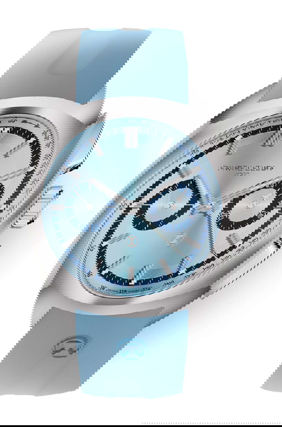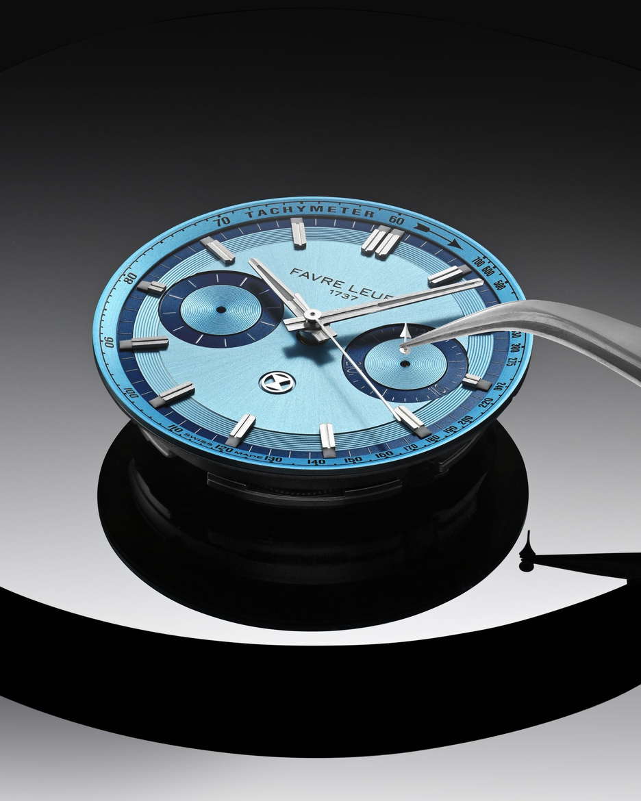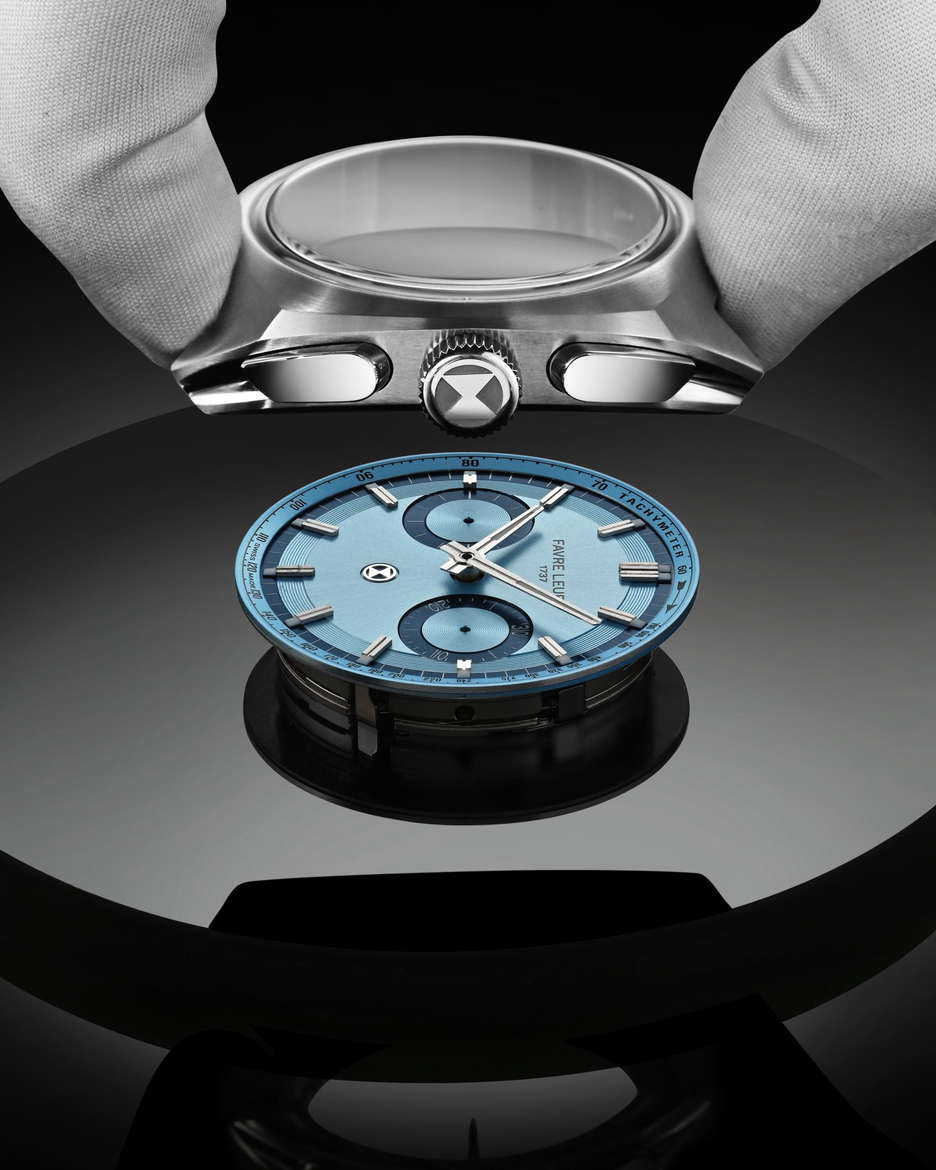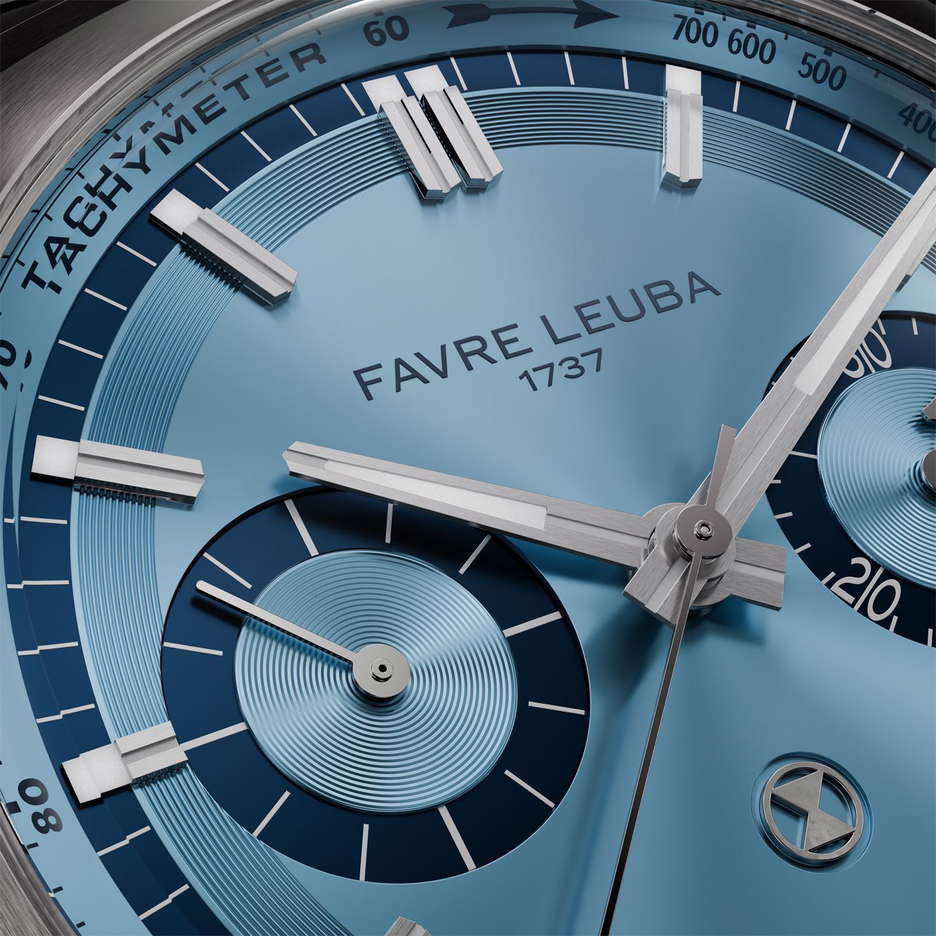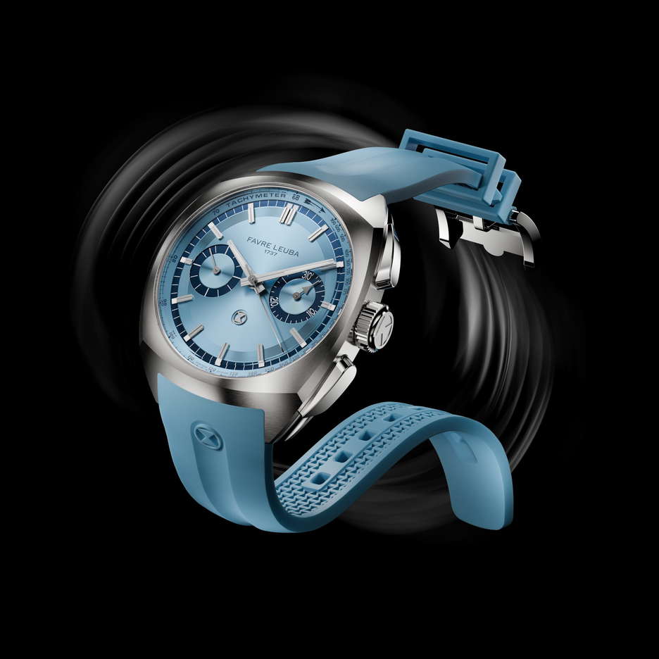 The Favre Leuba Chief Chronograph easily blends vintage charm with modern sport-chic refinement. Rooted in the brand’s 1970s design language, it retains the signature cushion-shaped case, now subtly refined with grooved flanks, streamlined lugs, and an ovoid profile that enhances both compactness and wearability. Its sunburst dial, available in blue, ice blue, and black, undergoes over 100 production steps to achieve remarkable depth. Raised bi-compax sub-dials at 9 and 3 o’clock enhance contrast, while a tachymeter scale along the inner flange reinforces its sporting credentials. Rhodium-plated Super-LumiNova®-coated hands and indices ensure optimal legibility, while the 3D Favre Leuba hourglass at 6 o’clock adds a signature touch of refinement. Housed in a 41mm 316L stainless steel case with brushed and satin finishes, the Chief Chronograph features a sapphire crystal case back, revealing the La Joux-Perret L113 column-wheel chronograph movement, renowned for its smooth actuation and 60-hour power reserve. The intricate movement finishing—Côtes de Genève striping, blued screws, and polished steel components—reflects Favre Leuba’s commitment to fine watchmaking. Completing the package, an integrated steel bracelet with H-shaped links and a deployant clasp, with a rubber strap option available for a sportier edge. In an era where many heritage reissues err on the side of nostalgia, Favre Leuba takes a more considered approach, breathing new life into a classic without losing its essence. The Chief Chronograph is neither a mere throwback nor a radical reinvention—it is an evolution, a watch that respects its past while confidently asserting itself in the present.