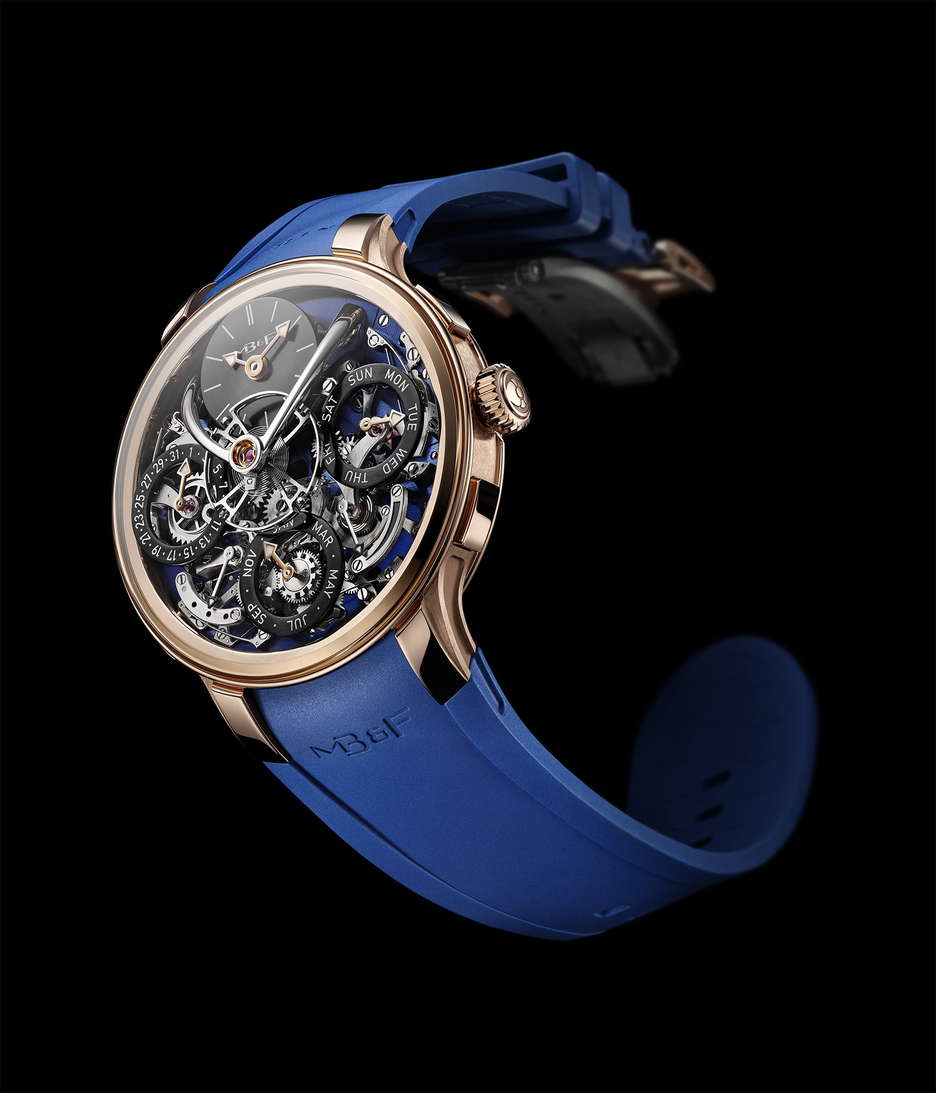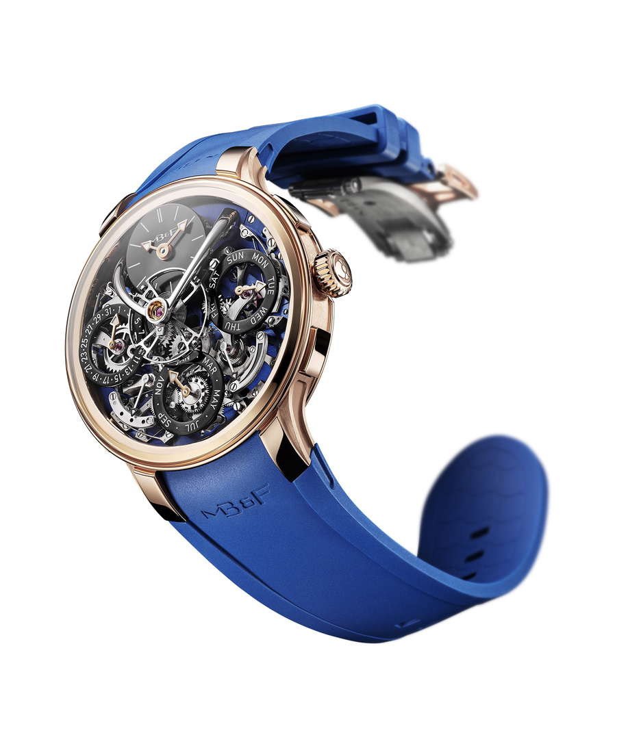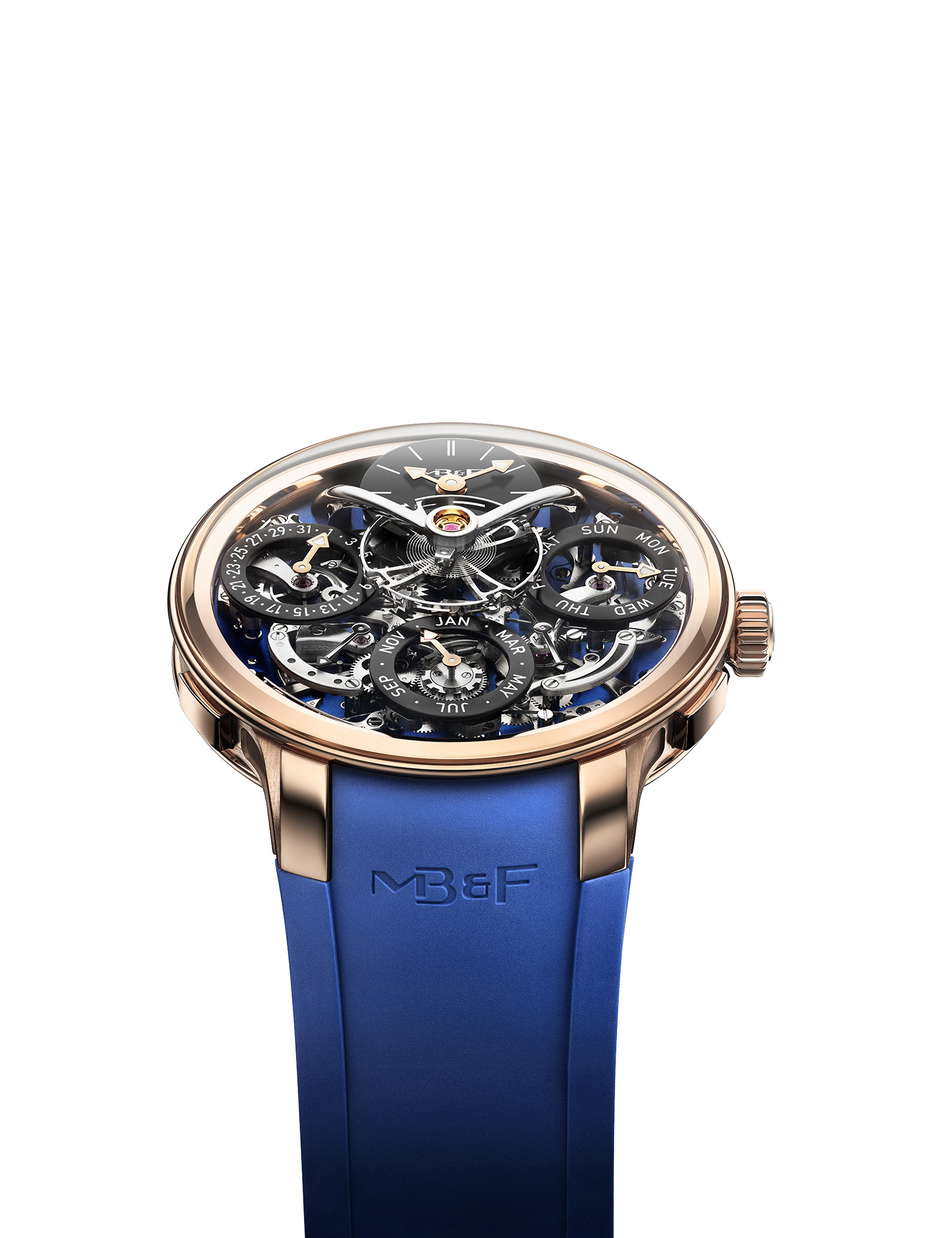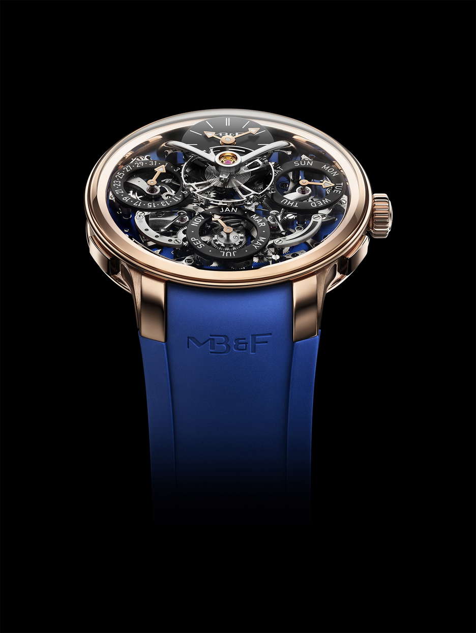 MB&F creations transport wearers to imaginative worlds, with the EVO line marking a milestone in 2020 through the LM Perpetual EVO, designed for active lifestyles. These watches ensure wearers never leave them behind. The LM Perpetual EVO debuted in zirconium, followed by a titanium edition with a green CVD dial-plate, later updated to ice blue in 2024. Celebrating MB&F LAB’s Silicon Valley launch, a limited edition of 18 pieces in 18K rose gold with an ocean blue dial-plate now joins the series. All versions feature integrated rubber straps for unmatched comfort. The LM Perpetual EVO Silicon Valley’s 44mm rose gold case design emphasizes clarity, with a no-bezel construction and domed sapphire crystal fused directly to the case. This enhances both the legibility of the perpetual calendar and the visibility of the MB&F signature hovering balance wheel. New sapphire crystal geometries balance structural strength with a reduced height-to-diameter ratio. The design also incorporates a thermal bonding system for durability. The FlexRing, a monobloc shock-absorbing system, enhances robustness, while the LM Perpetual Engine, made by Stephen McDonnell, redefines the perpetual calendar using a “mechanical processor.” This processor defaults each month to 28 days, adding days as needed, ensuring precise date tracking, and preventing incorrect jumps. A safety mechanism disconnects quickset pushers during date changes, avoiding damage. The LM Perpetual EVO Silicon Valley’s circular pushers were replaced with double-sprung oblong actuators for easier adjustment, while the screw-down crown, with an 80m water resistance, features a débrayage system to prevent overwinding. This stunning timepiece is exclusively available at Stephen Silver Fine Jewelry in Menlo Park, California.