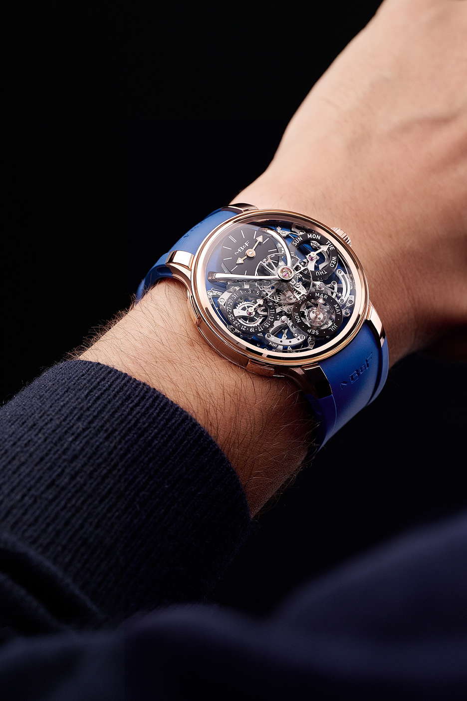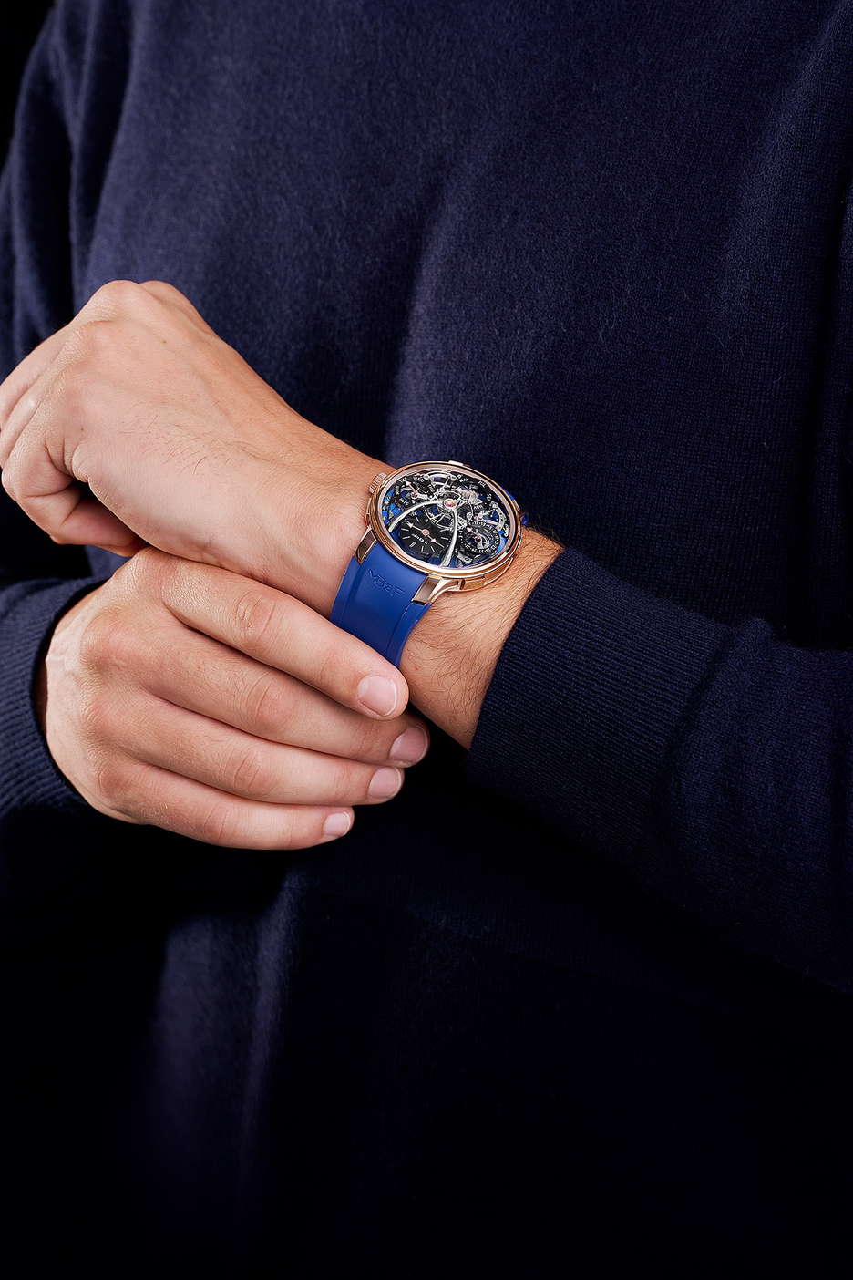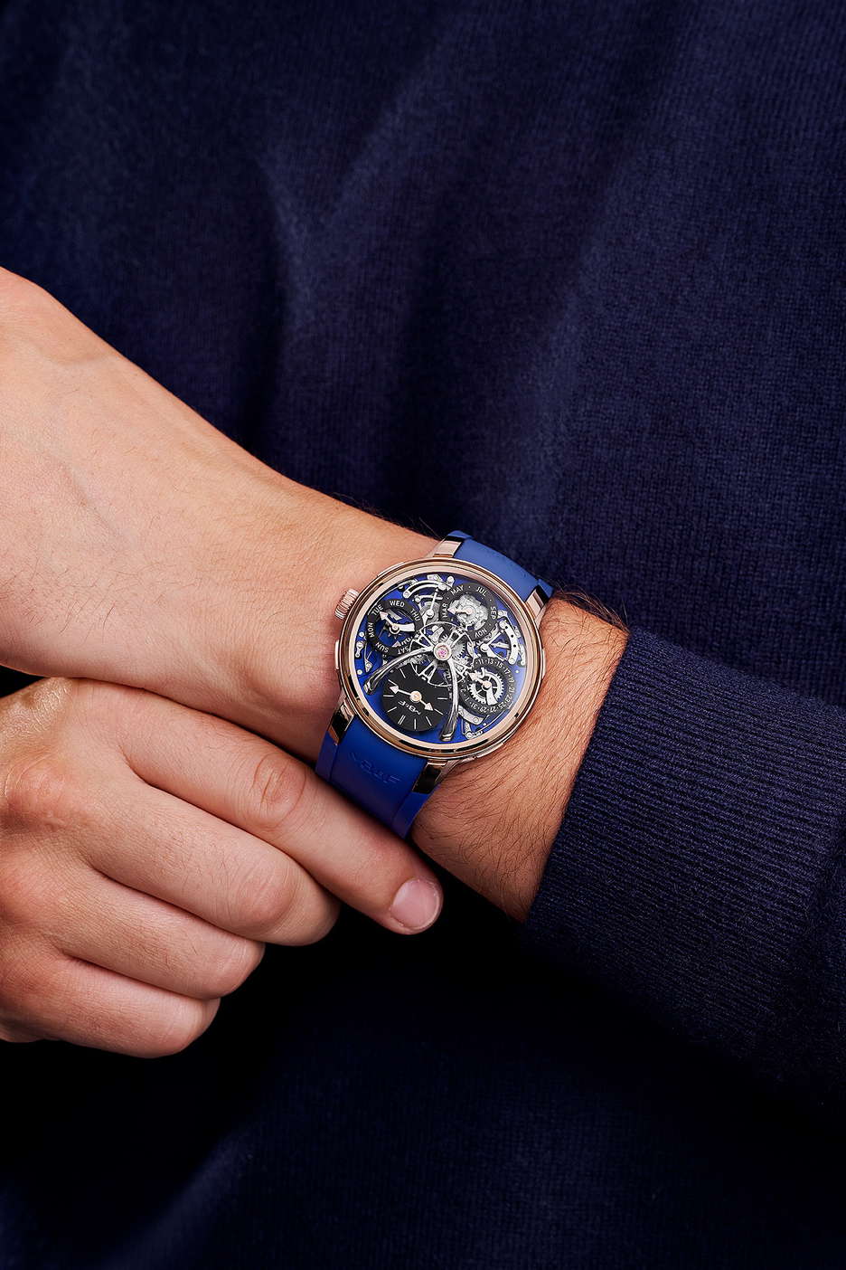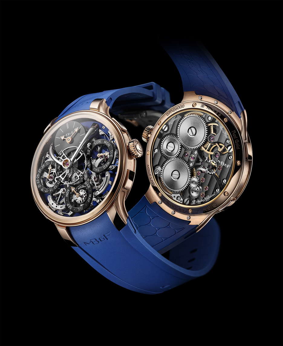 MB&F creations transport wearers to imaginative worlds, with the EVO line marking a milestone in 2020 through the LM Perpetual EVO, designed for active lifestyles. These watches ensure wearers never leave them behind. The LM Perpetual EVO debuted in zirconium, followed by a titanium edition with a green CVD dial-plate, later updated to ice blue in 2024. Celebrating MB&F LAB’s Silicon Valley launch, a limited edition of 18 pieces in 18K rose gold with an ocean blue dial-plate now joins the series. All versions feature integrated rubber straps for unmatched comfort. The LM Perpetual EVO Silicon Valley’s 44mm rose gold case design emphasizes clarity, with a no-bezel construction and domed sapphire crystal fused directly to the case. This enhances both the legibility of the perpetual calendar and the visibility of the MB&F signature hovering balance wheel. New sapphire crystal geometries balance structural strength with a reduced height-to-diameter ratio. The design also incorporates a thermal bonding system for durability. The FlexRing, a monobloc shock-absorbing system, enhances robustness, while the LM Perpetual Engine, made by Stephen McDonnell, redefines the perpetual calendar using a “mechanical processor.” This processor defaults each month to 28 days, adding days as needed, ensuring precise date tracking, and preventing incorrect jumps. A safety mechanism disconnects quickset pushers during date changes, avoiding damage. The LM Perpetual EVO Silicon Valley’s circular pushers were replaced with double-sprung oblong actuators for easier adjustment, while the screw-down crown, with an 80m water resistance, features a débrayage system to prevent overwinding. This stunning timepiece is exclusively available at Stephen Silver Fine Jewelry in Menlo Park, California.