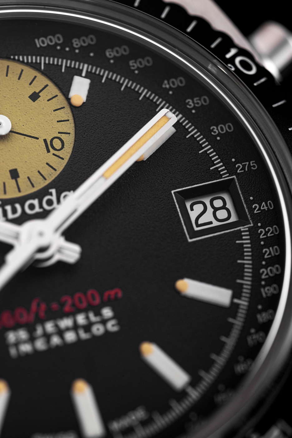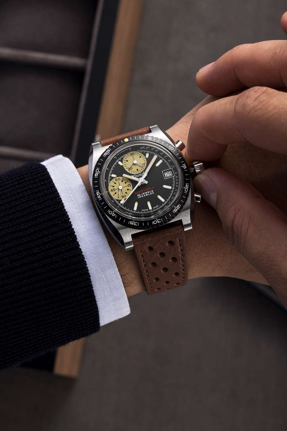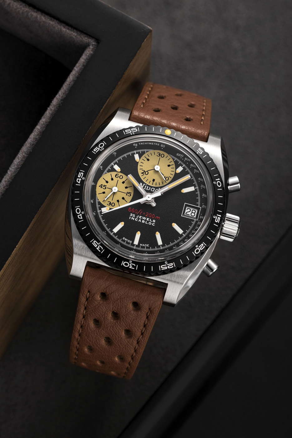 Nivada Grenchen’s Chronosport 38mm makes a sensational debut, drawing inspiration from a previously unreleased vintage chronograph prototype from the 1970s. This classic timepiece has been refreshed for the modern man, combining the excellence of Swiss watchmaking with a sleek and sophisticated design. Since 1926, Nivada Grenchen has been synonymous with quality. In 2018, Guillaume Laidet aimed to revive the brand’s iconic models for a broader audience. The discovery of the Chronosport prototype, with only about 20 ever made and never commercialized, sparked huge demand on social media for a reissue. The new Chronosport is celebrated for its unique dial, featuring a textured matte black background, two embossed sub-dials in taupe with a hint of khaki, and a tachymeter scale. It also features either white or yellow Super-LumiNova® indices and hands, a bold white logo, and Art Deco typography, all designed by renowned dial maker Jean Singer. The Chronosport is powered by the automatic Valjoux-7750-ETA movement, with a 42-hour power reserve and multiple functions. Its 38mm stainless steel case, domed sapphire crystal, and a water resistance up to 200 meters. Additionally, it features a fluted unidirectional rotating aluminum bezel and offers 10 strap options for customization.