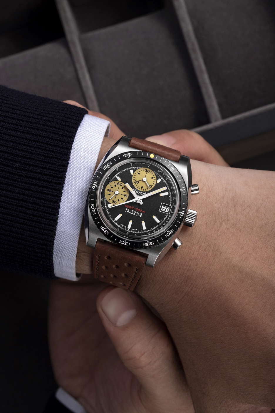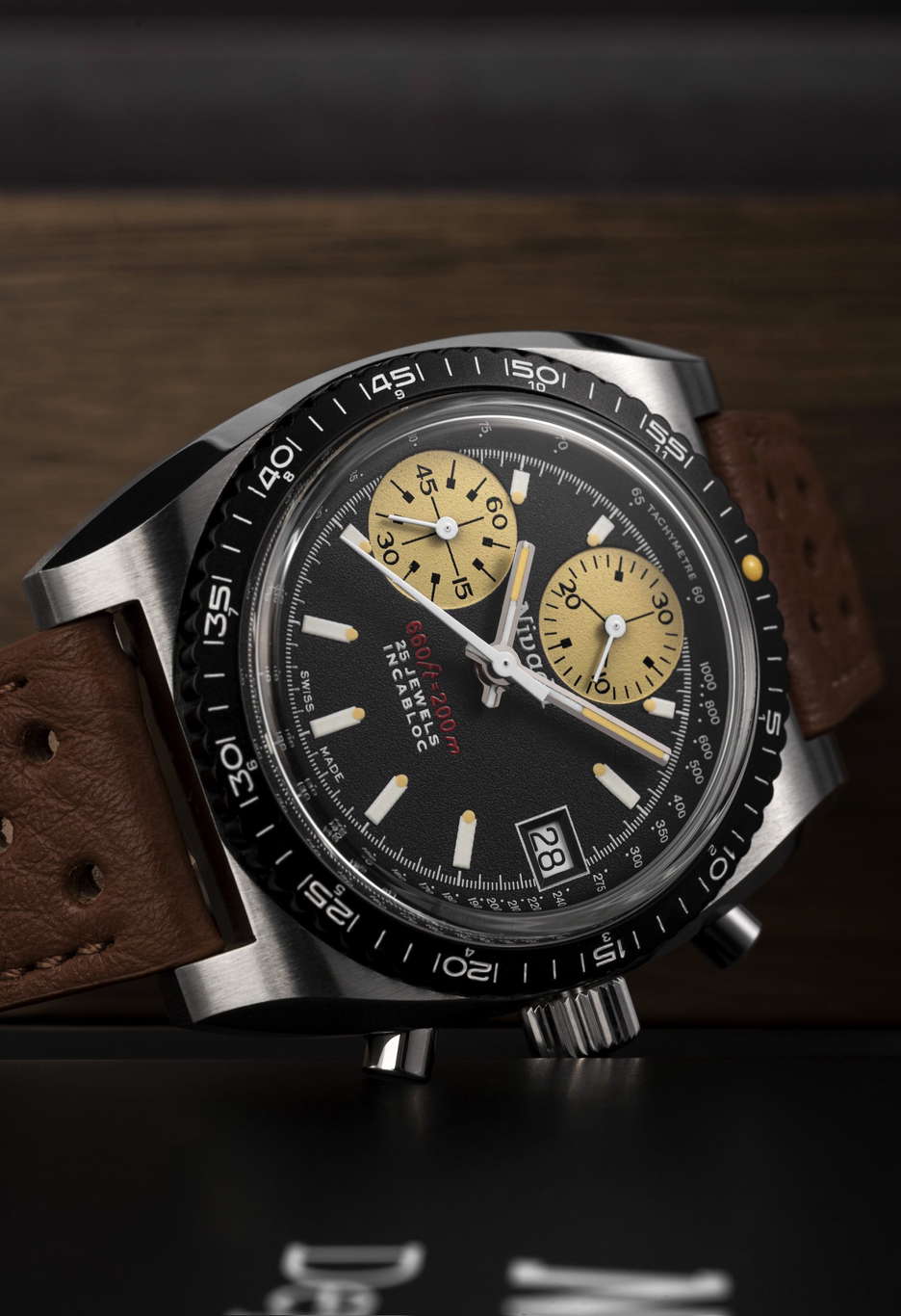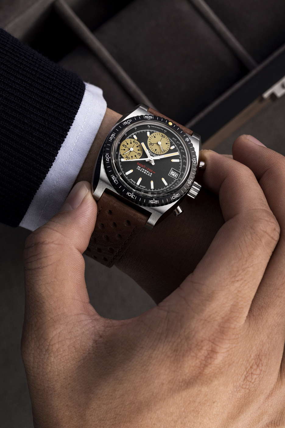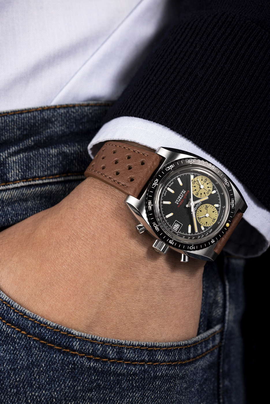 Nivada Grenchen’s Chronosport 38mm makes a sensational debut, drawing inspiration from a previously unreleased vintage chronograph prototype from the 1970s. This classic timepiece has been refreshed for the modern man, combining the excellence of Swiss watchmaking with a sleek and sophisticated design. Since 1926, Nivada Grenchen has been synonymous with quality. In 2018, Guillaume Laidet aimed to revive the brand’s iconic models for a broader audience. The discovery of the Chronosport prototype, with only about 20 ever made and never commercialized, sparked huge demand on social media for a reissue. The new Chronosport is celebrated for its unique dial, featuring a textured matte black background, two embossed sub-dials in taupe with a hint of khaki, and a tachymeter scale. It also features either white or yellow Super-LumiNova® indices and hands, a bold white logo, and Art Deco typography, all designed by renowned dial maker Jean Singer. The Chronosport is powered by the automatic Valjoux-7750-ETA movement, with a 42-hour power reserve and multiple functions. Its 38mm stainless steel case, domed sapphire crystal, and a water resistance up to 200 meters. Additionally, it features a fluted unidirectional rotating aluminum bezel and offers 10 strap options for customization.