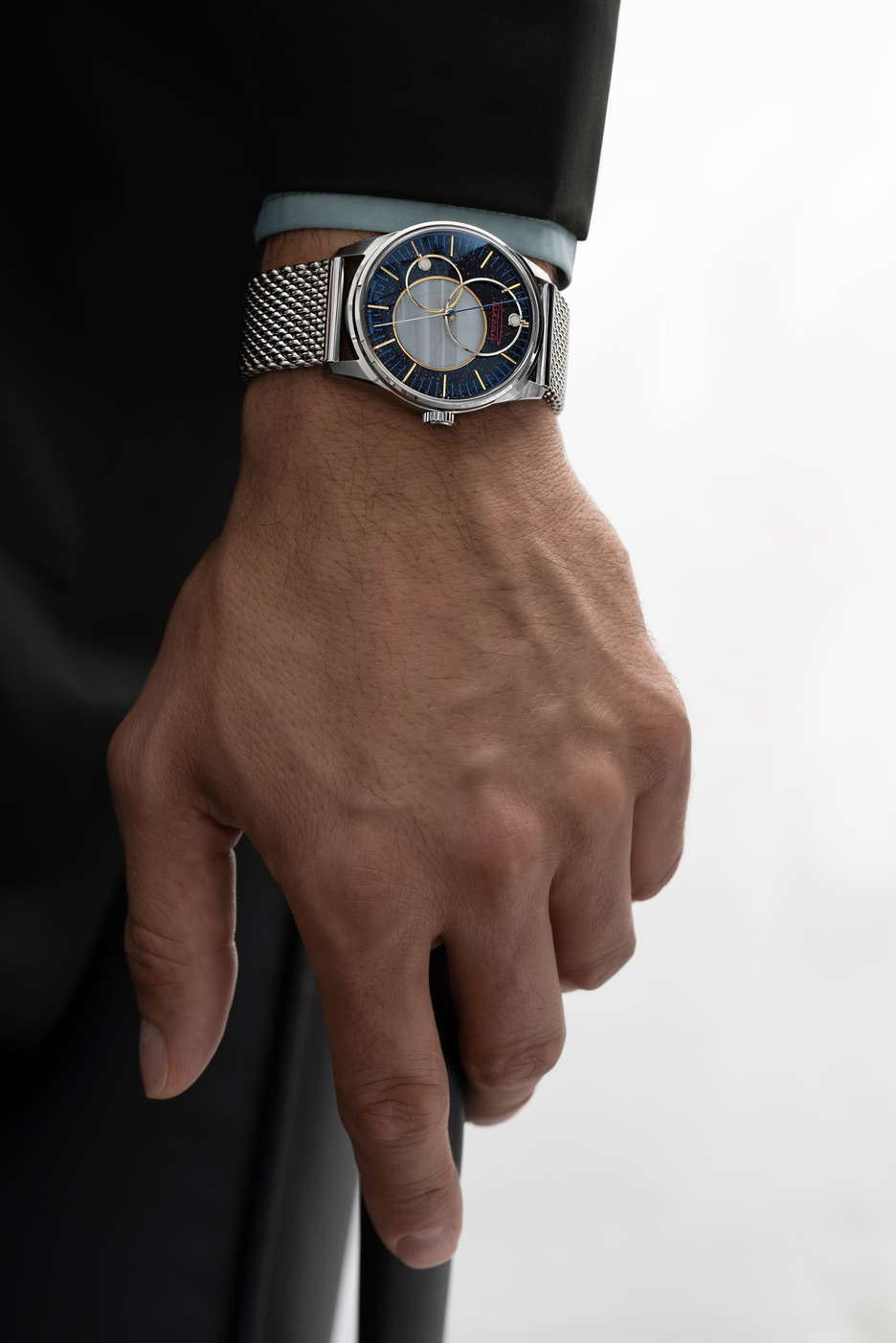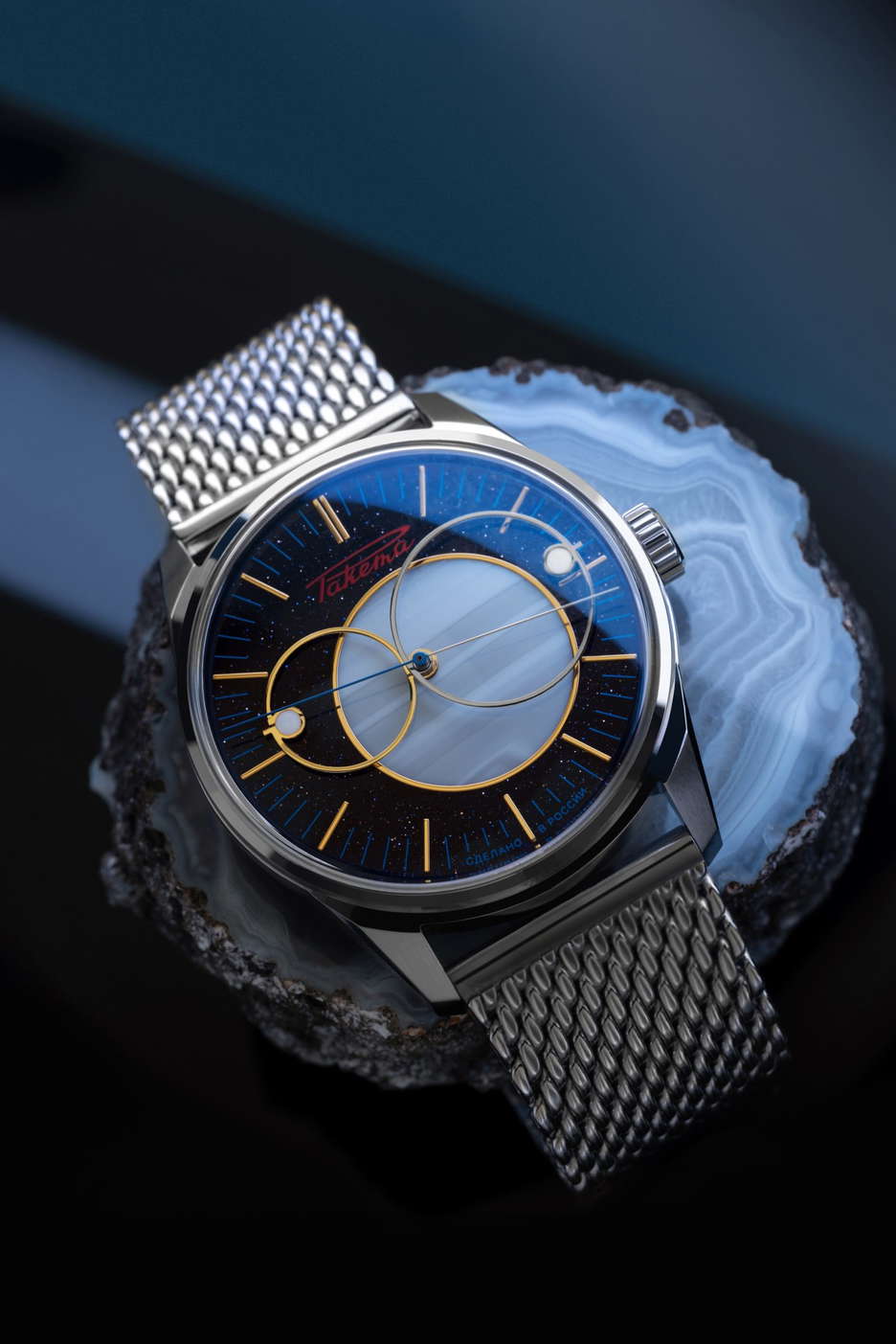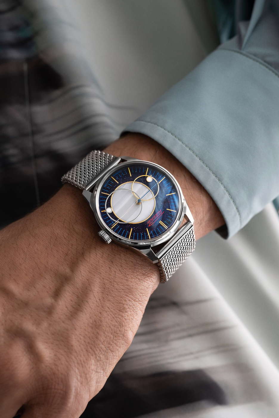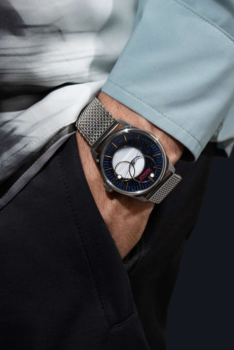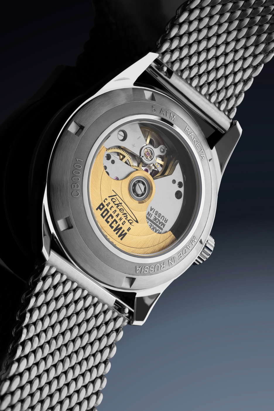 Raketa has just released an updated version of its classic Copernicus model, first introduced in 1965. The watch is a tribute to Nicolaus Copernicus, the renowned astronomer who changed the course of science in the 16th century by proving that the Earth orbits the Sun, not the other way around. In this new version, Raketa has designed the dial and hands to resemble planets revolving around the Sun, offering a unique and artistic interpretation of the Cosmos. The dial is made of aventurine, a stone that sparkles like a starry night sky, with the Sun represented by a circle of agate stone at the center. This “Copernicus” 0307 recalls the ancient way of telling time by observing the movement of celestial bodies. To read the time, you’ll follow the planet-shaped hands as they move around the Sun and relate to one another. The watch is completed with a Milanese mesh bracelet, adding a touch of elegance to its design. On the back, you’ll find the beautiful automatic movement, fully manufactured by the Raketa Watch Factory in Saint Petersburg, visible through the transparent case back.