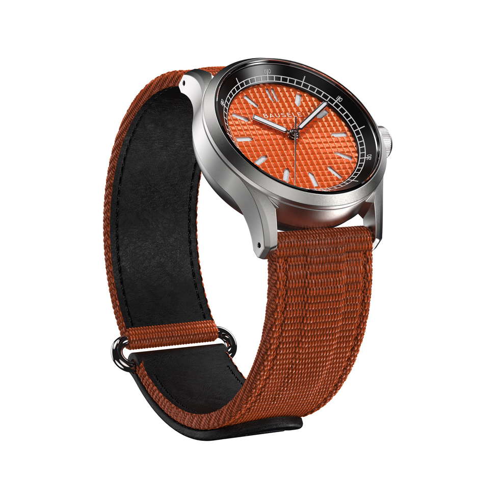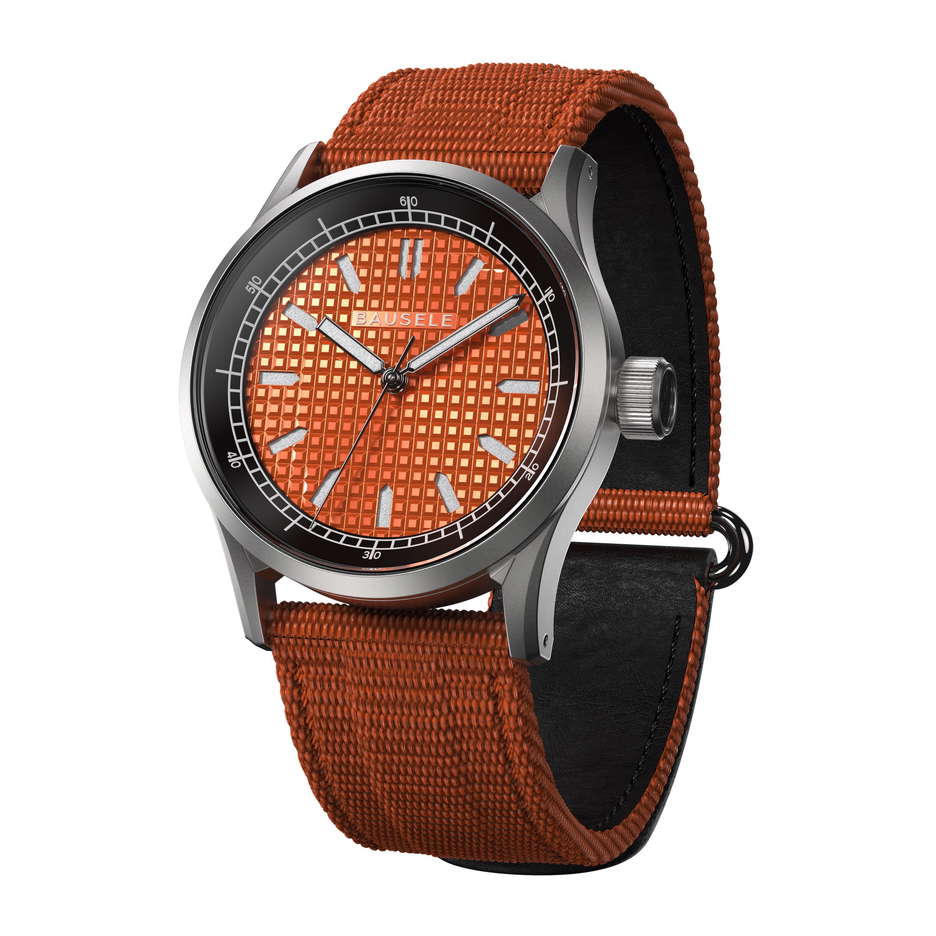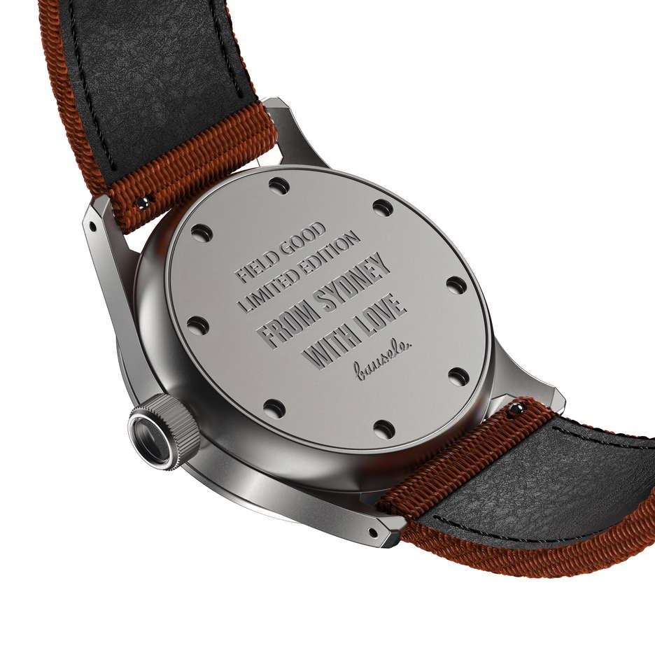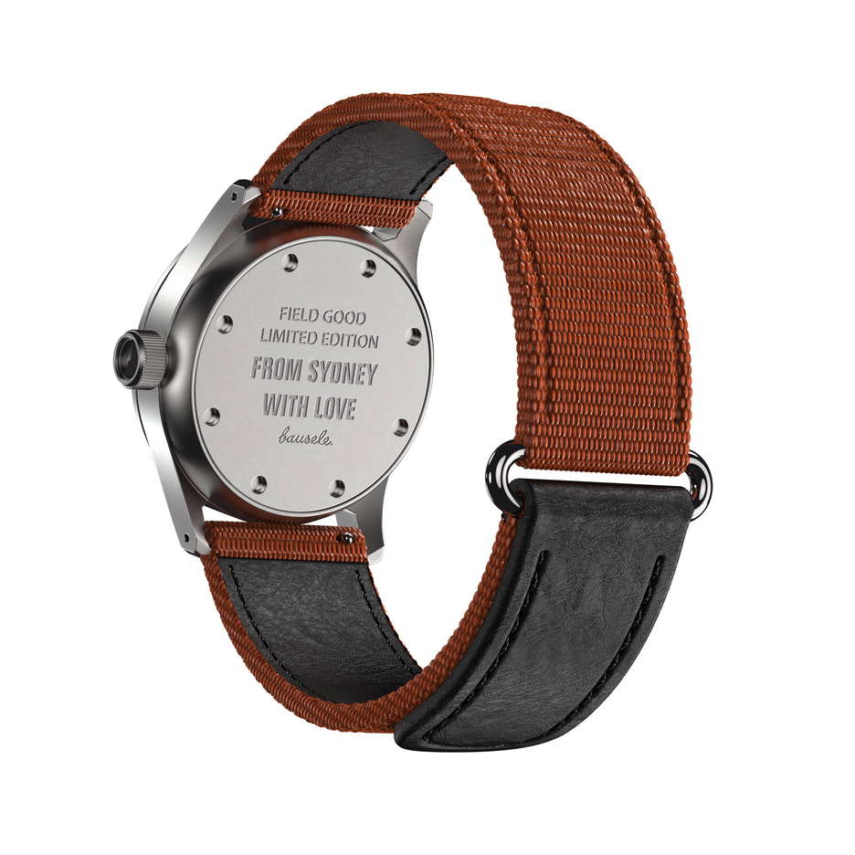 The Bausele Field Good Uluru Red Watch is a limited edition watch designed to capture the vibrant spirit and stunning colors of Australia’s famous Uluru/Ayers Rock. The watch portrays the deep and rich orange tones of this cherished Australian landmark and its grandeur. It’s more than just a timekeeper; it’s a portal to adventure. This watch has a “Petite Tapisserie” pattern that creates a mesmerizing depth and play of light with every movement of your wrist. Its C3 Luminova®-coated hands and numerals ensure visibility in low-light conditions. Made from 316L sandblasted marine-grade stainless steel, the 38mm case is robust and water-resistant up to 100 meters, suitable for everyday wear and recreational water activities. It is powered by the reliable Seiko NH38A movement with a 41-hour power reserve. Adding a personal touch, the case back is laser-engraved with “Limited Edition” and “From Sydney with Love,” highlighting Bausele’s proud Australian heritage. And the crown, located at the 3 o’clock position, features a unique filling of black sand from Kiama’s Black Beach in New South Wales, Australia. The Bausele Field Good Uluru Red is a perfect blend of rugged elegance and sophisticated style, designed for both everyday explorers and watch lovers alike.