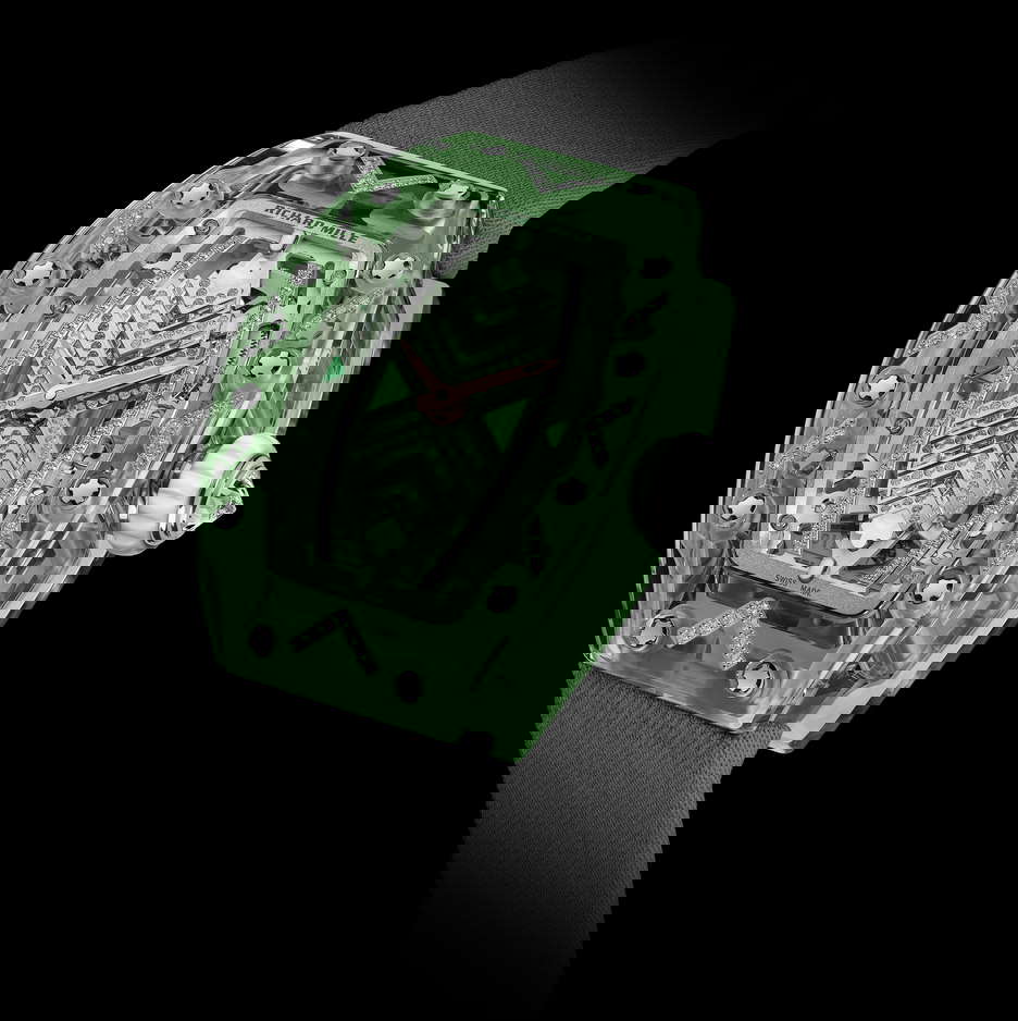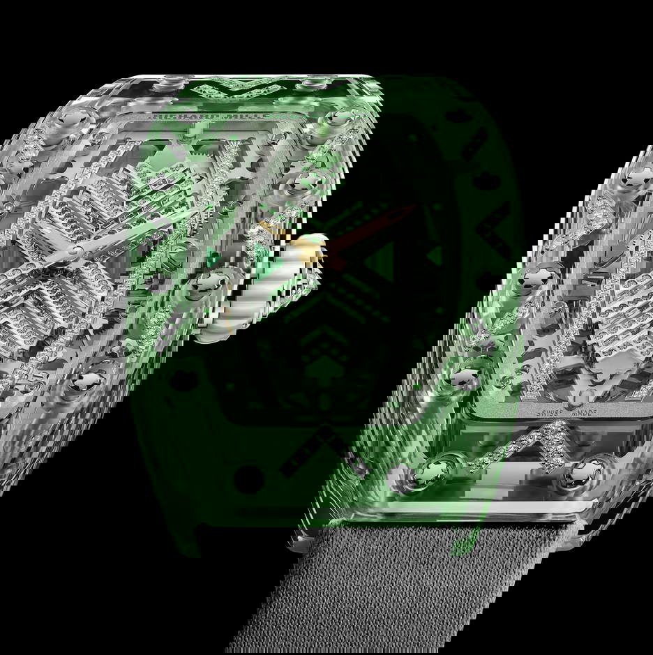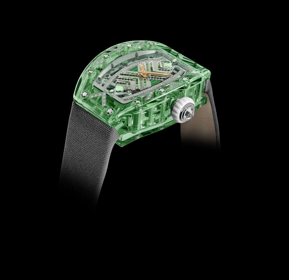 The Richard Mille RM 07-02 Automatic Sapphire collection is a perfect fusion of clean design and advanced watchmaking. Staying true to the 2015 original, these timepieces feature cases entirely made from colored sapphire, allowing the intricate movement to be admired from every angle. The collection introduces four new variations, including a fresh lilac hue and redesigned gem-set dials. At the core of each watch lies a stunningly symmetrical dial with a mix of diamonds, sapphires, and ornamental stones like spessartite, opal, and malachite. The intricate gem-setting highlights the craftsmanship, with hand-polished gold prongs securing the stones and enhancing the sapphire’s brilliance. The RM 07-02 Automatic Sapphire are powered by the CRMA5 skeletonized automatic movement, equipped with a variable-geometry rotor for customizable winding based on activity. This compact mechanism offers a 50-hour power reserve and is encased in sapphire, requiring over 1,000 hours of precise machining and polishing due to the material’s exceptional hardness and curved design. Colored sapphire cases are even more challenging to produce, involving meticulous incorporation of metal oxides to achieve the perfect hue. The lilac version, for example, required extensive trials to perfect its shade. Limited to just seven pieces per version, the RM 07-02 collection includes pink, lilac, green, and gem-set green sapphire options.