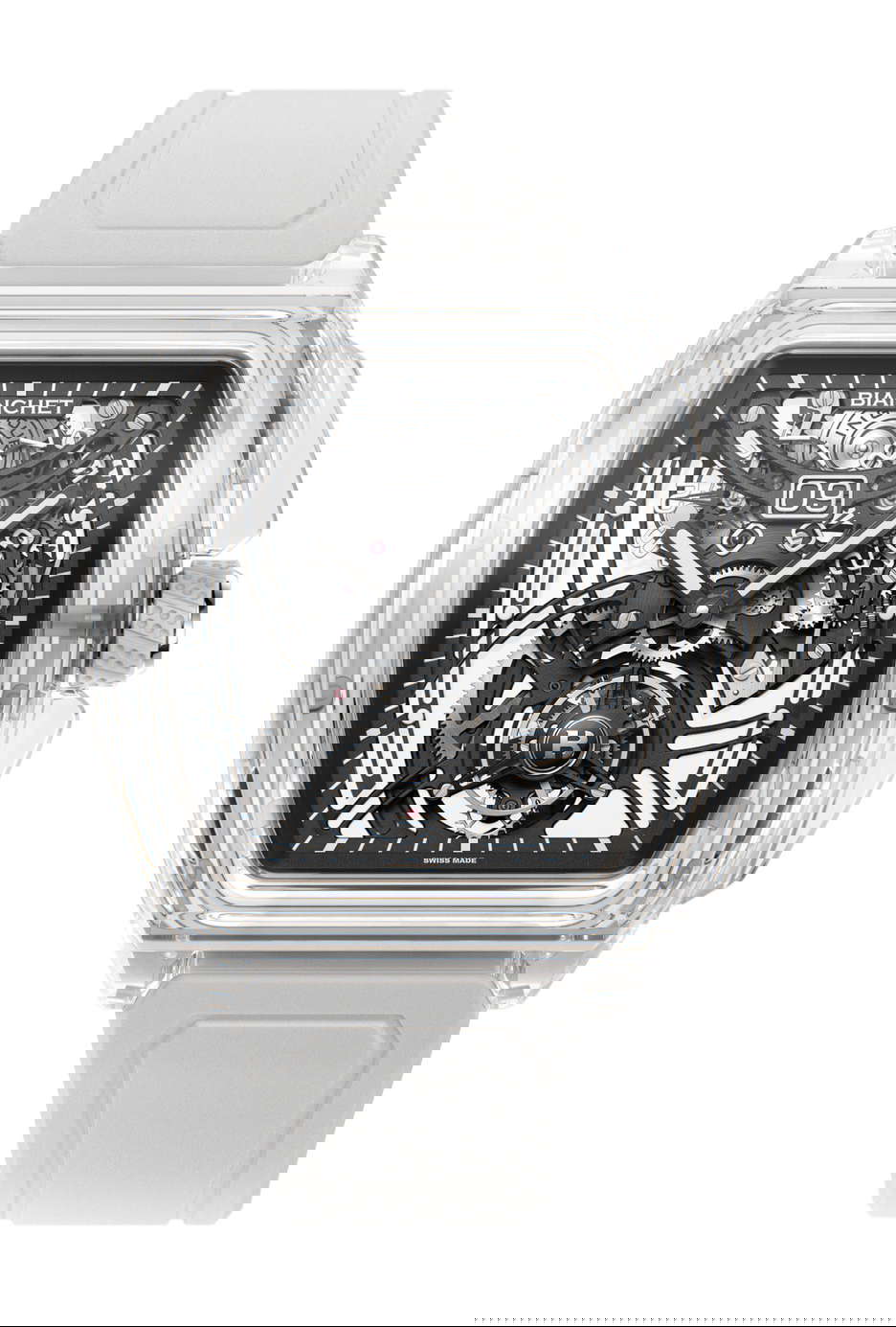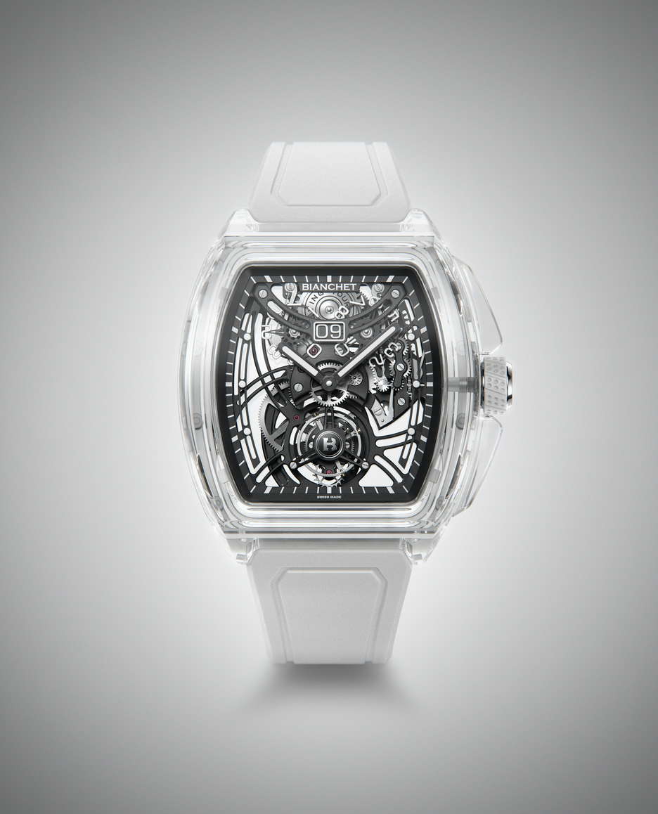 Bianchet, the Swiss watchmaker, is introducing something truly special with the B 1.618 Grande Date Sapphire Edition. Set to debut at Geneva Watch Days in September 2024; this watch takes innovation to new heights by combining sapphire crystal and rubber in a way that’s never been done before. The transparent case gives you a full view of the intricate Flying Tourbillon movement inside, made from titanium and designed to look like it’s floating. It’s a striking piece that pushes the boundaries of what a luxury watch can be. With only 21 pieces being made, the B 1.618 Grande Date Sapphire Edition is a rare blend of advanced technology and traditional Swiss watchmaking. Every detail, from the clear case to the white rubber strap and titanium clasp, is carefully designed to complement the watch’s unique design.