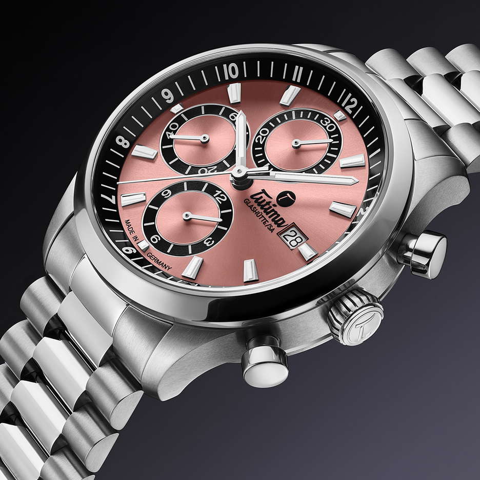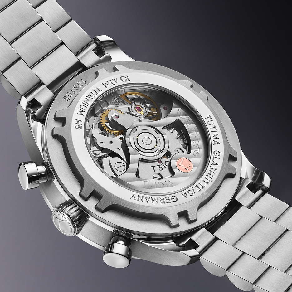 The Sky Chronograph T5 from Tutima Glashütte is a watch that’s perfectly suited for everyday wear but with a touch of something special. These latest models, available in sleek Airy Blue or warm Copper dials, bring a sporty elegance to Tutima’s Sky collection. At the heart of this watch is a Grade 5 titanium 41 mm case, which is 40% lighter than steel and built to last. It’s scratch-resistant, skin-friendly, and can withstand corrosion, saltwater, and even acids. Tutima has been working with titanium for decades, mastering the art of making durable, lightweight timepieces. The case, featuring a screw-down crown and a fully threaded back, is paired with an ultra-light titanium bracelet that sits comfortably on your wrist, featuring a mix of polished and brushed surfaces. The titanium’s matte grey shimmer really stands out, and the whole case is pressure-tested to 10 atmospheres for added peace of mind. On the dial, you’ll find subdials tracking seconds, minutes, and hours, framed in black for a sharp contrast against the bright, Super-LumiNova-coated hands and indices. Whether you choose the Airy Blue or Copper dial, the sunburst finish plays beautifully with light, adding an extra layer of sophistication. A tough, 2.2-mm thick sapphire crystal protects the face. Inside, the Tutima Caliber 310 movement ensures precise, reliable timekeeping. You can even catch a glimpse of it through the sapphire crystal case back, where the rotor, with Tutima’s gold seal, winds automatically with every move of your wrist.