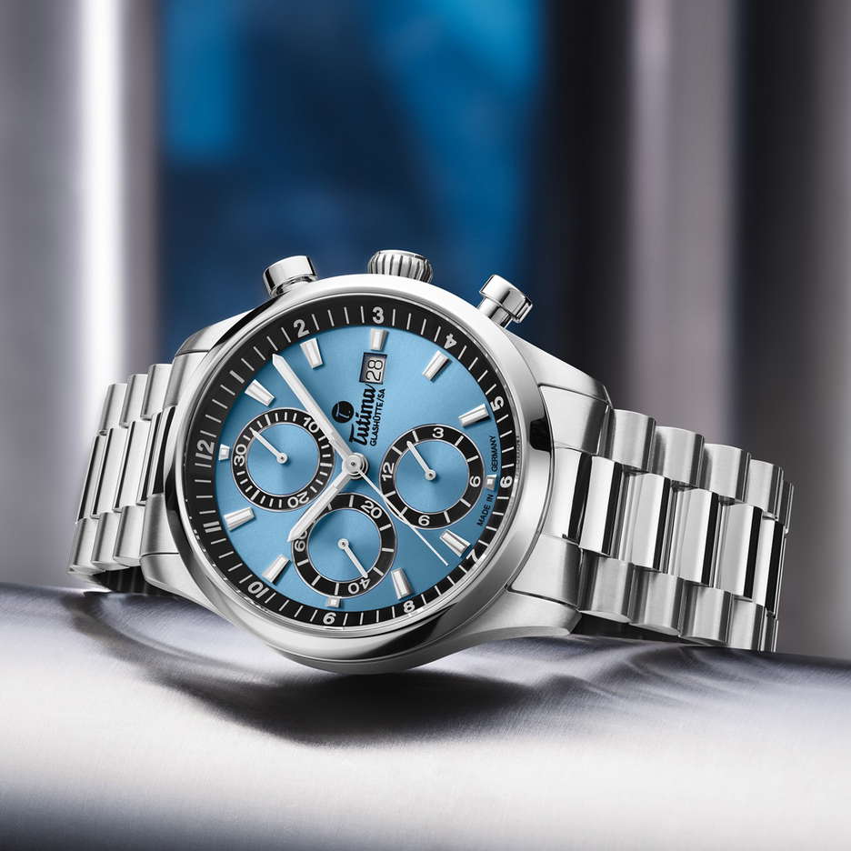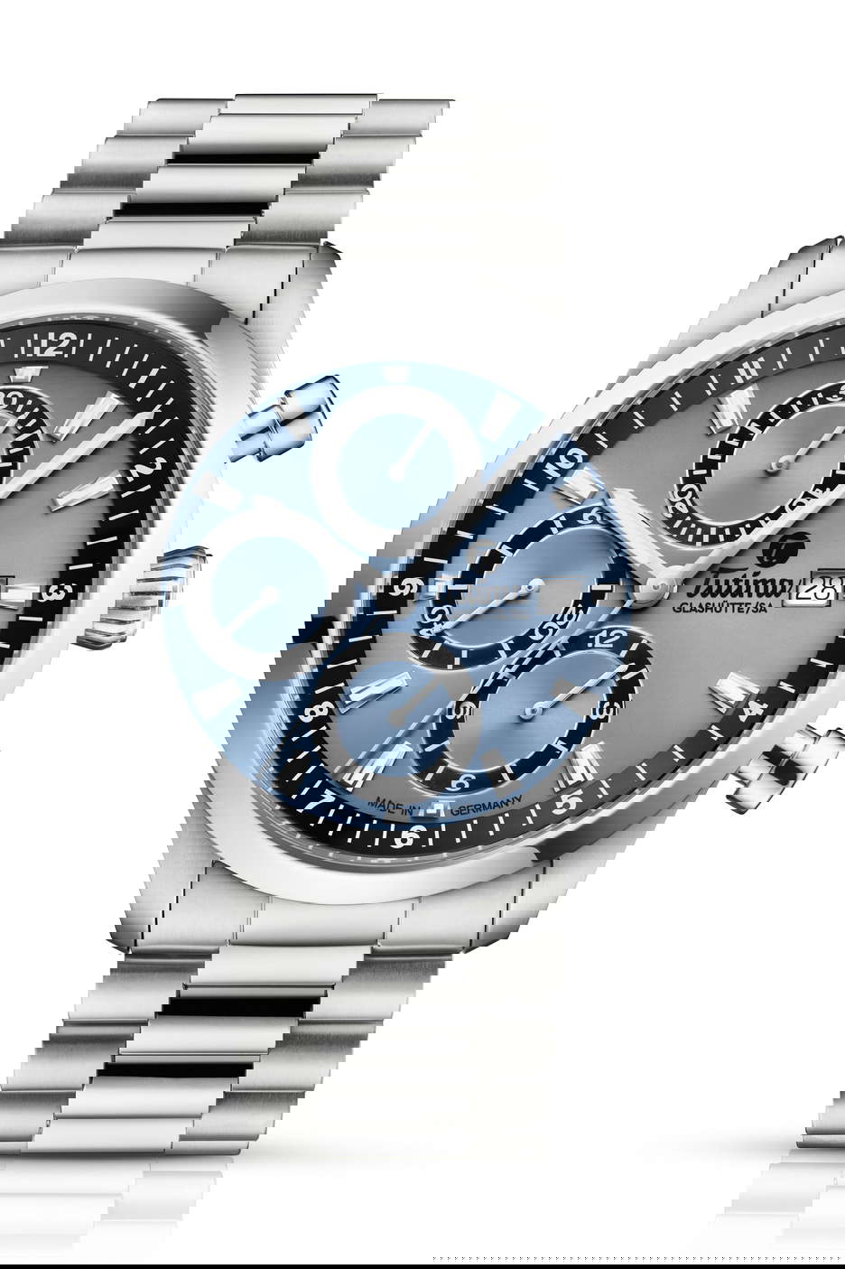 The Sky Chronograph T5 from Tutima Glashütte is a watch that’s perfectly suited for everyday wear but with a touch of something special. These latest models, available in sleek Airy Blue or warm Copper dials, bring a sporty elegance to Tutima’s Sky collection. At the heart of this watch is a Grade 5 titanium 41 mm case, which is 40% lighter than steel and built to last. It’s scratch-resistant, skin-friendly, and can withstand corrosion, saltwater, and even acids. Tutima has been working with titanium for decades, mastering the art of making durable, lightweight timepieces. The case, featuring a screw-down crown and a fully threaded back, is paired with an ultra-light titanium bracelet that sits comfortably on your wrist, featuring a mix of polished and brushed surfaces. The titanium’s matte grey shimmer really stands out, and the whole case is pressure-tested to 10 atmospheres for added peace of mind. On the dial, you’ll find subdials tracking seconds, minutes, and hours, framed in black for a sharp contrast against the bright, Super-LumiNova-coated hands and indices. Whether you choose the Airy Blue or Copper dial, the sunburst finish plays beautifully with light, adding an extra layer of sophistication. A tough, 2.2-mm thick sapphire crystal protects the face. Inside, the Tutima Caliber 310 movement ensures precise, reliable timekeeping. You can even catch a glimpse of it through the sapphire crystal case back, where the rotor, with Tutima’s gold seal, winds automatically with every move of your wrist.
