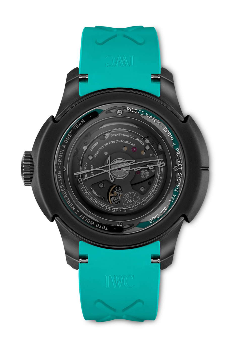 In the high-octane world of Formula One™, precision engineering isn’t just a necessity—it’s a way of life. Every component, every detail, and every millisecond matter. The same philosophy drives the Big Pilot’s Watch Shock Absorber XPL Toto Wolff x Mercedes-AMG PETRONAS Formula One™ Team. At the heart of this 100-piece limited edition is IWC’s groundbreaking SPRIN-g PROTECT® shock absorber system, engineered to defy gravity—literally. Developed by IWC’s experimental engineering division, XPL, this revolutionary system cushions the movement inside the case, absorbing brutal g-forces before they can compromise performance. The key lies in a bulk metallic glass (BMG) spring, designed to evenly distribute stress while offering elasticity beyond that of traditional metals. Encased in Ceratanium®, a proprietary fusion of titanium’s lightweight strength and ceramic’s scratch resistance, the watch is built to thrive under pressure. The matte black dial, punctuated by an intricate grainy texture, reflects the technical sophistication beneath. The floating minute scale and newly designed black triangular hands, lined with Super-LumiNova® in the unmistakable PETRONAS green, add an aura of stealth and speed. Even the shock absorber itself glows in the dark, an illuminated testament to engineering prowess. Turn the watch over, and the IWC-manufactured calibre 32101 reveals itself through a tinted sapphire case back, where Toto Wolff’s signature is etched. The movement—blackened to match the stealthy aesthetic—has a robust 120-hour power reserve, ensuring endurance that mirrors the relentless drive of the Mercedes-AMG PETRONAS F1™ Team. Secured with an integrated green rubber strap—with an additional black rubber strap included—this watch is more than a statement piece. It’s a testament to resilience, performance, and precision, built for those who, like the team it represents, refuse to settle for anything less than the absolute limit.