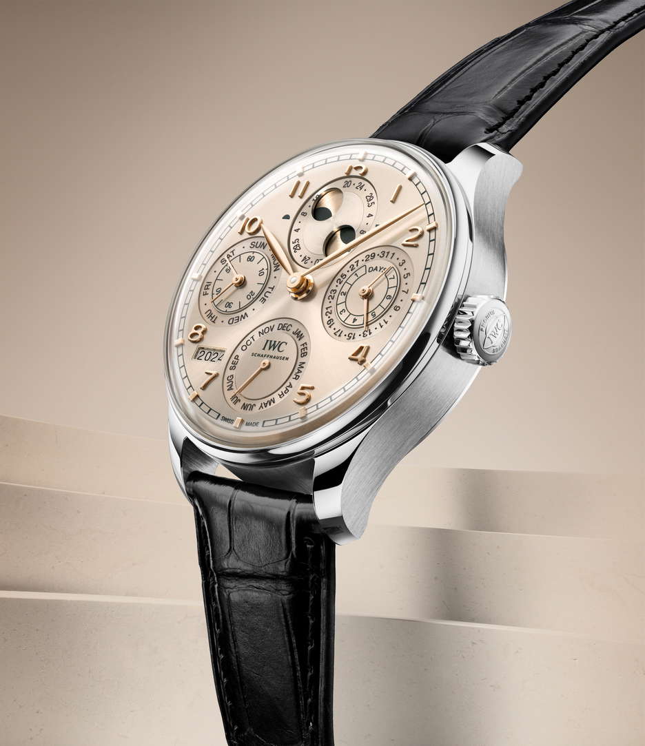 IWC Schaffhausen has launched the re-engineered Portugieser Perpetual Calendar 44 at Watches and Wonders in Geneva, offering four versions with refined designs and enhanced features. The watches come in 18-carat white gold or Armor Gold®, each with distinct dial options. The dials, featuring Horizon Blue, Dune, Obsidian, or Silver Moon, are meticulously finished with 15 layers of lacquer for exceptional depth. The case construction has been revamped for a slimmer profile and incorporates double box-glass sapphire crystals for elegance and lightness. Powered by the IWC-manufactured 52616 calibre with a Pellaton winding system, the watches boast a 7-day power reserve. The Portugieser Perpetual Calendar, introduced in 1985, showcases IWC’s expertise in mechanical calendar complications. Developed by Kurt Klaus, the perpetual calendar offers synchronized displays and ease of use. Its compact design houses 81 parts and is programmed for a four-year cycle, automatically adjusting for leap years. The latest models continue this tradition with improved accuracy and functionality.