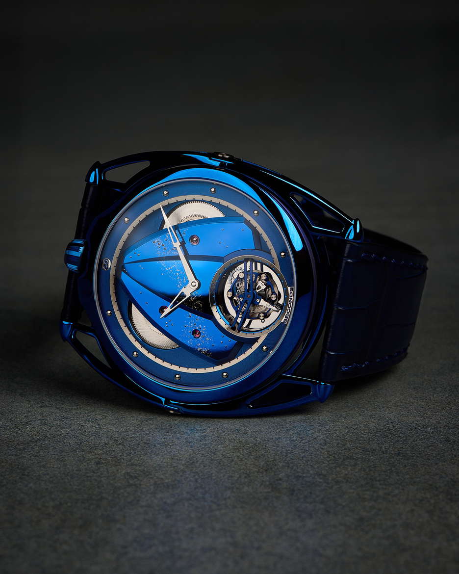 The De Bethune DB28XP Kind of Blue Tourbillon is a limited edition of 20 pieces. This model combines the elegance of the DB28XP with the captivating design of the DB28 Kind of Blue Tourbillon. Denis Flageollet, driven by the challenge of creating an ultra-thin watch, crafted the DB28XP to balance technical precision and aesthetic beauty. The dial of the DB28XP Kind of Blue Tourbillon is made from blued titanium. Its deep blue color, resulting from natural oxidation, makes each piece unique. The dial’s Microlight construction reinterprets traditional guilloché techniques, creating a contemporary effect through the interplay of shadow and light. The De Bethune tourbillon stands out for its lightweight cage (0.18 grams) and rapid rotation, with 63 components, the lightest weighing less than 0.0001 grams. Designed to withstand the kinetic challenges of wrist movements, the tourbillon’s higher frequency and faster rotation enhance its precision. Made from titanium and silicon, it operates at 36,000 vibrations per hour. The tourbillon bridge’s futuristic shape ensures stability, fulfilling its role in modern wristwatches more effectively.