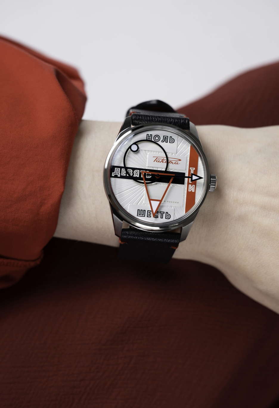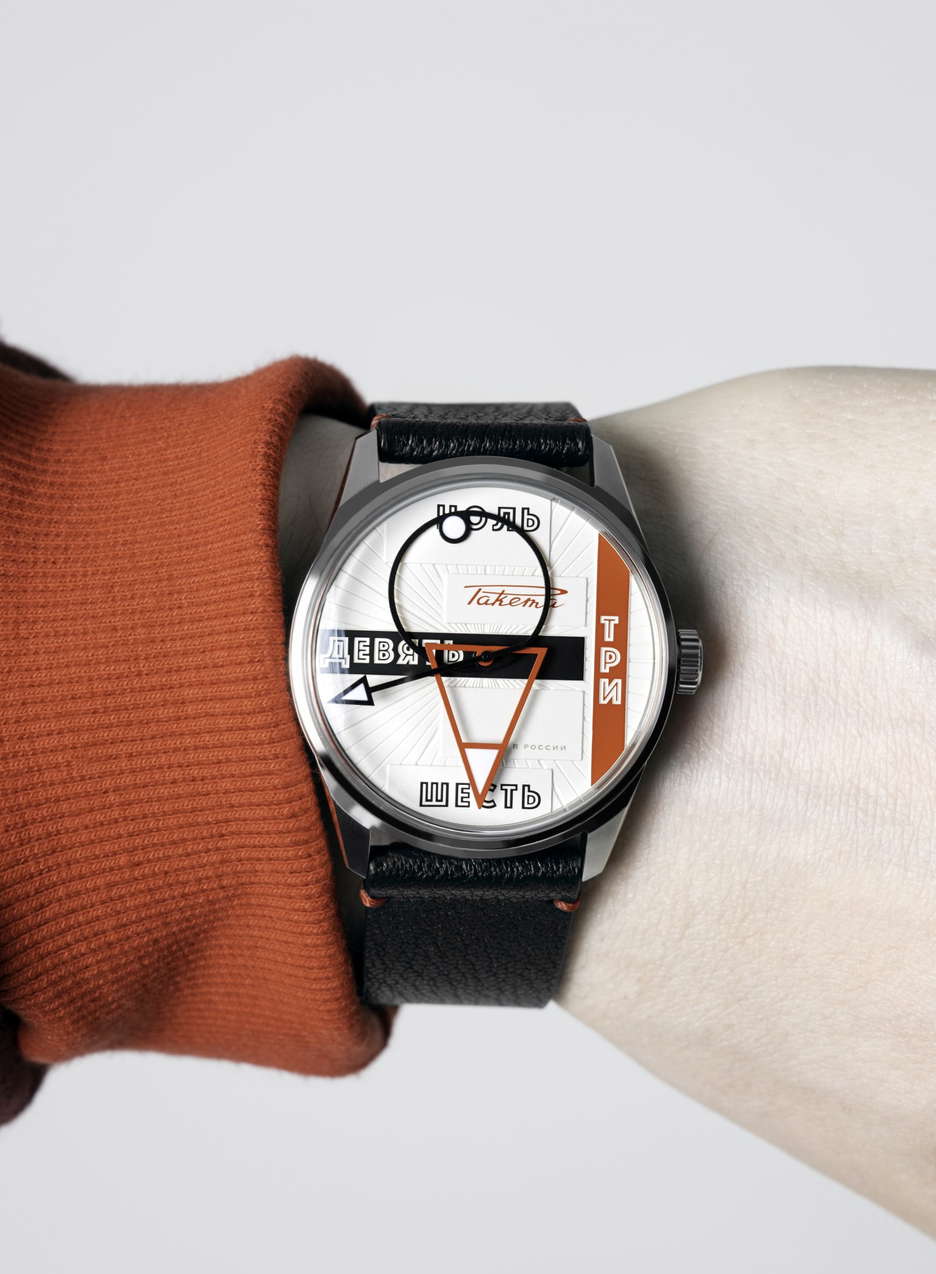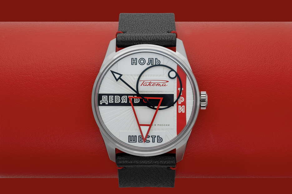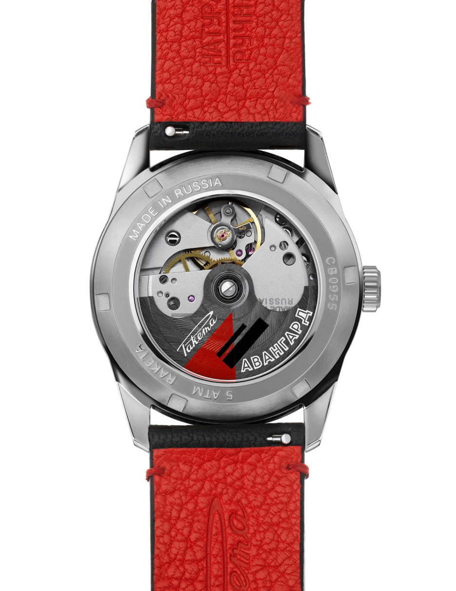 The Raketa “Avant-Garde” 0292 watch represents a significant evolution from its original model, characterized by the iconic red triangular hand. This new version features a multi-layered dial, an intricate case, and enhanced hands with Super-LumiNova glow for visibility in the dark. A key design innovation includes the replacement of traditional numbers with words: zero, three, six, nine. The watch combines three primary avant-garde colors—red, white, and black—with a geometric aesthetic of hands and fonts, creating a unique and ever-changing art composition with each glance. The abstract geometrical shapes on the dial are powered by a Raketa automatic movement, crafted in St. Petersburg. The transparent case back allows one to admire the beauty and harmony of the movement in action, reinforcing the concept of “art in motion” by offering endless interpretations and meanings with every view.