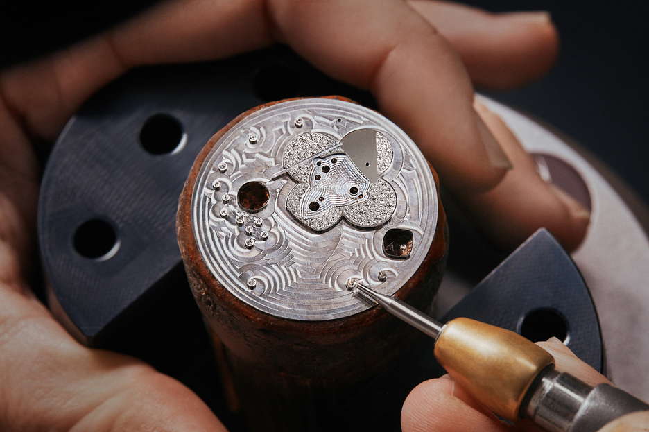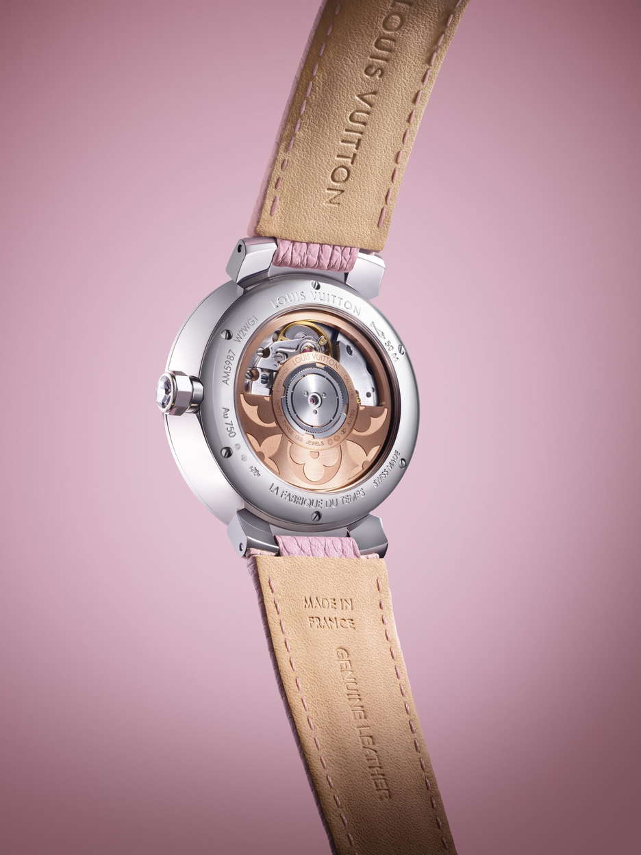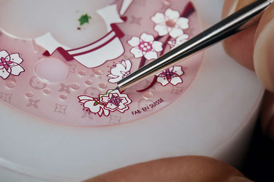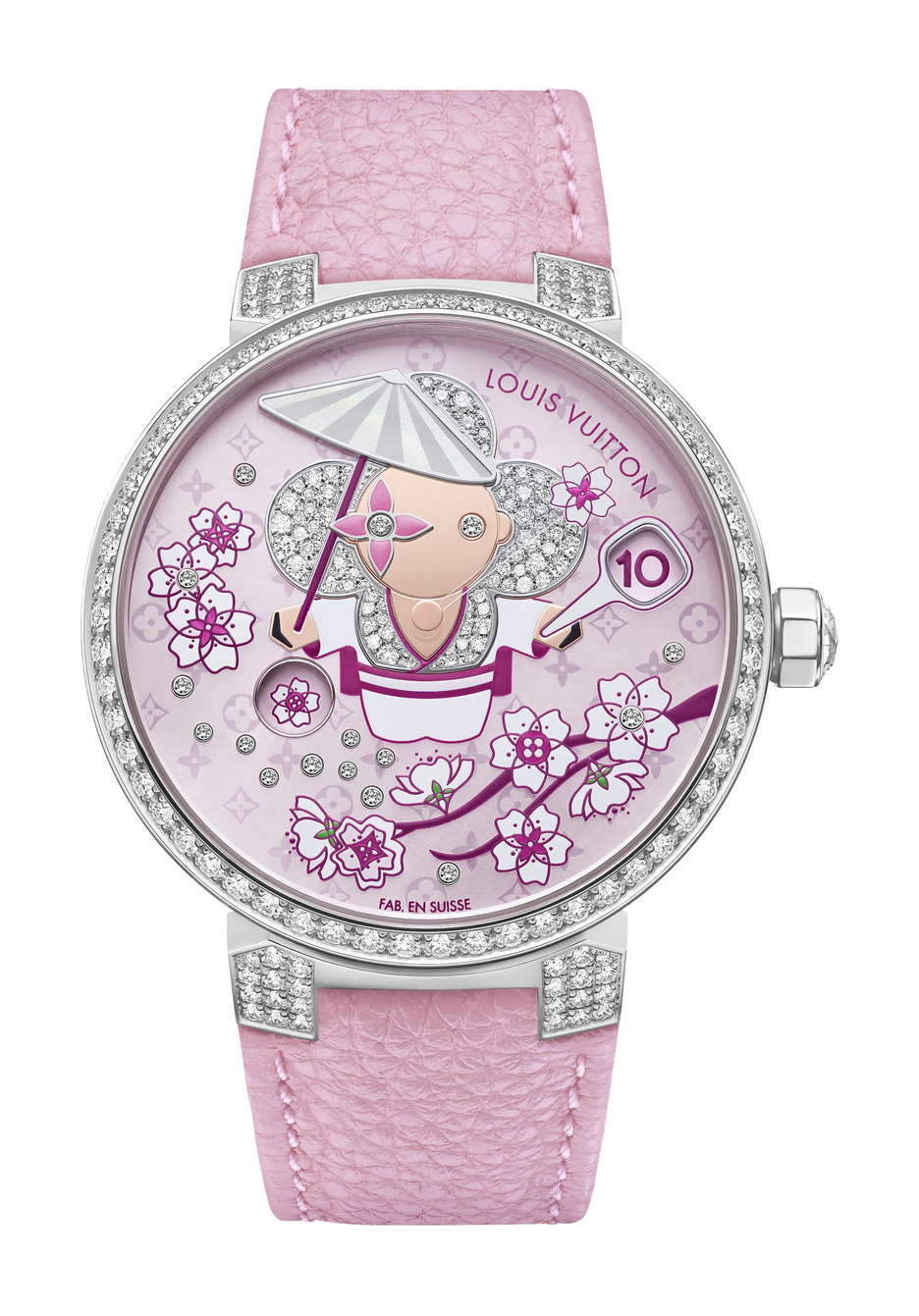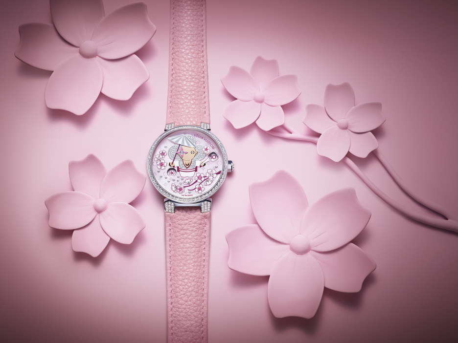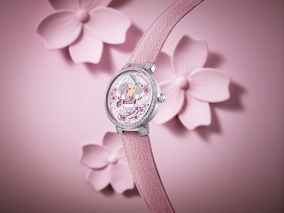 Louis Vuitton introduces the Tambour Slim Vivienne Jumping Hours Sakura, featuring the mischievous Vivienne amidst Japan’s cherry blossoms. Crafted with meticulous detail, the pastel palette and intricate floral motifs reflect the elegance of these fleeting flowers. The dial, adorned with iridescent Monogram flowers and delicate cherry blossom branches, showcases the Maison’s expertise in the “Holomonogram” technique. Vivienne, dressed in a kimono, alternates between showing the time and blossoms, while a transparent hand tipped with a cherry blossom indicates minutes. Housed in a white gold case set with diamonds, this timepiece combines sophistication with playful charm, epitomizing Louis Vuitton’s fusion of artistic craftsmanship and watchmaking excellence.