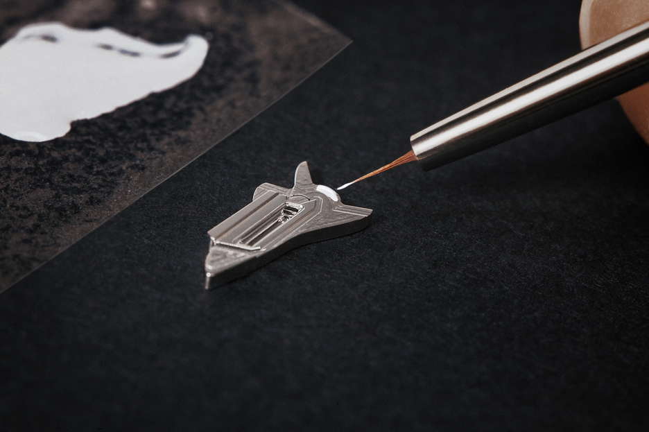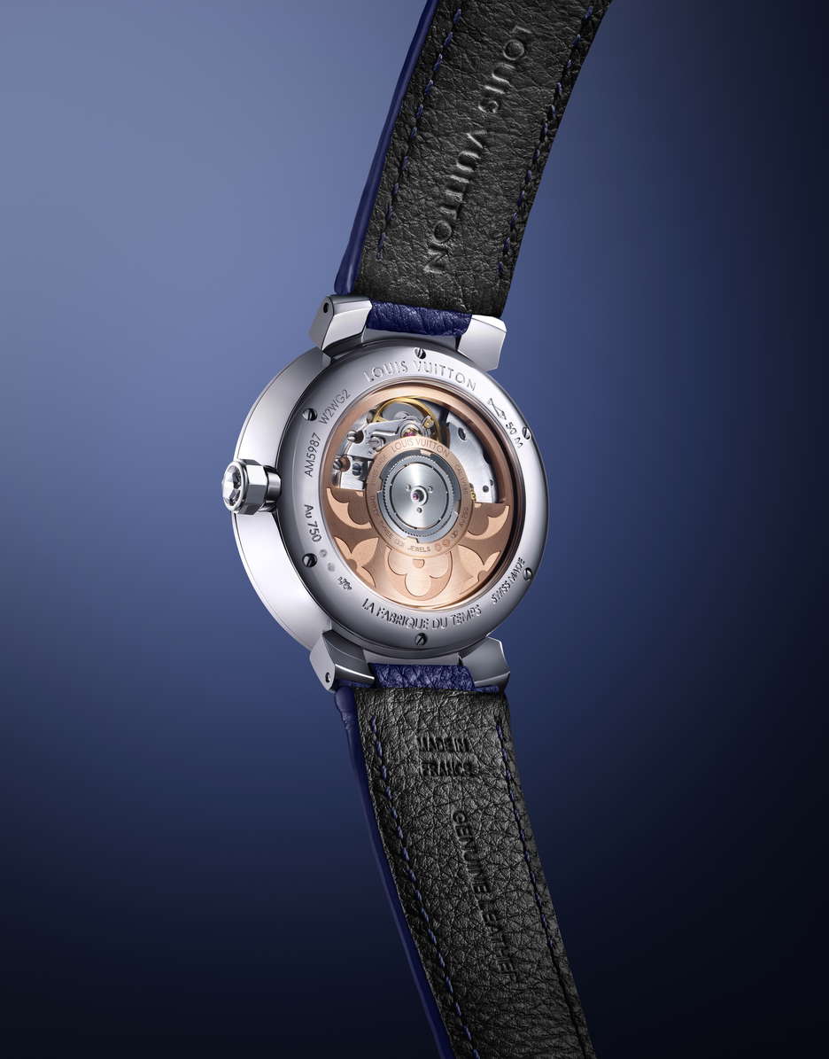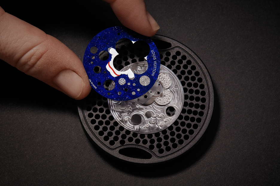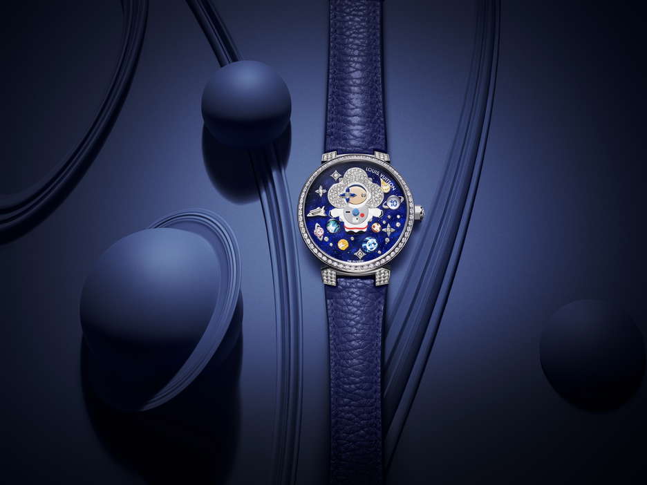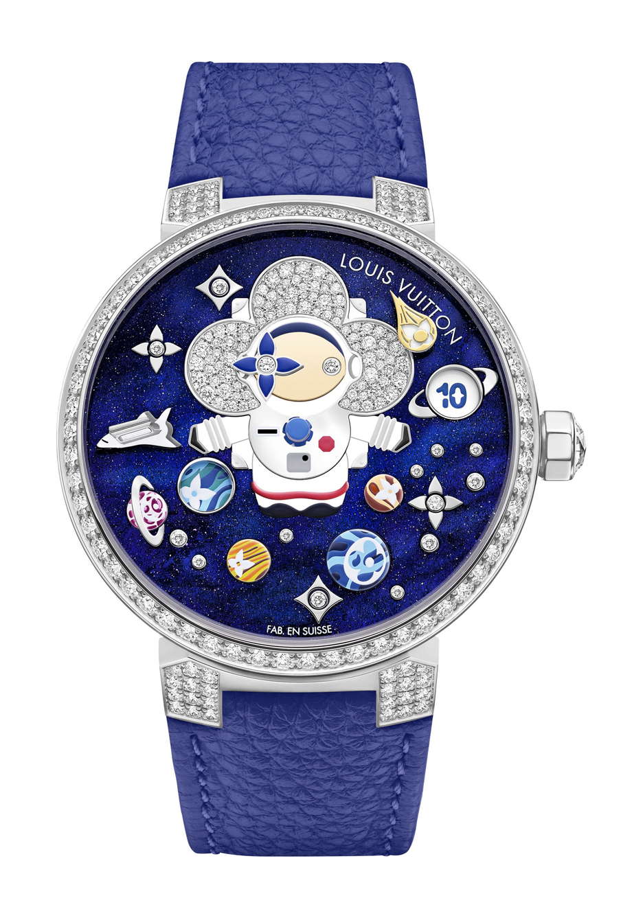 Embark on an extraordinary journey with the Tambour Slim Vivienne Jumping Hours Astronaut, where Vivienne explores the outer reaches of space. Set against a mesmerizing dial combining blue mother-of-pearl and aventurine, Vivienne dons an astronaut suit amidst a diamond constellation of Monogram flowers, rockets, and planets. The minute hand takes the shape of a comet orbiting the dial, adding to the celestial allure. Encased in white gold case with diamonds, this timepiece boasts an innovative mechanical jumping hour movement developed entirely by La Fabrique du Temps Louis Vuitton. With its unique design and impeccable craftsmanship, the Astronaut edition exemplifies Louis Vuitton’s mastery of both artistic crafts and High Watchmaking.