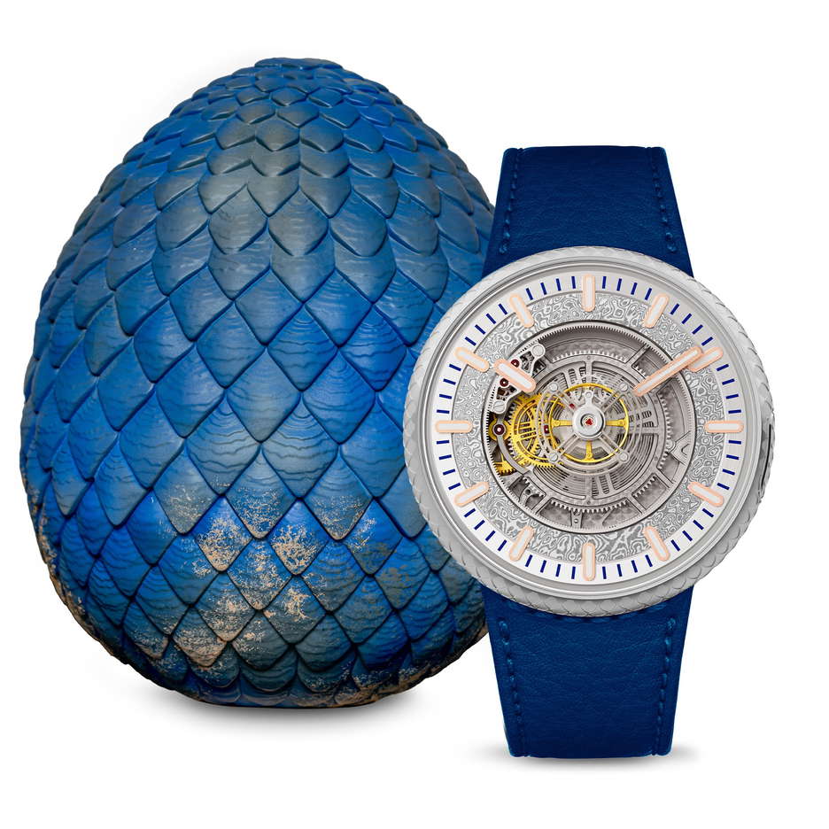 Kross Studio, renowned for merging fantasy with high-end watchmaking, has launched six new Collector Sets inspired by the dragons of HBO’s “House of the Dragon.” Coinciding with the premiere of the show’s second season on June 16, these sets offer collectors a chance to delve into the world of Westeros with exquisite timepieces and dragon egg sculptures. Each set celebrates a specific dragon from the “Game of Thrones” series, featuring a central floating tourbillon watch designed by Kross Studio’s founder Marco Tedeschi. The watch, with its 45mm grade 5 titanium case and intricate movement, is suspended beneath a sapphire crystal dome. Complementing the watch, a resin dragon egg sculpture, hand-painted by the French workshop Leblon Delienne, serves as a nest for the timepiece, adding a fantastical element to the collection. The innovative KS 7’005 movement within the watch is a manually wound floating central tourbillon and features a peripheral hour display mechanism. The movement, with a 120-hour power reserve, features concentric and coaxial functions. The watch’s design integrates elements of the fantasy series, with a Damasteel® dial reminiscent of Valyrian steel and a titanium case engraved with dragon scales and the Targaryen House sigil. The dragon egg sculpture, designed by Marco Tedeschi and produced in collaboration with Leblon Delienne, is made using 3D scans of TV show props. Each unique resin egg, airbrushed and hand-painted, serves as a functional stand for the tourbillon or any other timepiece, reflecting the power and loyalty symbolized by the dragons in the Targaryen legacy.