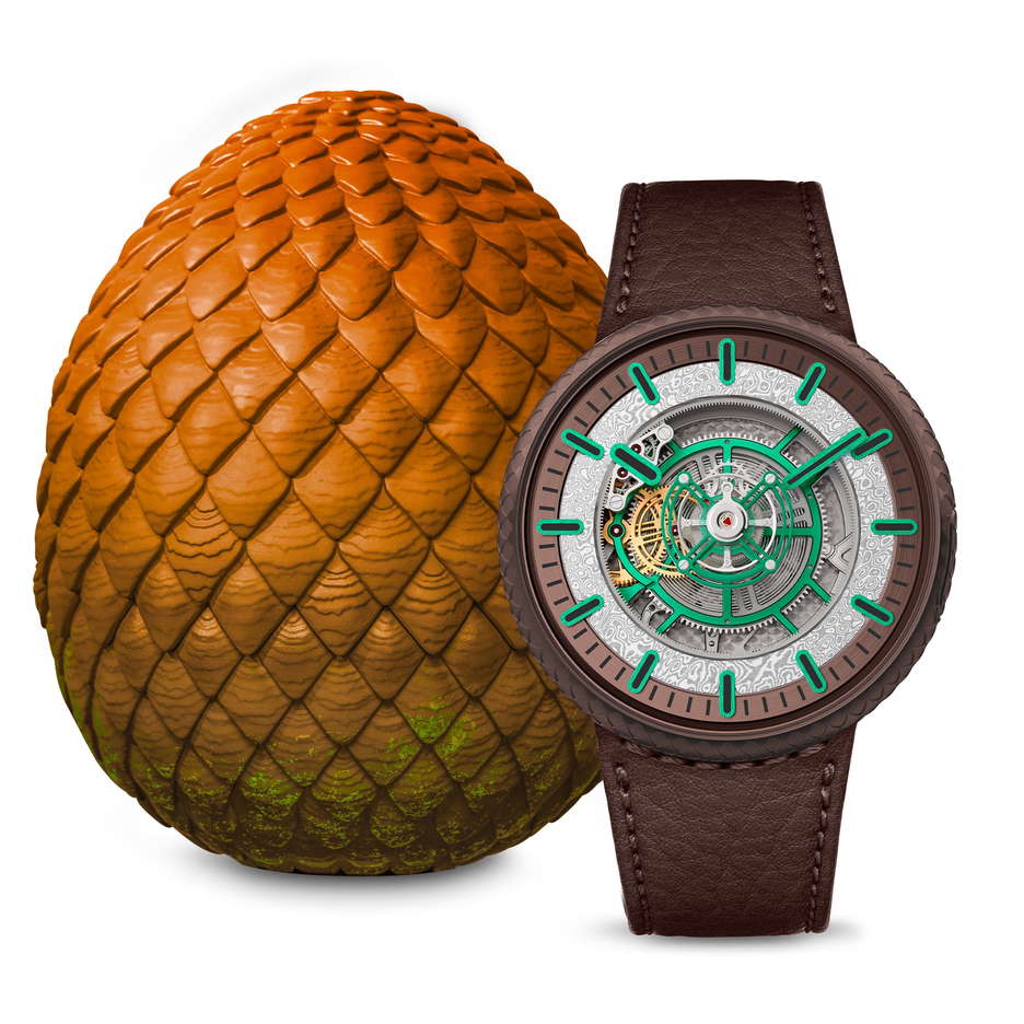 Kross Studio, renowned for merging fantasy with high-end watchmaking, has launched six new Collector Sets inspired by the dragons of HBO’s “House of the Dragon.” Coinciding with the premiere of the show’s second season on June 16, these sets offer collectors a chance to delve into the world of Westeros with exquisite timepieces and dragon egg sculptures. Each set celebrates a specific dragon from the “Game of Thrones” series, featuring a central floating tourbillon watch designed by Kross Studio’s founder Marco Tedeschi. The watch, with its 45mm grade 5 titanium case and intricate movement, is suspended beneath a sapphire crystal dome. Complementing the watch, a resin dragon egg sculpture, hand-painted by the French workshop Leblon Delienne, serves as a nest for the timepiece, adding a fantastical element to the collection. The innovative KS 7’005 movement within the watch is a manually wound floating central tourbillon and features a peripheral hour display mechanism. The movement, with a 120-hour power reserve, features concentric and coaxial functions. The watch’s design integrates elements of the fantasy series, with a Damasteel® dial reminiscent of Valyrian steel and a titanium case engraved with dragon scales and the Targaryen House sigil. The dragon egg sculpture, designed by Marco Tedeschi and produced in collaboration with Leblon Delienne, is made using 3D scans of TV show props. Each unique resin egg, airbrushed and hand-painted, serves as a functional stand for the tourbillon or any other timepiece, reflecting the power and loyalty symbolized by the dragons in the Targaryen legacy.