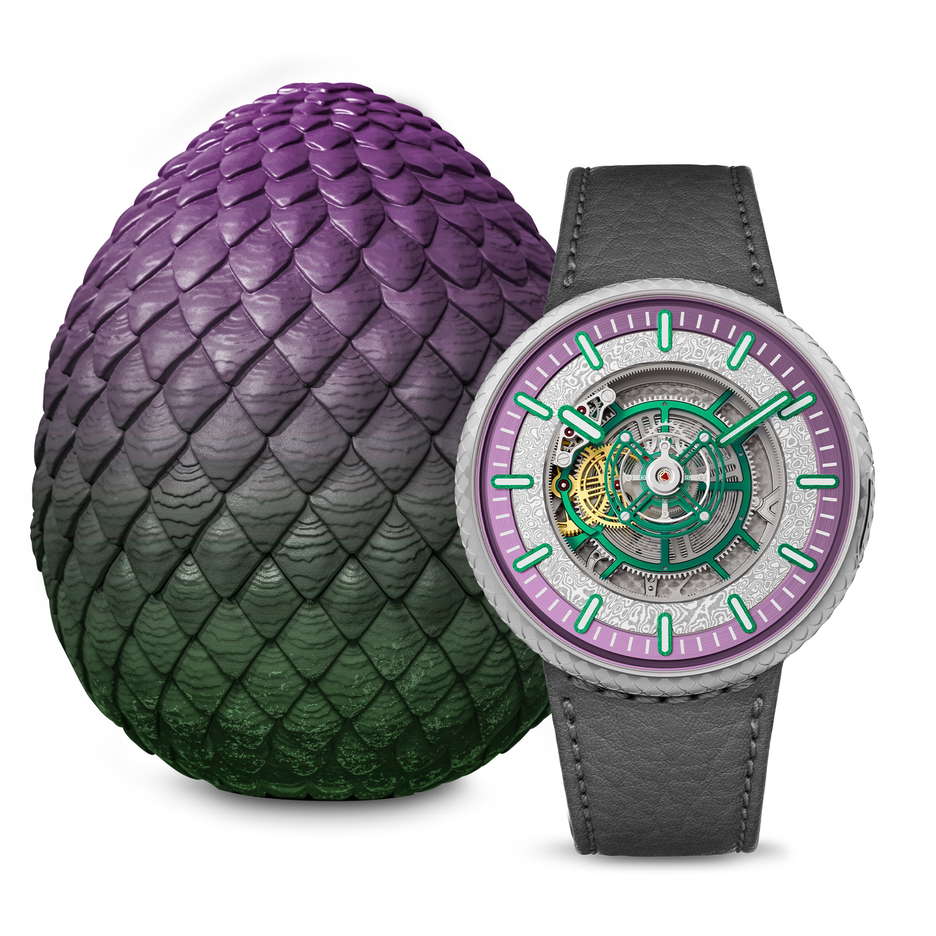 Kross Studio, renowned for merging fantasy with high-end watchmaking, has launched six new Collector Sets inspired by the dragons of HBO’s “House of the Dragon.” Coinciding with the premiere of the show’s second season on June 16, these sets offer collectors a chance to delve into the world of Westeros with exquisite timepieces and dragon egg sculptures. Each set celebrates a specific dragon from the “Game of Thrones” series, featuring a central floating tourbillon watch designed by Kross Studio’s founder Marco Tedeschi. The watch, with its 45mm grade 5 titanium case and intricate movement, is suspended beneath a sapphire crystal dome. Complementing the watch, a resin dragon egg sculpture, hand-painted by the French workshop Leblon Delienne, serves as a nest for the timepiece, adding a fantastical element to the collection. The innovative KS 7’005 movement within the watch is a manually wound floating central tourbillon and features a peripheral hour display mechanism. The movement, with a 120-hour power reserve, features concentric and coaxial functions. The watch’s design integrates elements of the fantasy series, with a Damasteel® dial reminiscent of Valyrian steel and a titanium case engraved with dragon scales and the Targaryen House sigil. The dragon egg sculpture, designed by Marco Tedeschi and produced in collaboration with Leblon Delienne, is made using 3D scans of TV show props. Each unique resin egg, airbrushed and hand-painted, serves as a functional stand for the tourbillon or any other timepiece, reflecting the power and loyalty symbolized by the dragons in the Targaryen legacy.