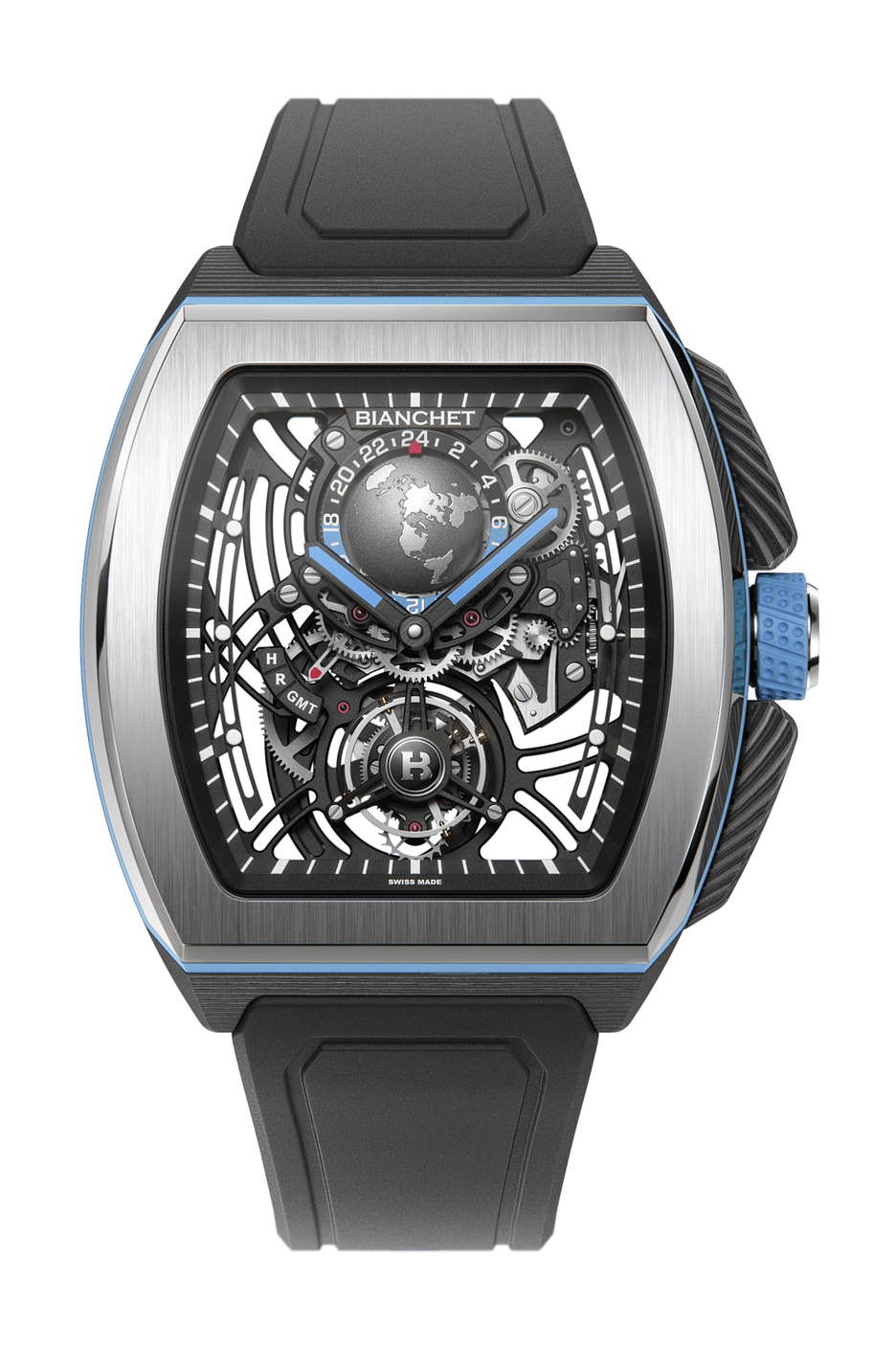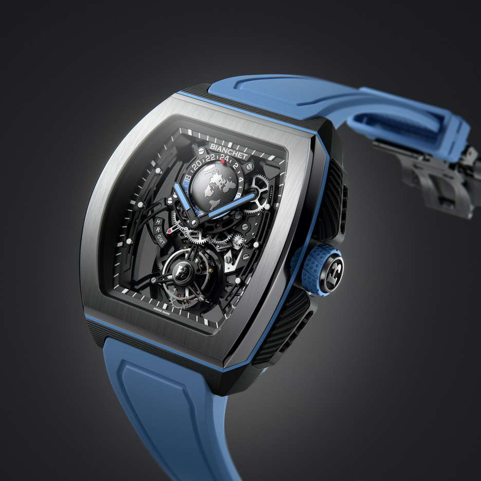 The Bianchet Flying Tourbillon Sport GMT is designed for the discerning globetrotter. A watch that seamlessly integrates classic design elements with cutting-edge performance. The watch is powered by the titanium flying tourbillon movement, manufactured and hand-assembled in Switzerland by Bianchet. Designed to withstand the rigors of an active lifestyle, the Flying Tourbillon Sport GMT boasts remarkable lightness, ergonomic comfort, and exceptional durability, withstanding up to 5000Gs of shock and water pressure up to 10 ATM. Featuring dual time zone functionality, it allows wearers to track local and reference time simultaneously. The addition of a 24-hour GMT dial, adorned with a rotating globe synchronized with the hour hand, serves as a visual reminder of the earth’s perpetual motion. The Flying Tourbillon Sport GMT has a barrel-shaped case measuring 43mm in diameter, is hand-finished to perfection, and is waterproof up to 100 meters. Available in three material options, including Titanium-Dust-High-Density Carbon, yellow gold, and titanium, each watch is paired with a vulcanized natural rubber strap and a folding clasp. Bianchet offers a range of customization options, with seven distinct color variations, each paired with two straps (one black and one colorful), allowing wearers to express their individuality and style preferences. Whether embarking on a global adventure or navigating the urban jungle, the Flying Tourbillon Sport GMT is the perfect companion for those who demand both performance and refinement in their timepieces.