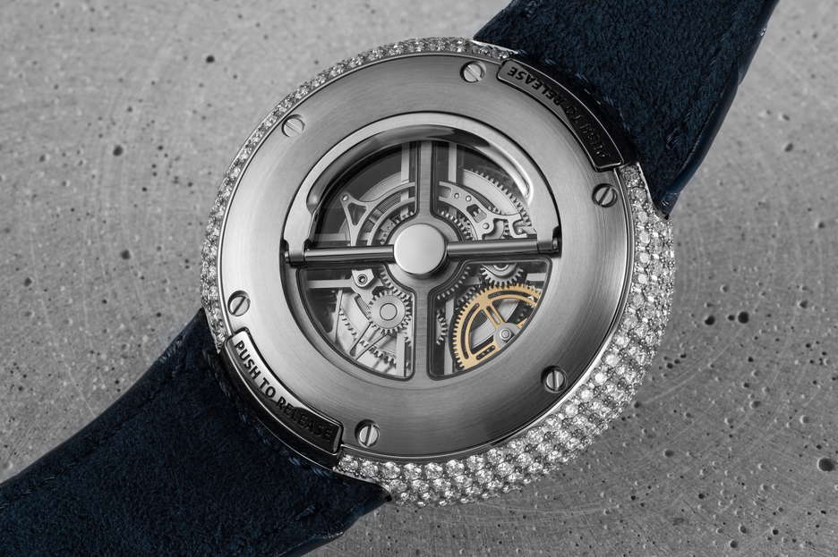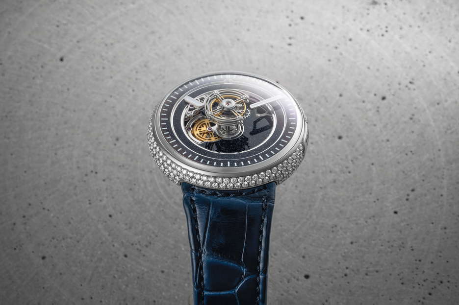 The KS 05 collection marks Kross Studio’s venture into timepieces beyond its entertainment partnerships, showcasing their engineering prowess. The collection features the world’s only central floating tourbillon timepieces, boasting the caliber KS 7’005 movement with 220 components, 27 jewels, and a 120-hour power reserve. Made from grade 5 titanium, the ultra-lightweight tourbillon cage weighs only 0.488g. The time display mechanism orbits around the tourbillon, driven by a planetary system mounted on ceramic ball bearings. The Grade 5 titanium case is seamlessly designed, with a hidden D-ring crown and a one-click interchangeable strap system. The domed crystal provides a panoramic view of the movement with anti-reflective, anti-UV, and anti-static treatments. The collection offers various dial variations, such as aventurine glass or natural stones, each serving to enhance legibility and showcase the tourbillon. Available in Grade 5 titanium or a striking version in 18-karat red gold, both offer the option of being set with 281 pavé-set diamonds, totaling around 5.09 carats. Each variation is limited to 10 numbered pieces, ensuring every watch becomes a unique and exclusive masterpiece.