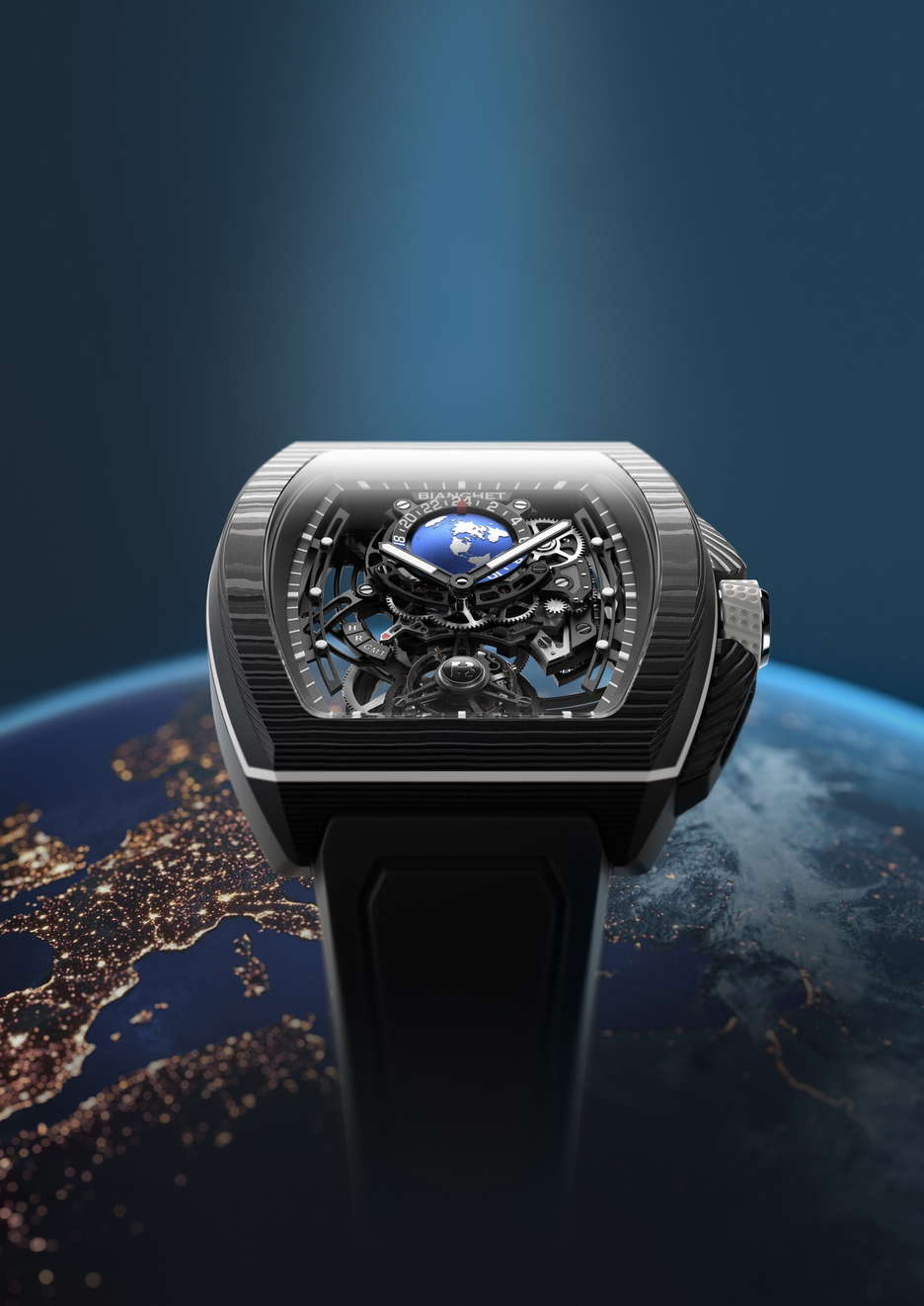 The Bianchet Flying Tourbillon Sport GMT is designed for the discerning globetrotter. A watch that seamlessly integrates classic design elements with cutting-edge performance. The watch is powered by the titanium flying tourbillon movement, manufactured and hand-assembled in Switzerland by Bianchet. Designed to withstand the rigors of an active lifestyle, the Flying Tourbillon Sport GMT boasts remarkable lightness, ergonomic comfort, and exceptional durability, withstanding up to 5000Gs of shock and water pressure up to 10 ATM. Featuring dual time zone functionality, it allows wearers to track local and reference time simultaneously. The addition of a 24-hour GMT dial, adorned with a rotating globe synchronized with the hour hand, serves as a visual reminder of the earth’s perpetual motion. The Flying Tourbillon Sport GMT has a barrel-shaped case measuring 43mm in diameter, is hand-finished to perfection, and is waterproof up to 100 meters. Available in three material options, including Titanium-Dust-High-Density Carbon, yellow gold, and titanium, each watch is paired with a vulcanized natural rubber strap and a folding clasp. Bianchet offers a range of customization options, with seven distinct color variations, each paired with two straps (one black and one colorful), allowing wearers to express their individuality and style preferences. Whether embarking on a global adventure or navigating the urban jungle, the Flying Tourbillon Sport GMT is the perfect companion for those who demand both performance and refinement in their timepieces.