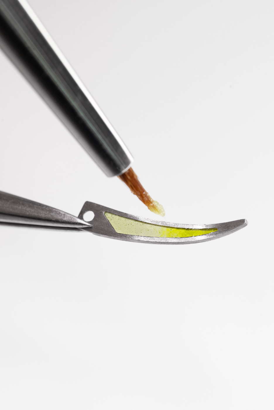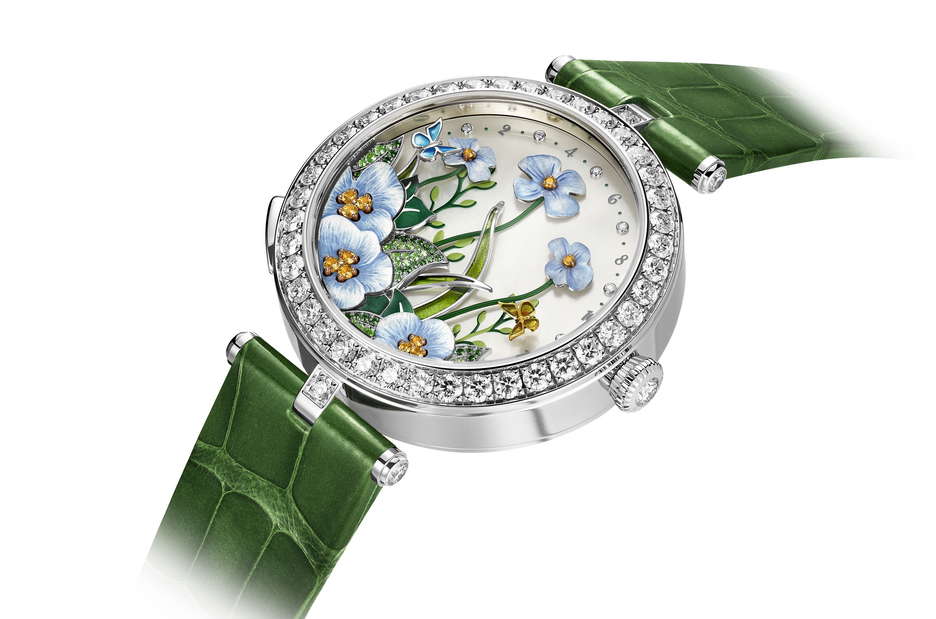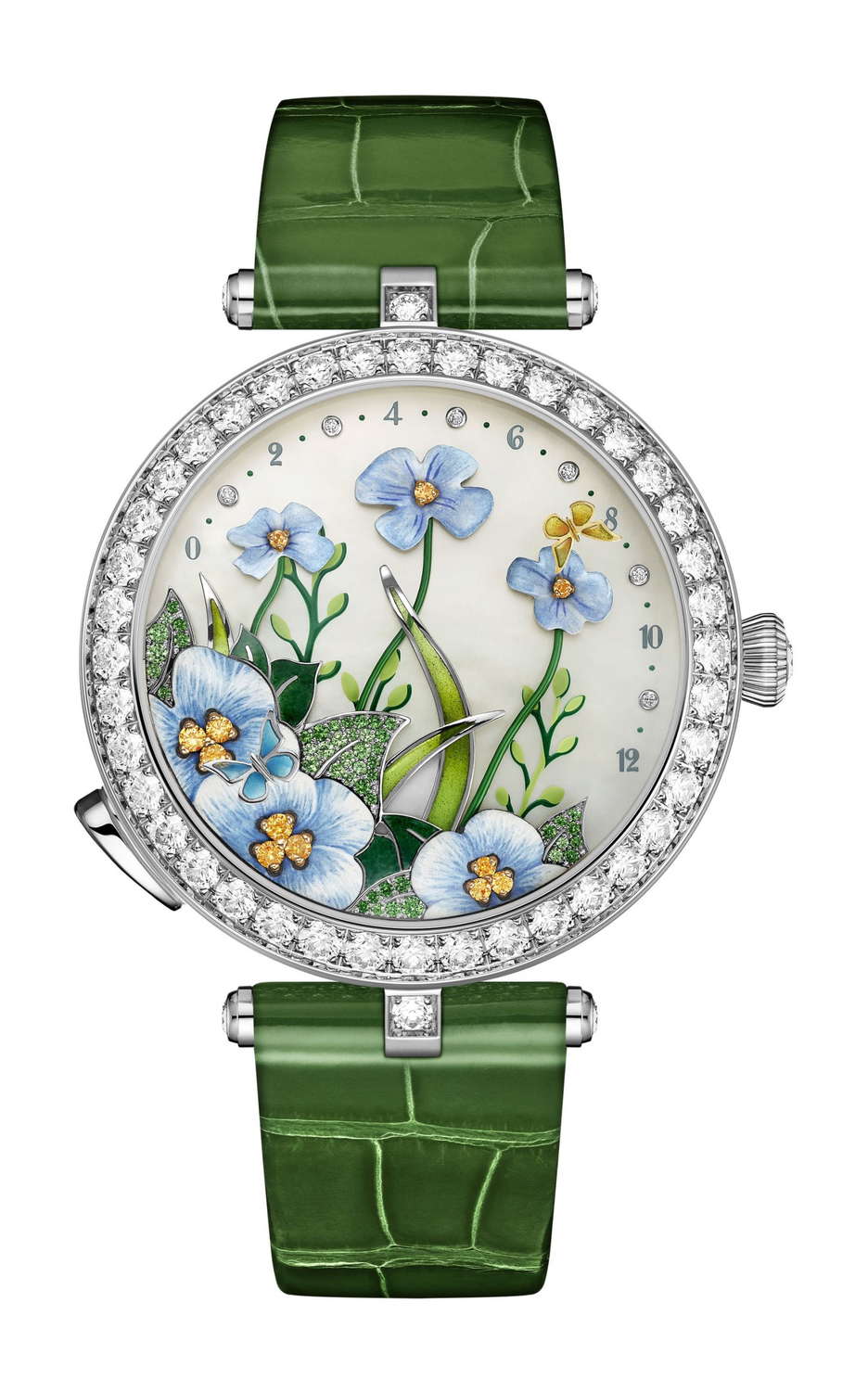 The Van Cleef & Arpels Lady Arpels Brise d’Été watch is a tribute to nature, reflecting the freshness of a summer morning. It features white- and yellow-gold butterflies in plique-à-jour enamel that animate on demand, bringing life to flowers and their stems. The flowers, crafted in vallonné enamel with azure hues and spessartite garnet pistils, contrast against a mother-of-pearl dial. This scene merges foreground and background with champlevé enamel leaves and tsavorite garnet blades of grass, enhanced by sculptural miniature painting. The watch celebrates the Poetry of Time, using age-old miniature painting techniques requiring precision and artistic skill. The enamel artist applies colors meticulously, each hue requiring specific firing procedures known only to master enamelers.