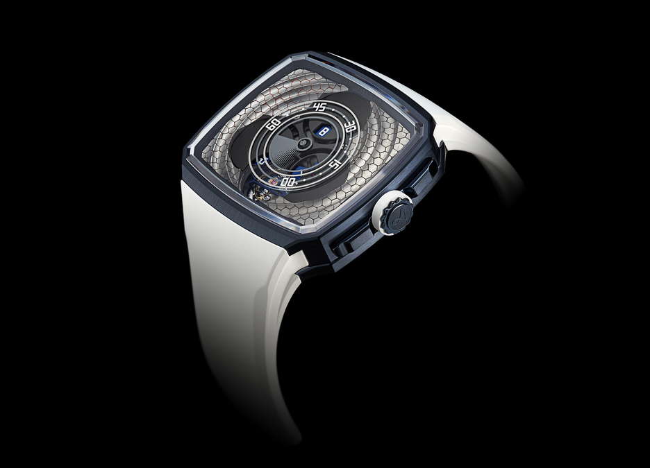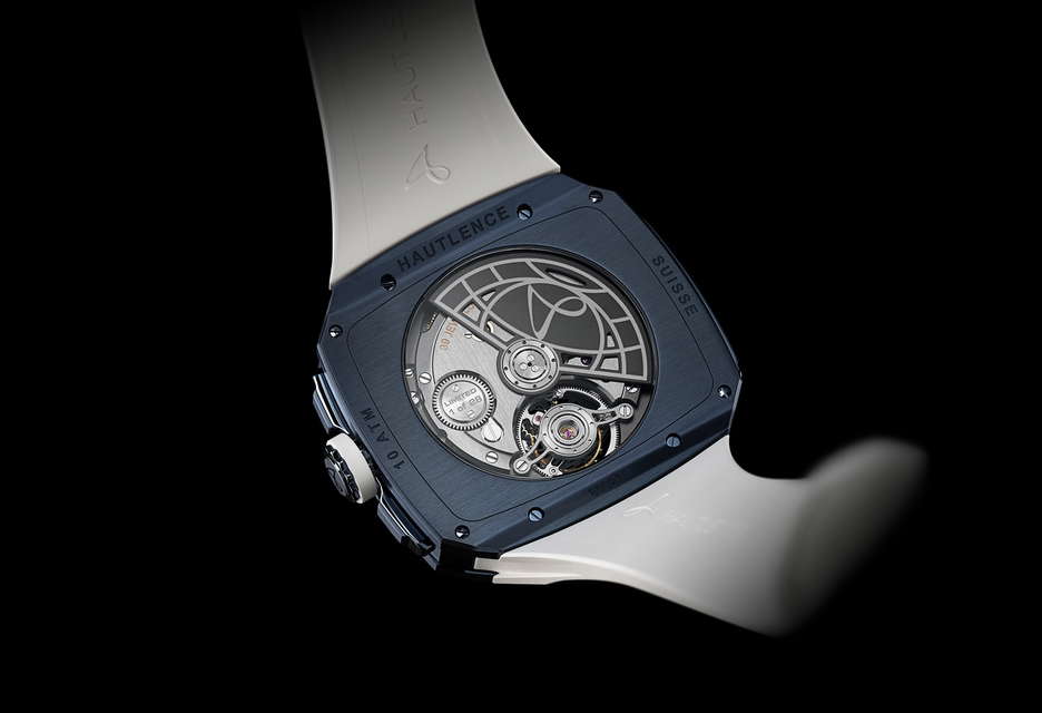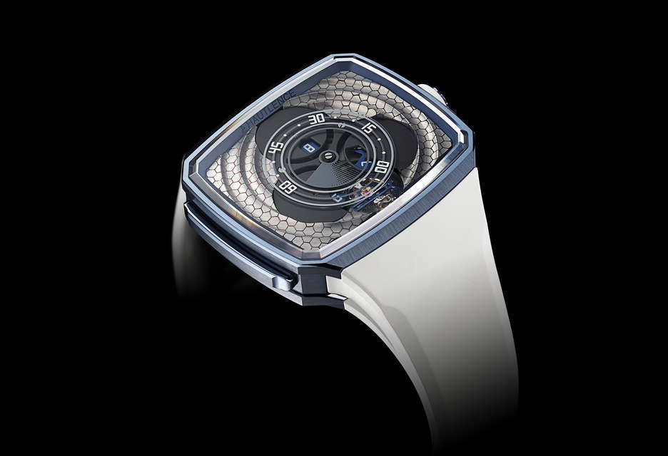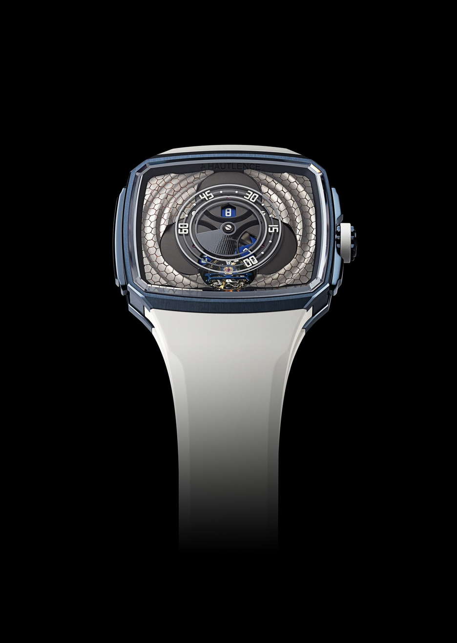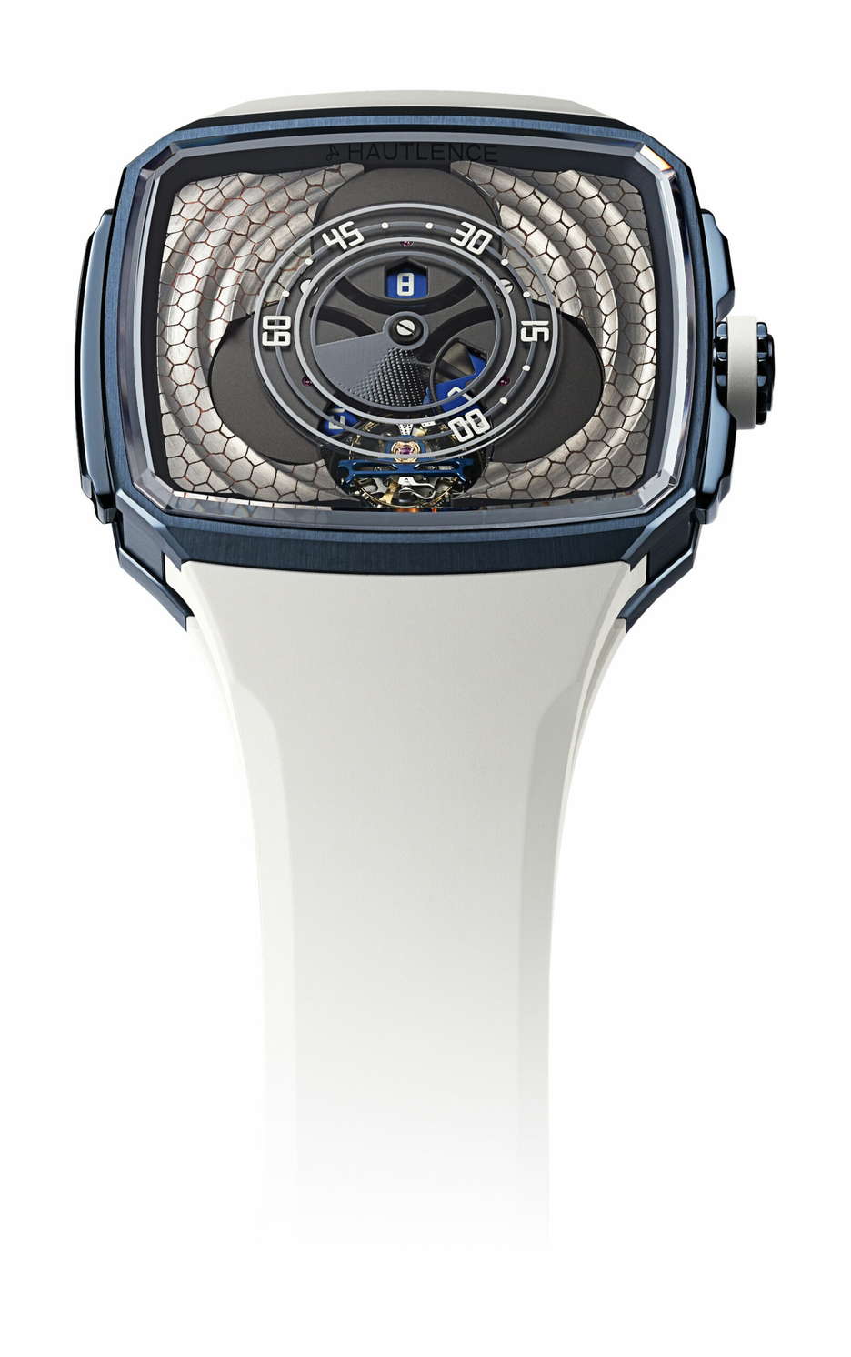 Established in 2004, HAUTLENCE has been a pioneer in unconventional watchmaking. The Vagabonde Tourbillon Series 3 continues this tradition, showcasing a hands-free time display within a TV-shaped case. The time is displayed through three jumping hour satellites and a central minute disk, with minute numerals in Globolight® on transparent sapphire crystal. The HAUTLENCE Vagabonde Tourbillon Series 3 is a testament to avant-garde watchmaking, blending traditional techniques with innovative materials. This timepiece features a unique wandering hours display, enhanced by a flying tourbillon and a sculpted dial made from a superconductor material. The copper-niobium superconductor, typically used in particle accelerators, is crafted into a striking honeycomb pattern by James “Black Badger” Thompson. The dial’s design is further accentuated by a ripple-like pattern, creating a dynamic, three-dimensional effect. The case, water-resistant to 10 ATM, is coated in a deep midnight blue PVD, complemented by a bright white rubber strap and notched crown. The watch is powered by the D30 automatic movement, visible through the sapphire display back. This movement, with a bidirectional pawl winding mechanism, ensures a power reserve of at least 3 days and features a one-minute flying tourbillon with a double hairspring, produced by Precision Engineering AG. The Vagabonde Tourbillon Series 3 not only displays time but also showcases HAUTLENCE’s commitment to artistic and technical mastery in watchmaking.