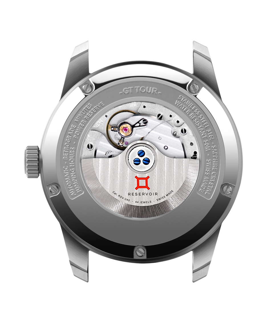 The GT TOUR Blue Edition collection pays homage to the classic era of car racing, embracing its iconic elements. Its matte blue dial and vibrant red minute hand draw inspiration from the striking color contrast often seen on racing car meters, ensuring optimal readability. When adorned with an automotive leather-style perforated blue strap featuring red stitching, the GT TOUR timepiece becomes a tribute to the golden age of auto racing. Driving its precision is the state-of-the-art caliber RSV-240, a proprietary and patented three-complication module seamlessly integrated into a bespoke LJP-G100 base movement. This exceptional combination offers retrograde minute tracking, a jumping hour mechanism, and an impressive 56-hour power reserve. Presented in a distinguished wooden box, this watch also includes an additional NATO strap for added versatility.