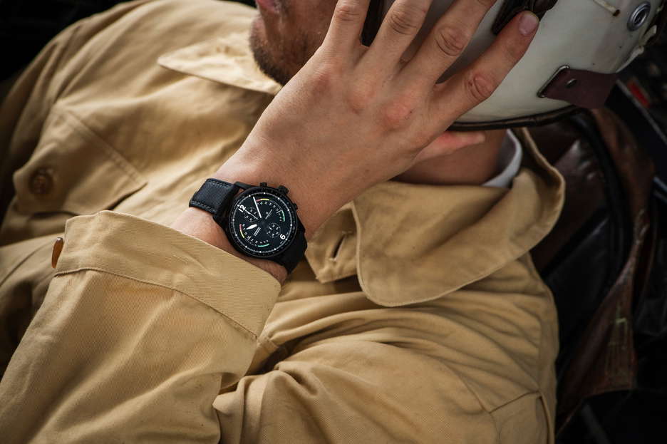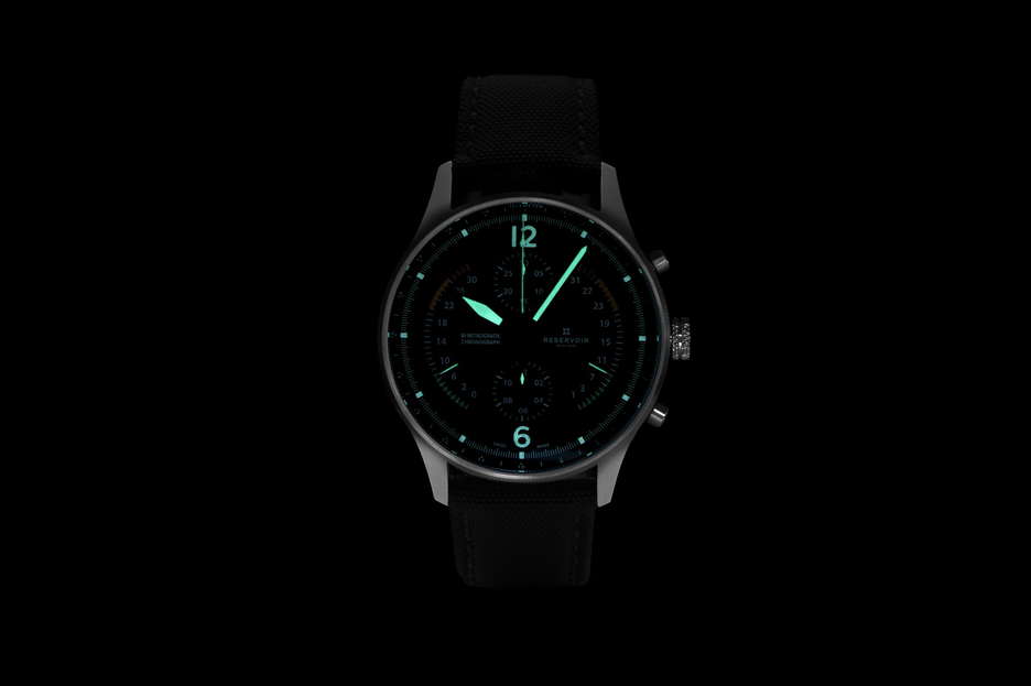 The inaugural aviation-themed Airfight Chronograph in a sleek black casing pays homage to the iconic P-51 Mustang warplane. This timepiece boasts a highly functional dial design that immediately resonates with pilots. It features subtle references to aviation instruments such as the ‘Badin’ airspeed indicator, vertical speed indicator for ascents and descents, and an RPM-measuring tachometer. The bezel includes a telemeter scale, and the watch comes in a black case. This bi-retrograde watch (displaying date and seconds at 120°) introduces RESERVOIR’s inaugural chronograph, with a central second hand, a 30-minute counter at 12 o’clock, and an hour counter at 6 o’clock. Powering this timepiece is the RSV-Bi120 watchmaking caliber, a proprietary bi-retrograde chronograph movement with automatic mechanical winding and a column wheel base (LJP-L1C0). It comes delivered in an elegant wooden box, accompanied by an additional NATO strap for added versatility.