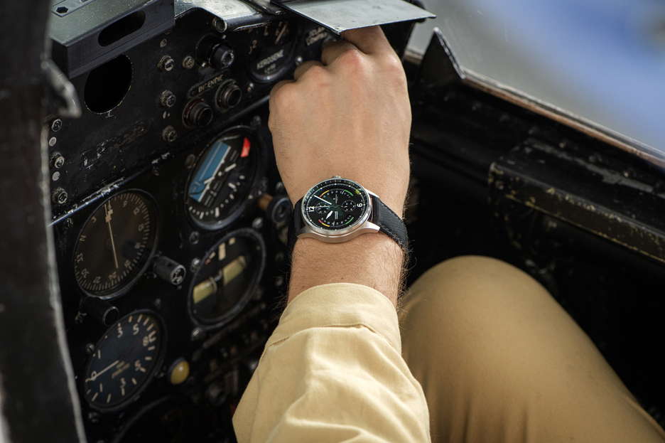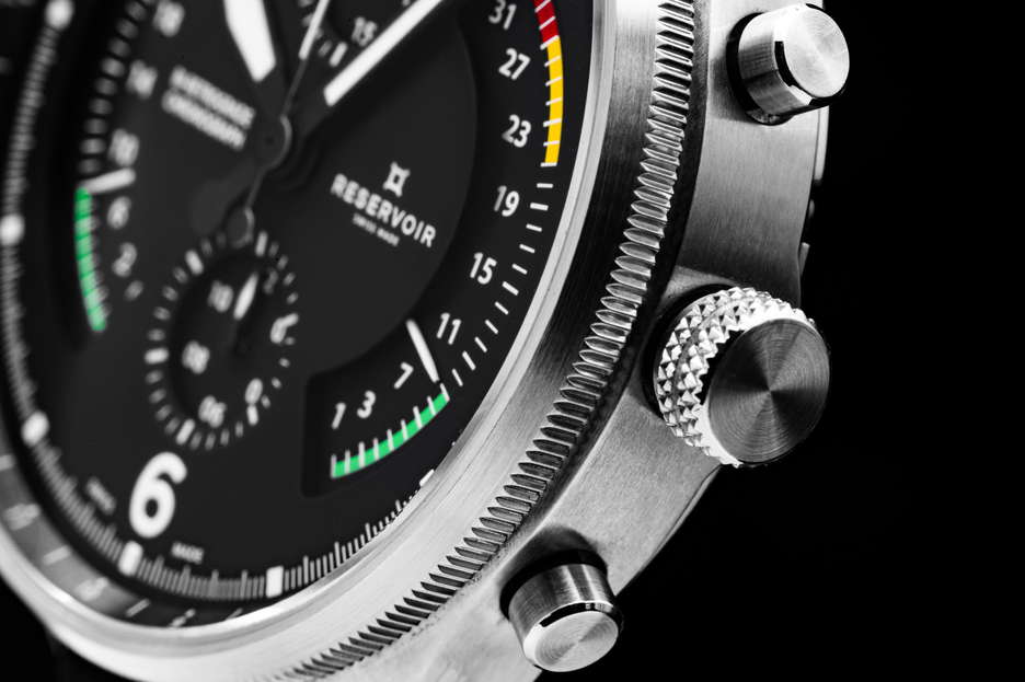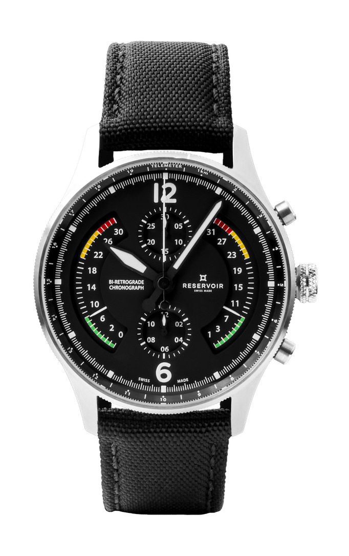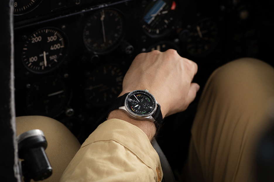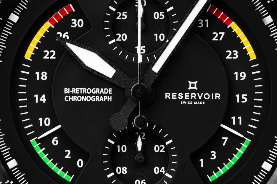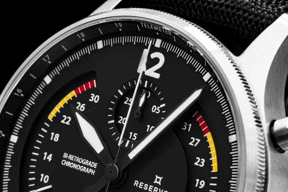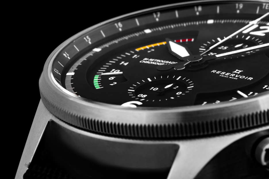 the 2023 aviation-themed innovation: an Airfight Chronograph encased in stainless steel. This marks the debut of a chronograph dedicated to the realm of aviation, celebrating the iconic P-51 Mustang warplane with a utilitarian dial design. Pilots will readily identify familiar elements like the ‘Badin’ airspeed gauge, the vertical speed indicator measuring ascent and descent rates in feet per minute, and the RPM-measuring tachometer. The bezel is adorned with a telemeter scale and is housed in a durable stainless steel case. This bi-retrograde timepiece, displaying both date and seconds at 120 degrees, showcases RESERVOIR’s maiden chronograph offering, featuring a central second hand, a 30-minute counter positioned at 12 o’clock, and an hour counter at 6 o’clock. It is powered by the watchmaking caliber RSV-Bi120, a proprietary bi-retrograde chronograph movement with automatic mechanical winding and a column wheel base (LJP-L1C0). This watch is elegantly presented in a prestigious wooden box, complete with an additional NATO strap for added versatility.